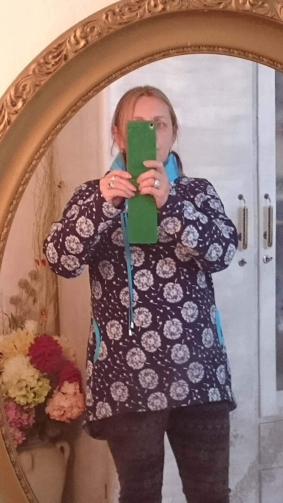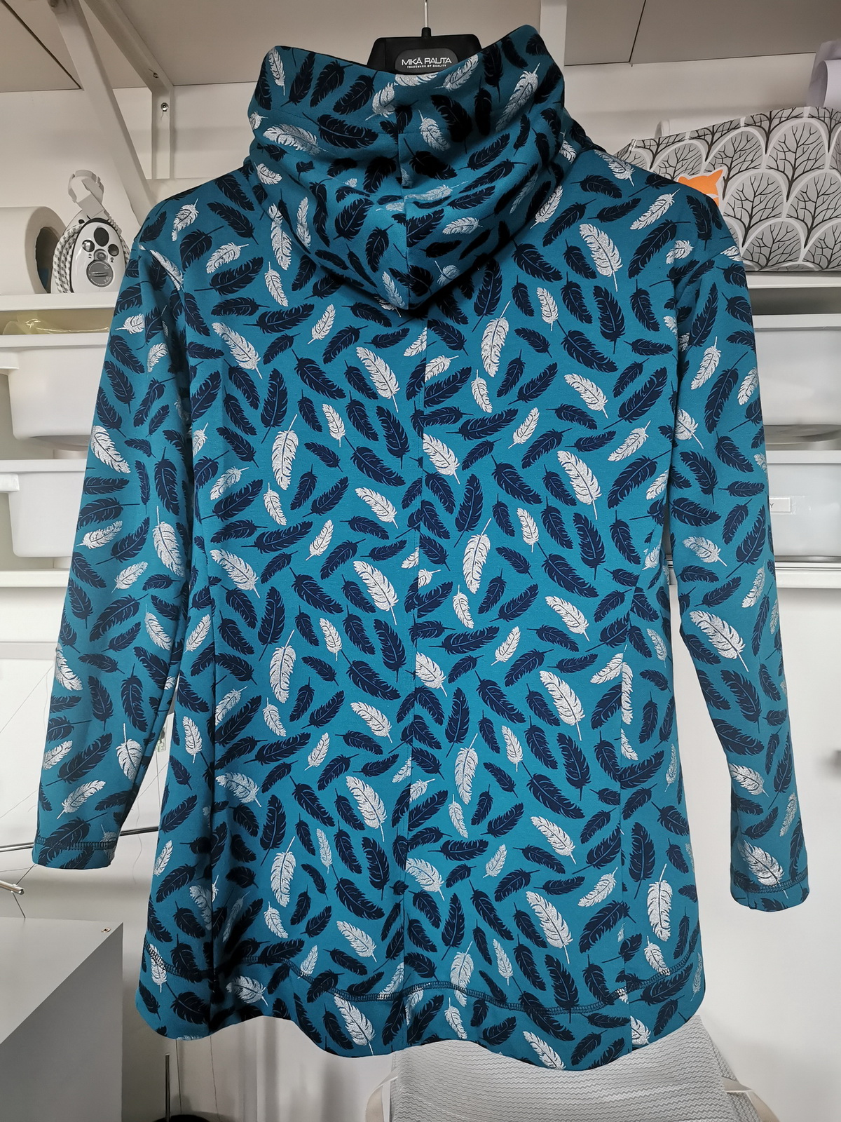 „Přiznávám, že když jsem na tuto mikinu prvně narazila, krom střihu mě zaujala i samotná látka a tak jsem si s požehnání paní Irenky ušila stejnou. Střih je vymazlený, mikča se šila moc hezky. Řekla bych, že je o velikost větší, přesto jsem rukávy i celkovou délku trochu prodlužovala. Na mě je dole až moc sukýnkovitá, příště možná malinko zúžím spodní část a zkrátím ZD - vykukuje pod bundou, ale na jaře bez bundy bude moc fajn!