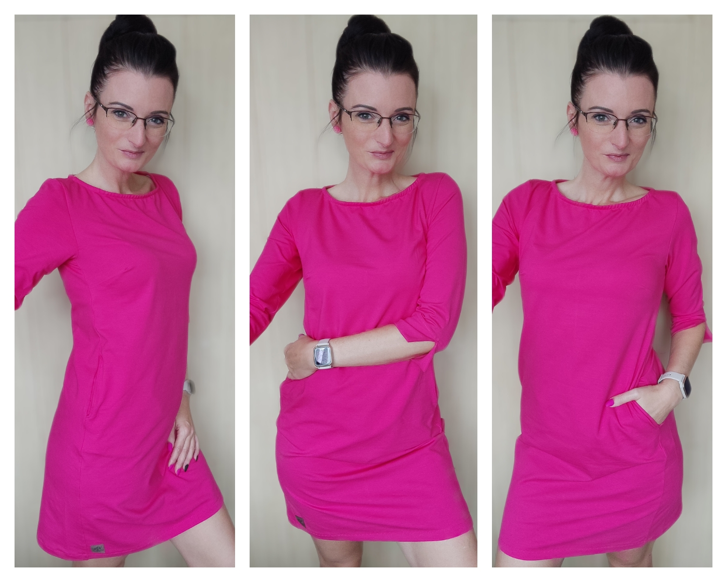 Jsou to šaty, které díky své délce i střihu jdou nosit jak s legíny tak bez nich. Délka rukávu je praktická a zakončená úžasnou manžetou, která vás bude při šití bavit svou jednoduchostí a při nošení vám zajistí veškerý komfort ať už ji ohrnete nebo necháte směrem dolů jako rozparek. Pouzdrové šaty mají lehce projmutý pas, v předním díle jsou všité důmyslné kapsy, které jsme vymysleli tak, že partii bříška nepřidávají, a váčky se nekrčí. Jejich snadné šití díky videonávodu zvládne každá hobby švadlenka.