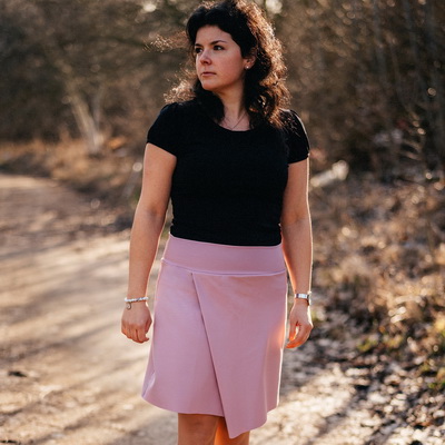 Sukně ke kolenům je ušitá z pohodlného úpletového materiálu, v pase je tvarovaný náplet. Ušít ji zvládne i začínající švadlenka.