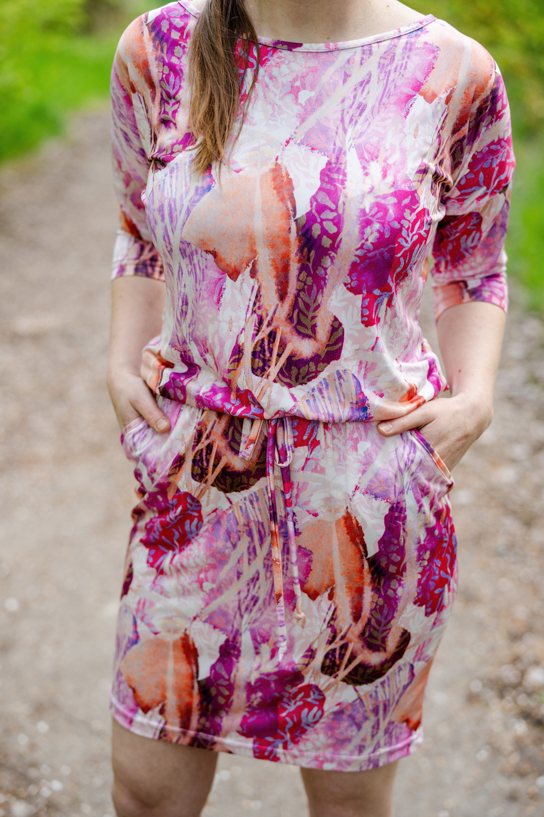 Vrchní díl šatů je příjemně volný, má 3/4 spadlý rukáv, který se dobře šije. V pasové linii je všitý tunýlek pro protažení šňůrky, ta vám umožnuje velkou variabilitu utažení nebo povolení pasu. Šaty déle pokračují polopřiléhavou sukní se správně hlubokými kapsami. Ty jsme pro vás speciálně vymysleli tak, aby se kapsový váček co nejméně rýsoval na dílu sukně. Délka šatů je nad kolena. Průkrčník i kapsy jsou lemovány proužkem ze stejného materiálu.