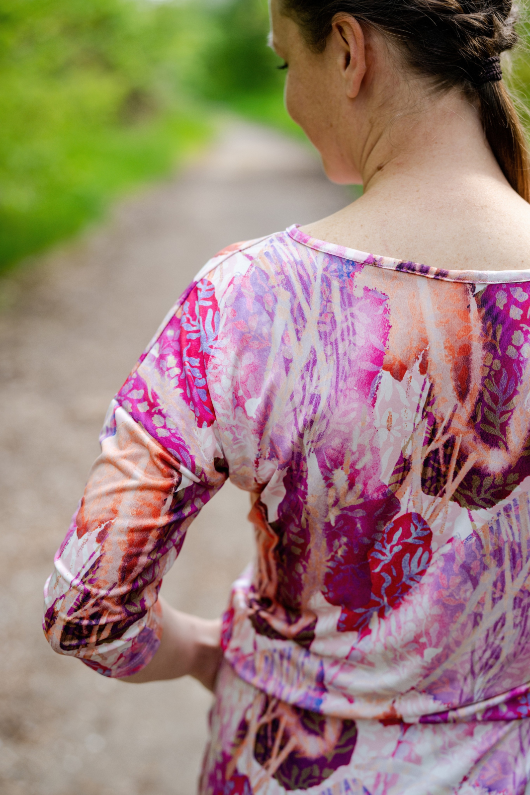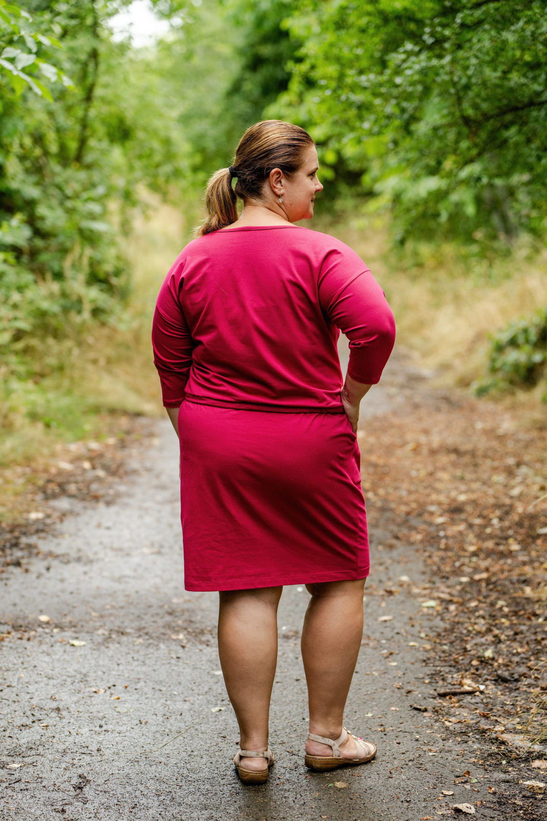„Vytiskla jsem si svou velikost přímo s přídavky, tuhle možnost velmi oceňuji, pomáhá mi přesně šít. Hned, jak jsem uviděla, že už je video návod, tak jsem se do toho pustila - nebyla jsem si jistá tunýlkem a lemováním, díky videu se ale šilo krásně, krok za krokem. Šaty jsou velmi pohodlné a dobře se nosí. Rukáv jsem si prodloužila.“
