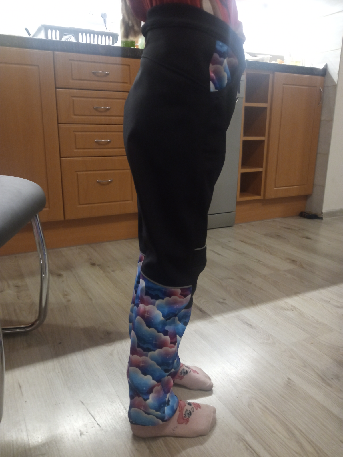 „Šití podle dobrého střihu a videa jde samo. Chce to přesně nastříhat látku. Střih jsem nekorigovala, jen výšku pasu jsem upravila na 10 cm a už jsem nemusela dávat gumu. Použila jsem reflexní paspulku. Délka je zakončena silnější lemovací pruženkou.“