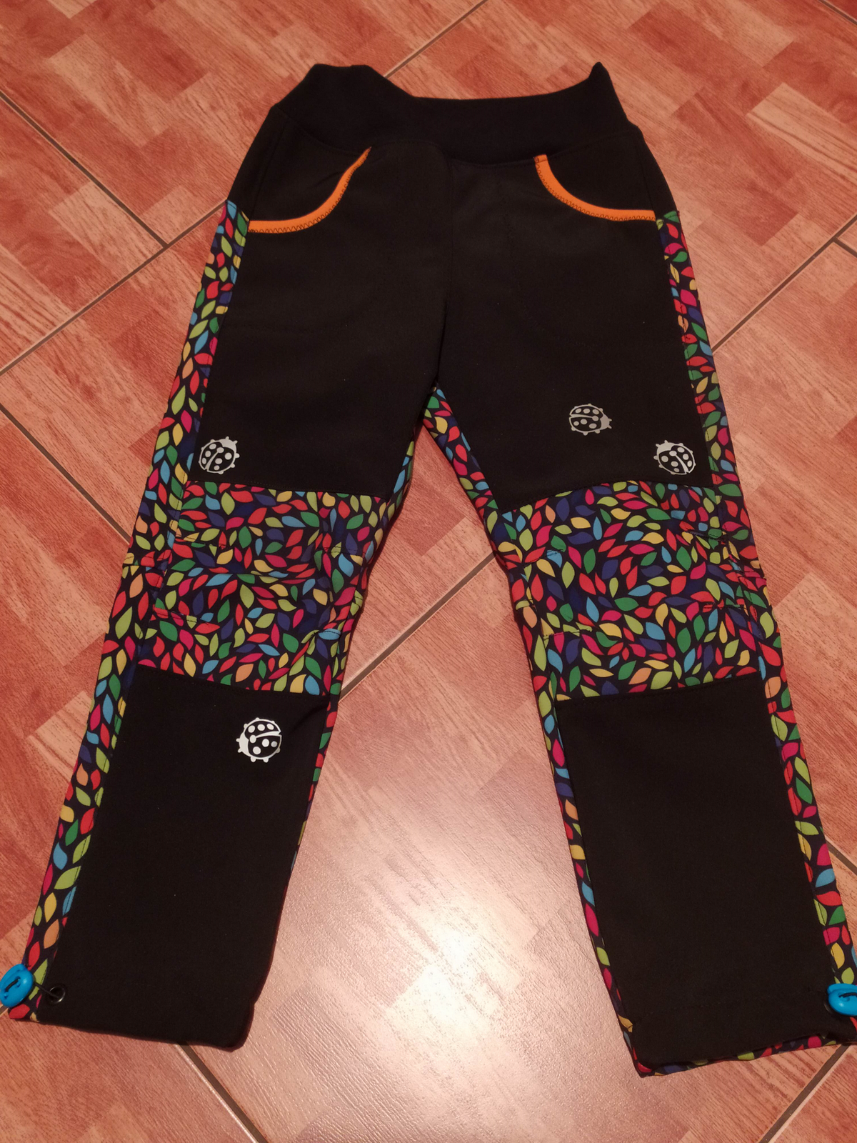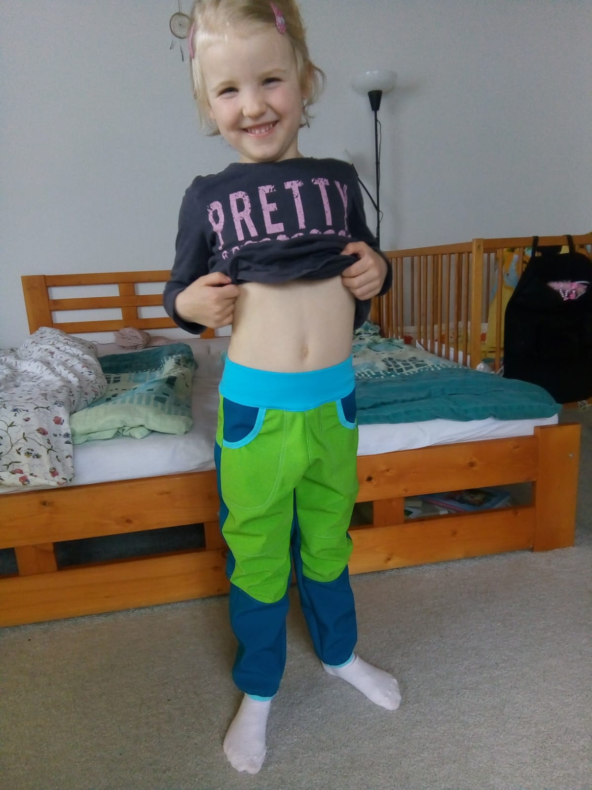„Ještě nikdy jsem nešila kalhoty z tolika dílů :) Aspoň jsem spotřebovala zbytky a prostřihy. Šilo se hezky, vše sedělo jak má. A hlavně kalhoty pěkně pasují! Libí se, M se v nich volně hýbe,nikde neškrtí a vypadají skvěle! Šila jsem podle fotonávodu, někde jsem si nebyla jistá, tak jsem nakonec hledala upřesnění ve videu. Určitě budou další.“