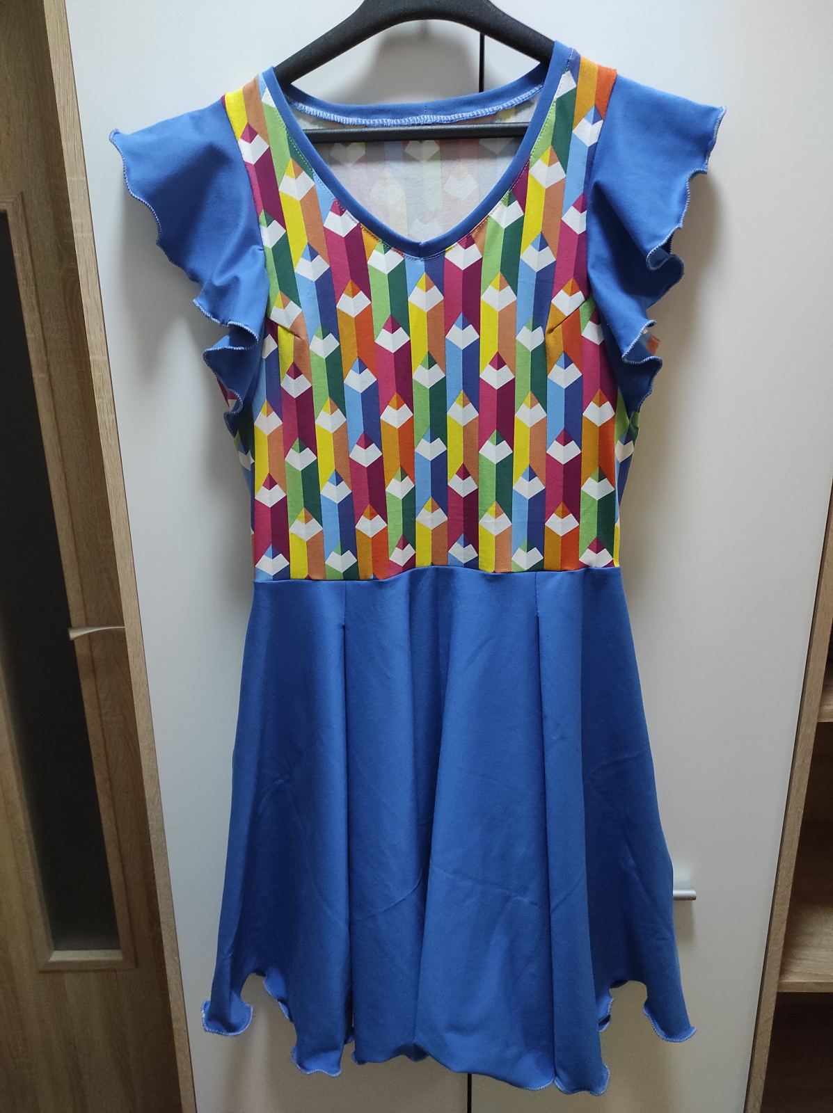 „Krásně všechno sedí, sesazovací značky skvěle usnadní práci. Šila jsem na rovnostehu overlockovym stehem, rukávy jsem ukončila tříkrokým cik-cakem, sukni jsem 2cm zahnula a prošila tříkrokým rovným.“