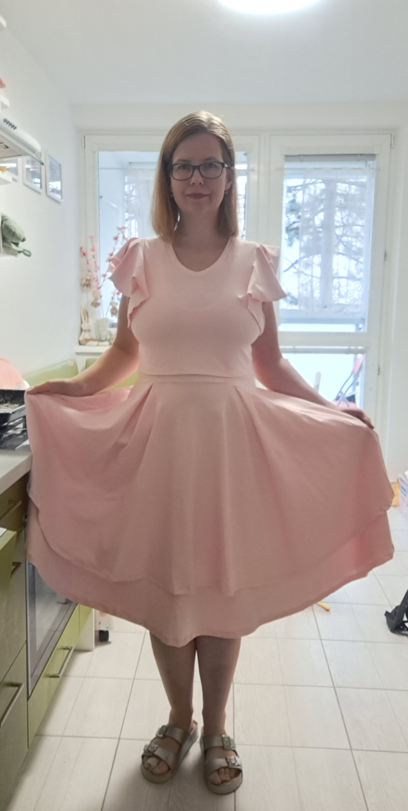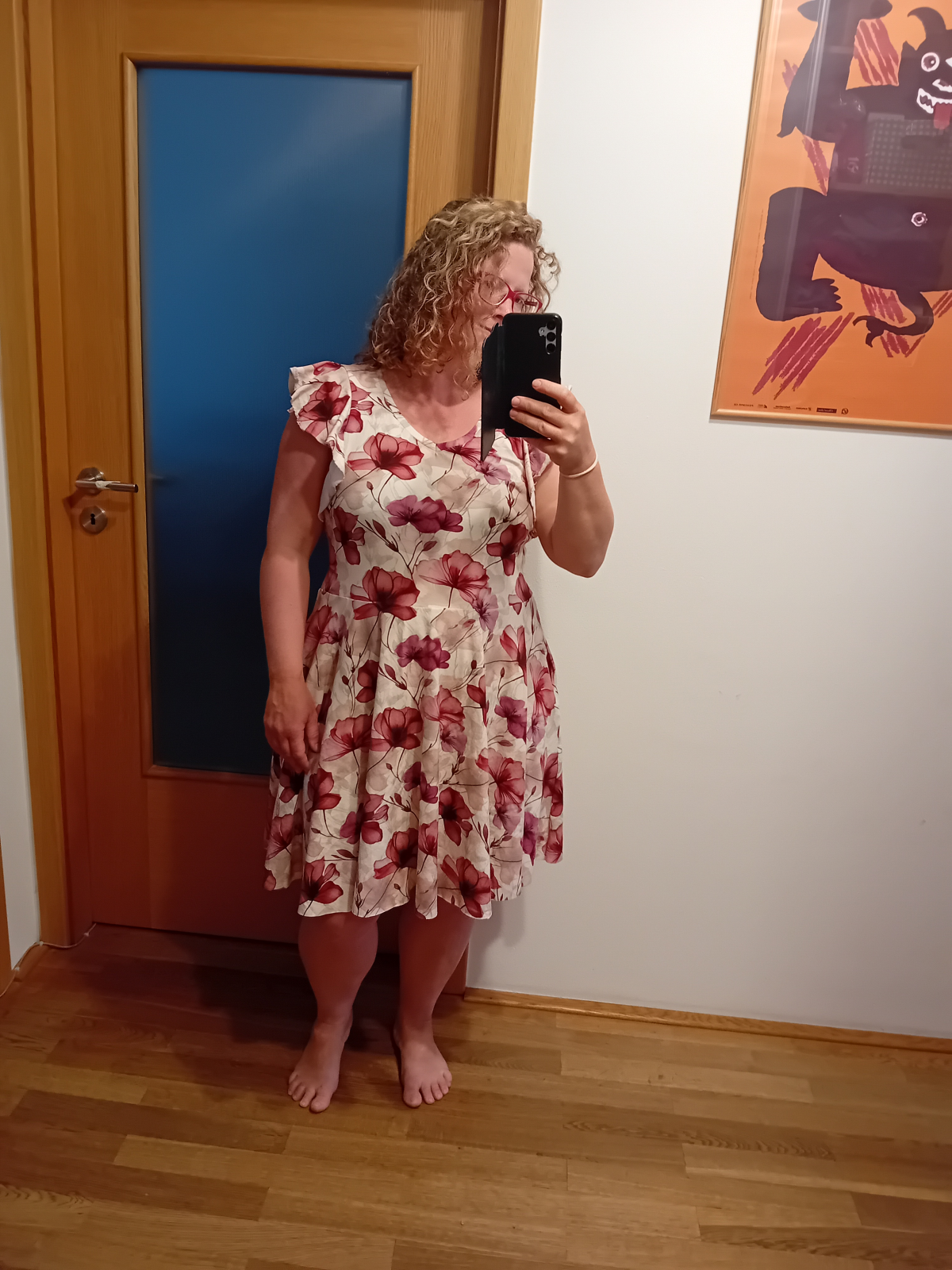 „Střih je super, šaty sedí moc pěkně a jsou příjemné na nošení. Provedení rukávů je zajímavé. Přestože jsem šila podle videa, první rukáv jsem párala třikrát. 😄