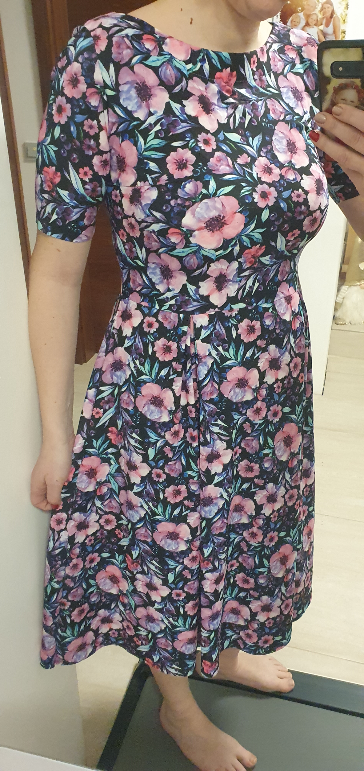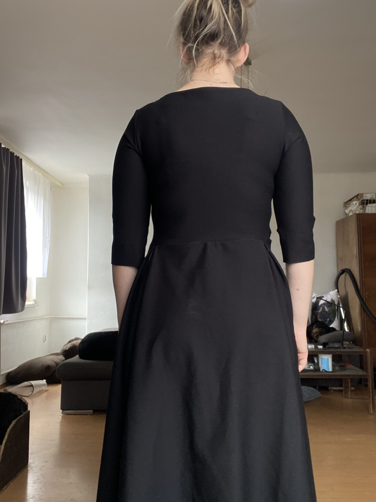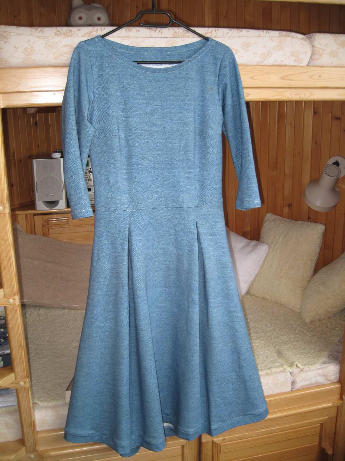 „Se střihem jsem byla velmi spokojená, zrovna tak s návodným videem. Prodloužila jsem rukávy a nepatrně i délku. Délku jsem ještě navíc lemovala proužkem na polovinu. Sklady na předním dílu se otevírají postupně. Takže šaty jsou dost dlouhé a dost hezké, jak říká okolí. Spíše na pozdní podzim a zimu.... Krása. Děkuji za nápad a návod.“