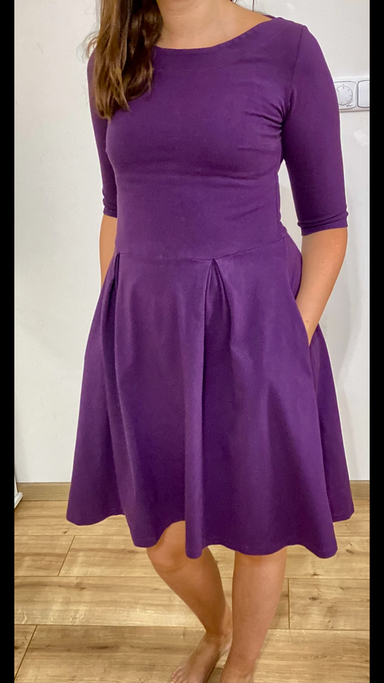 Slušivé, ženské, pohodlné a snadné na šití. Podzimní, jarní šaty se sklady a prodlouženou zadní částí sukně. Výstřih je zpracován do formy podsádky. Lze je nosit jako těhotenské (pokud by se zvýšil pas, tak i do pokročilého těhotenství :-). Střih je primárně zamýšlen pro teplákovinu s elastanem a tak by měly nejlépe sedět velikostně. Ale lze zvolit i jiný pružný materiál. Velikost je dobré odzkoušet ušitím jen vršku, jak je ukázáno ve video návodu. Koukněte do inspiračního alba, střih je úspěšně šit i z úpletu.