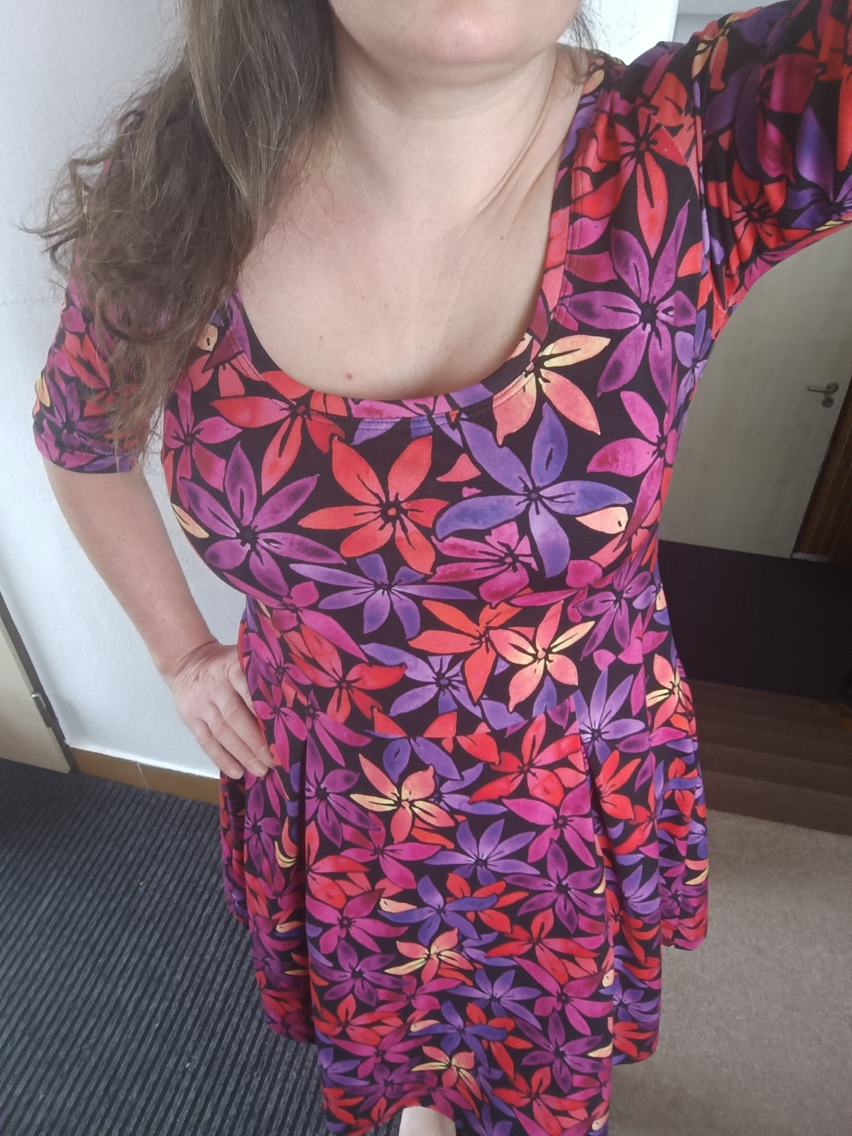 „Chtěla jsem trošku větší výstřih - tak jsem to střihla od oka 😁. Výstřih lemován proužkem na půl (podsádka se mi nějak nedaří). Střih je úplně super! Budu šít brzy další.“