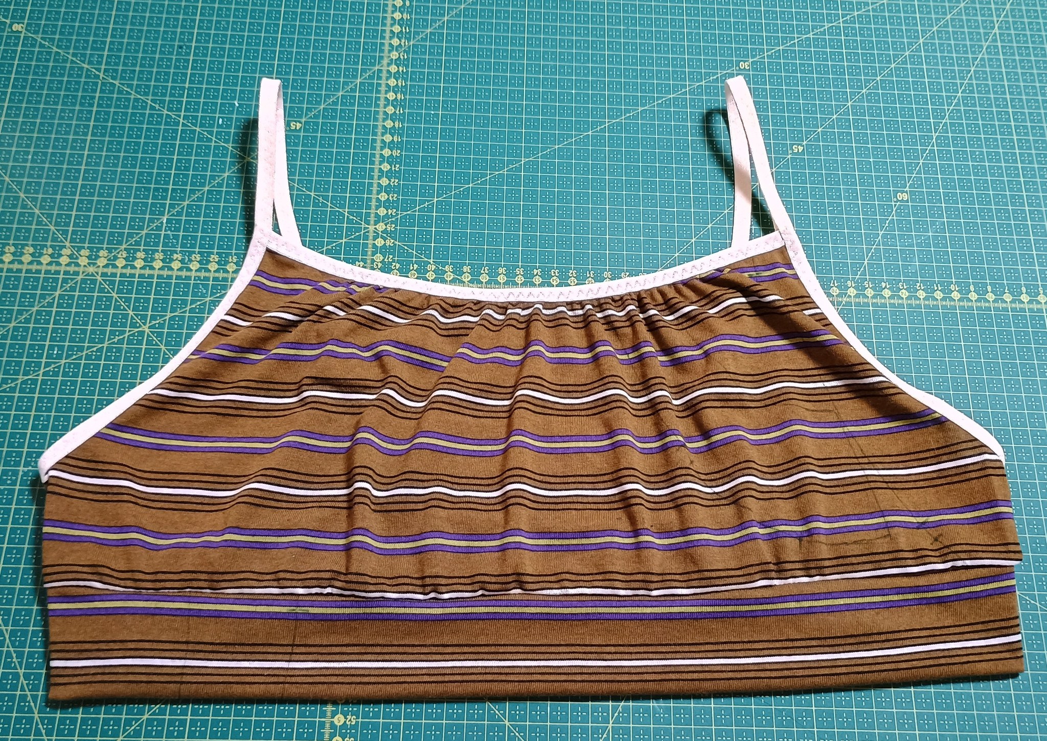 „Návodu ani střihu nemám co vytknout. Vlastní nezkušeností jsem nejprve lemovací pruženku v oblasti podpaží a zad málo natahovala. Ale stačilo po celém obvodu opatrně odstřihnout a našít (nový kus pruženky) znovu a lépe.“