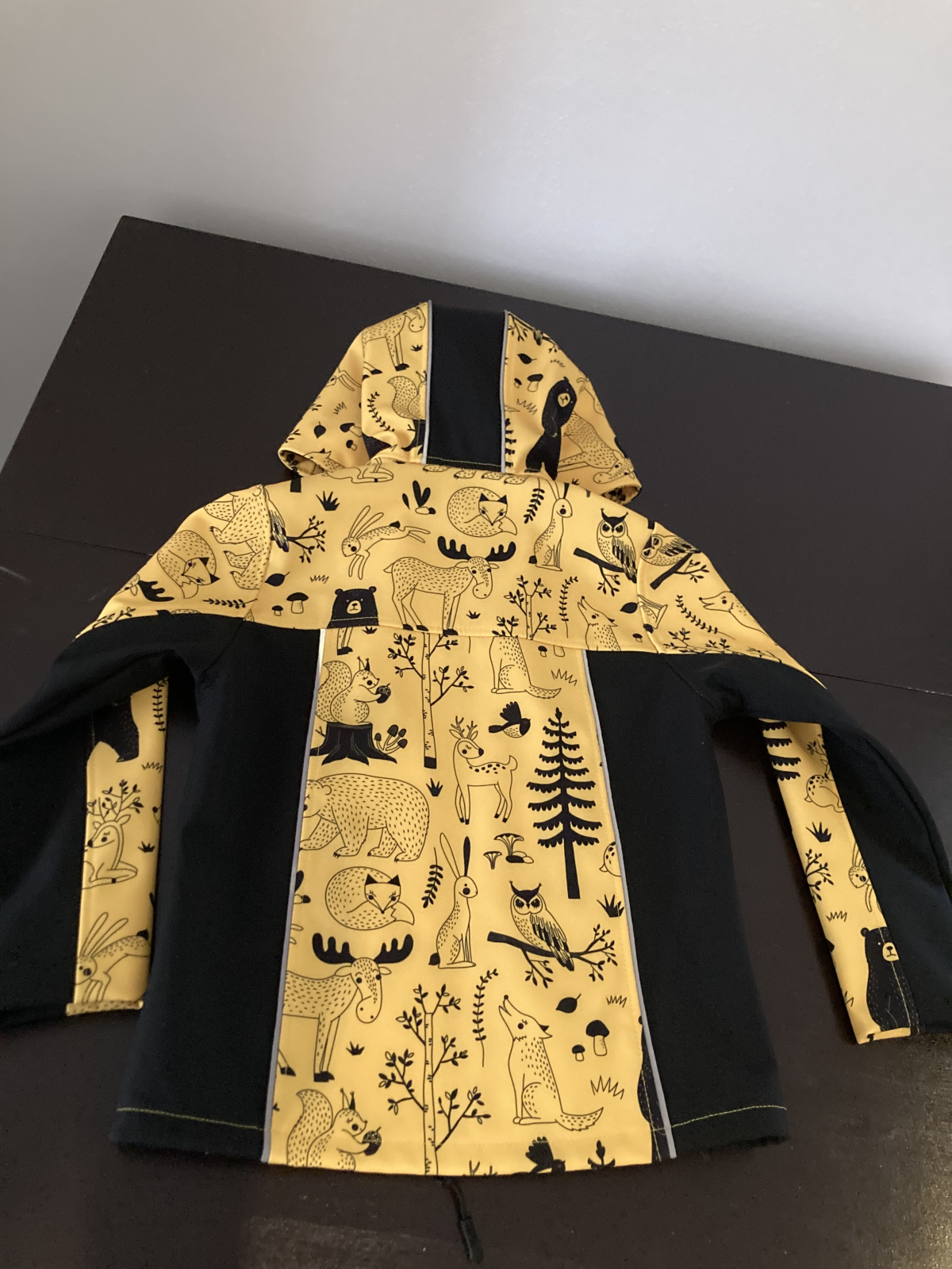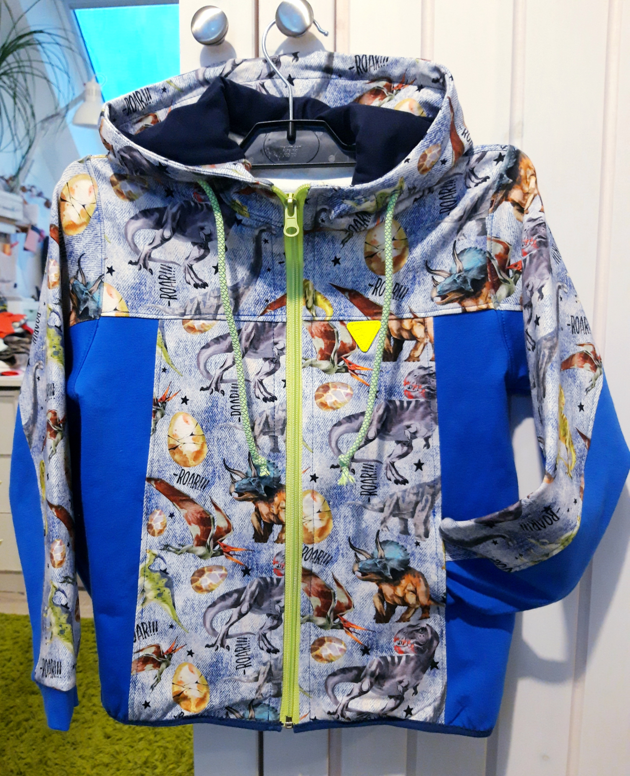 „Soft jsem šila poprvé, podle super střihu a videa se šilo parádně. Až na prošití kolem zipu - místy neprovazovaly nitě. Prý to dělají domácí šicí stroje, možná i to dvojí podlepení páskou Prym (je trochu silnější). Střih jsem korigovala podle délky zipu - výborná pomůcka. U rukávů jsem všila skrytou manžetu, u kapuce a na zadním díle je reflexní paspulka.“