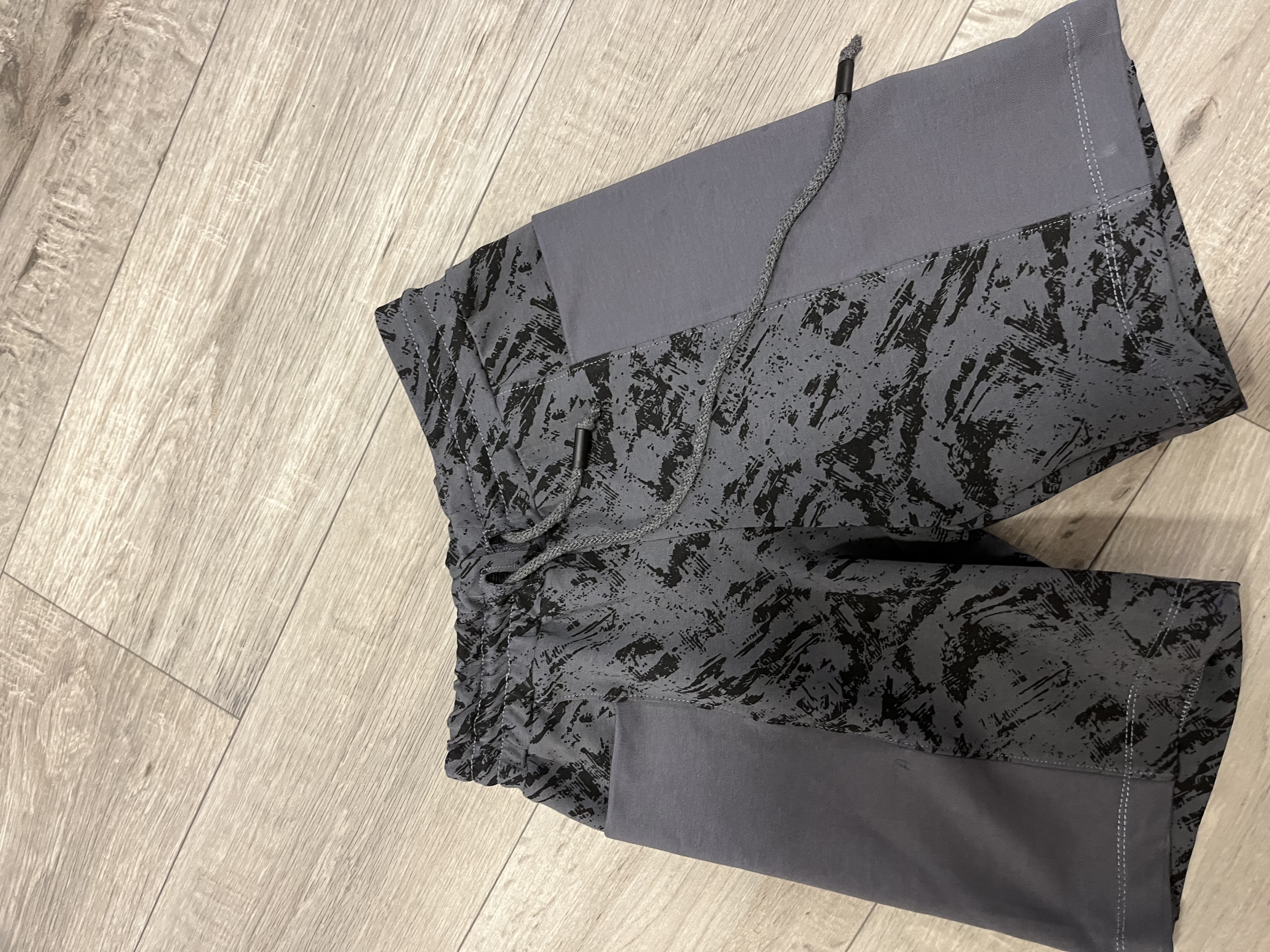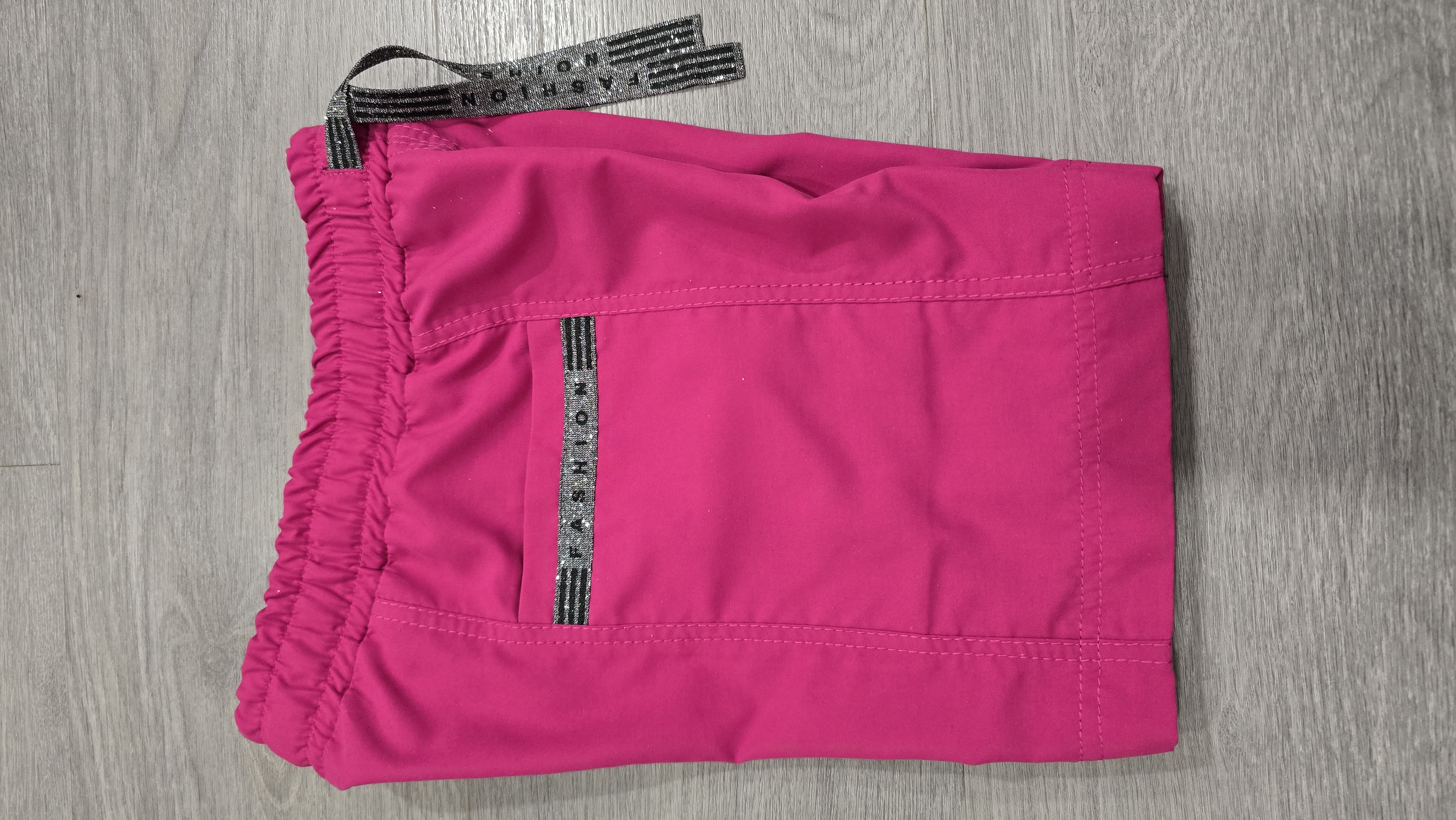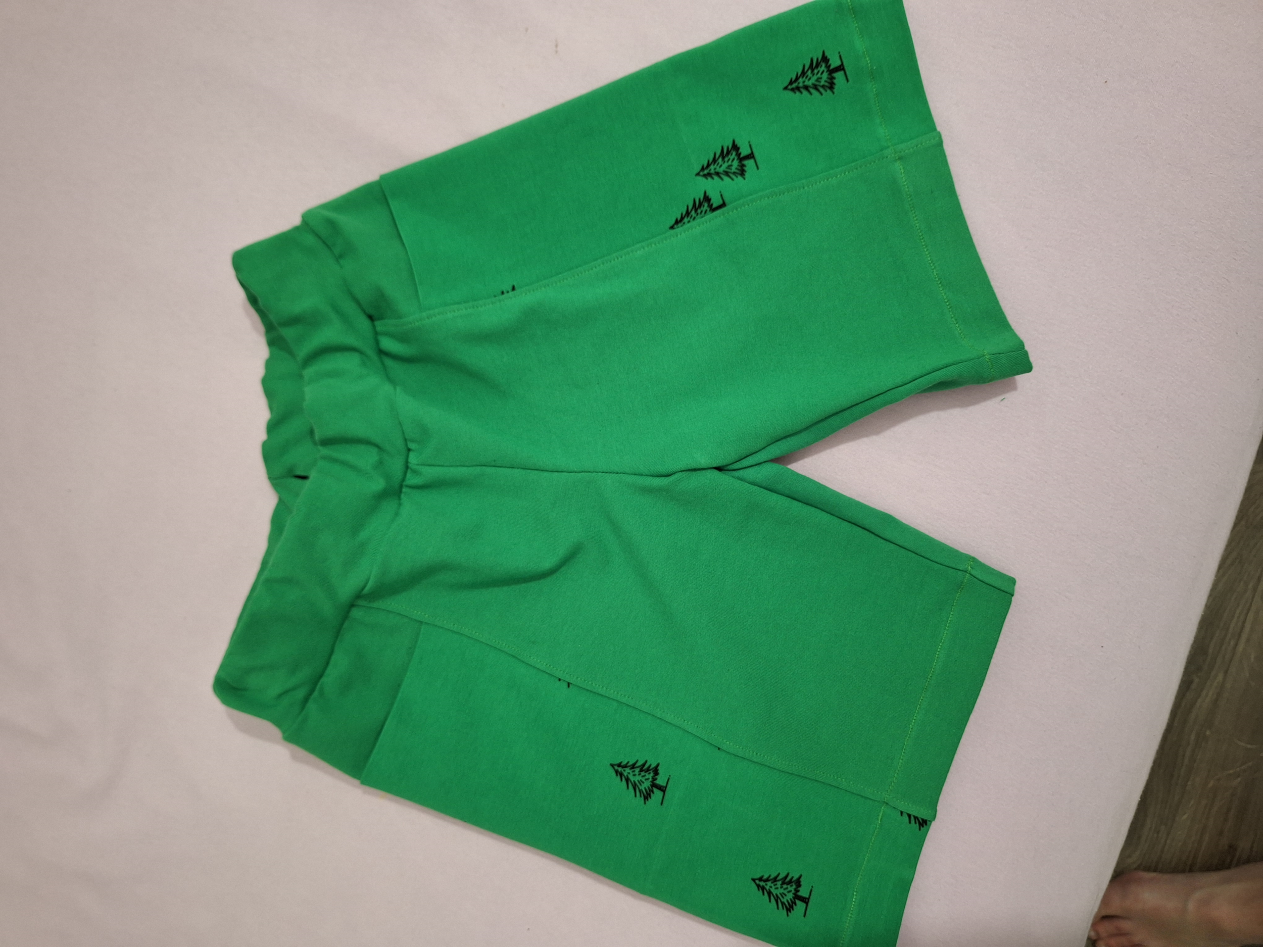 "Druhé šití dle střihu, šila jsem z úpletu, což víc pruží, tudíž šitá velikost 128 odpovídá pro velikost 134, jelikož nositel není k v domě, ušila jsem tři tunýlky na gumu šíře 3 cm, a případně po vyzkoušení gumy povolím nebo zkrátím. " *