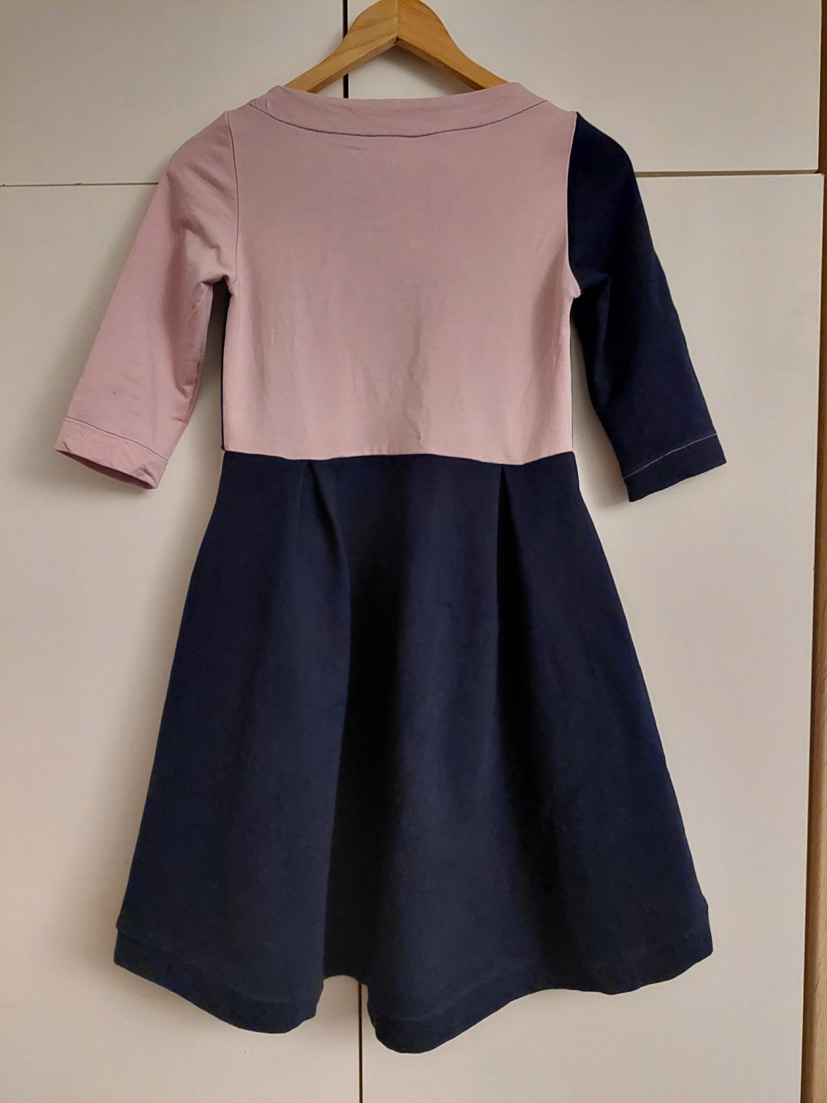 Výstřih je lodičkový, začištěn podsádkou. Hlavicové rukávy jsou těsně pod loket. V předním i zadním díle sukně jsousklady, a ve švu mají šaty kapsy.