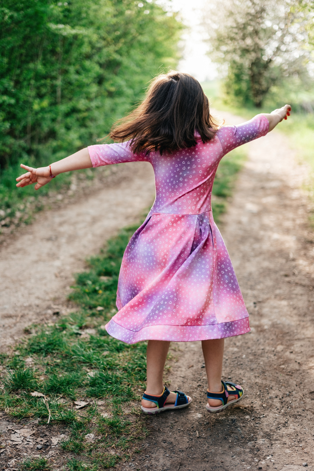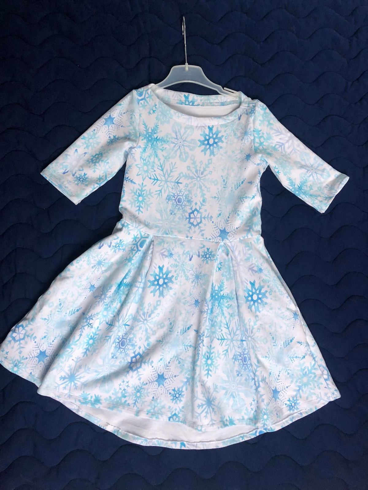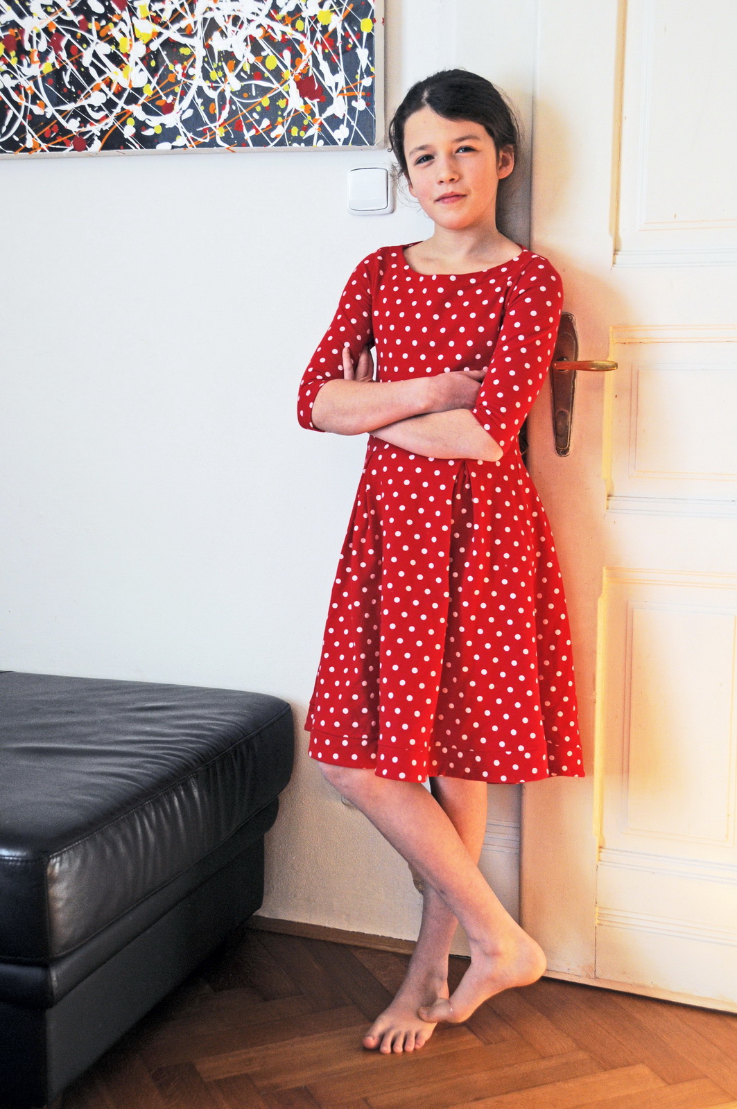 JM: "Dcera je nechce sundat 🙂. Dělá mi to velkou radost, jsou to moje první ušité šaty, poprvé na overlocku a poprvé z úpletu." *