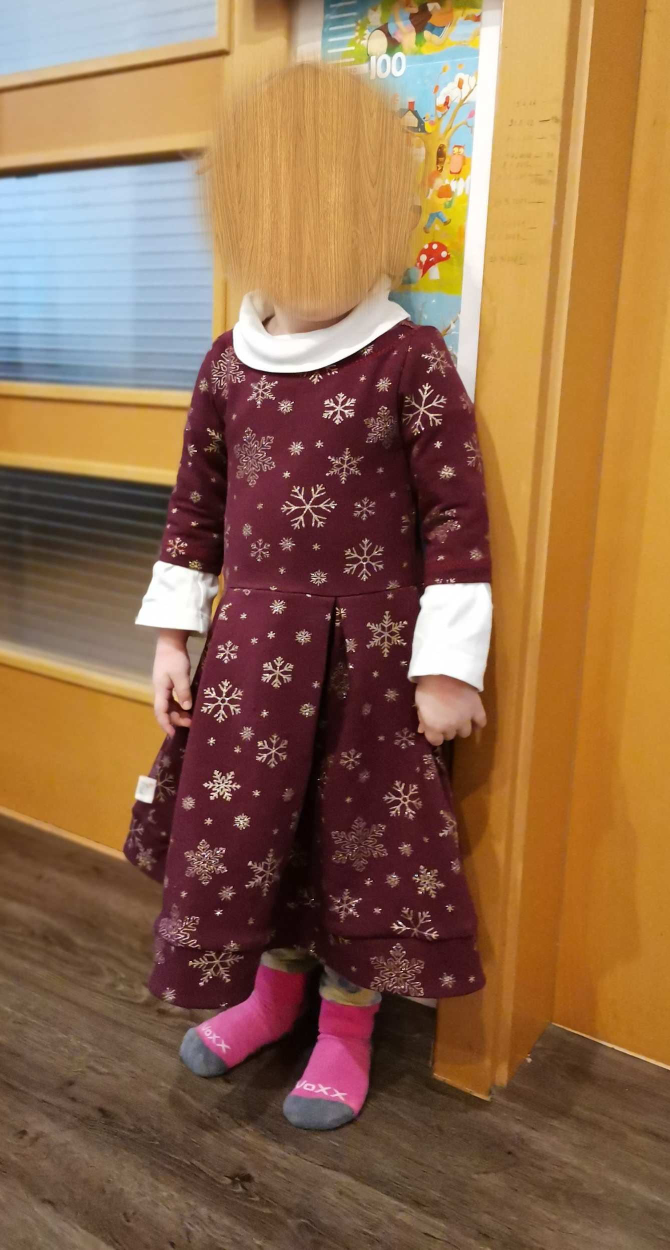 MN: "Byla jsem se střihem velmi spokojená - jako se všemi ostatními. Šaty daly stejnou práci jako pro dospělého, možná i více, protože kvůli velikosti hlavičky jsem průkrčník zadního dílu musela šít s rozparkem. Šaty se však povedly a milovnice "tlapkovky" je s vánočním dárkem spokojená. " *