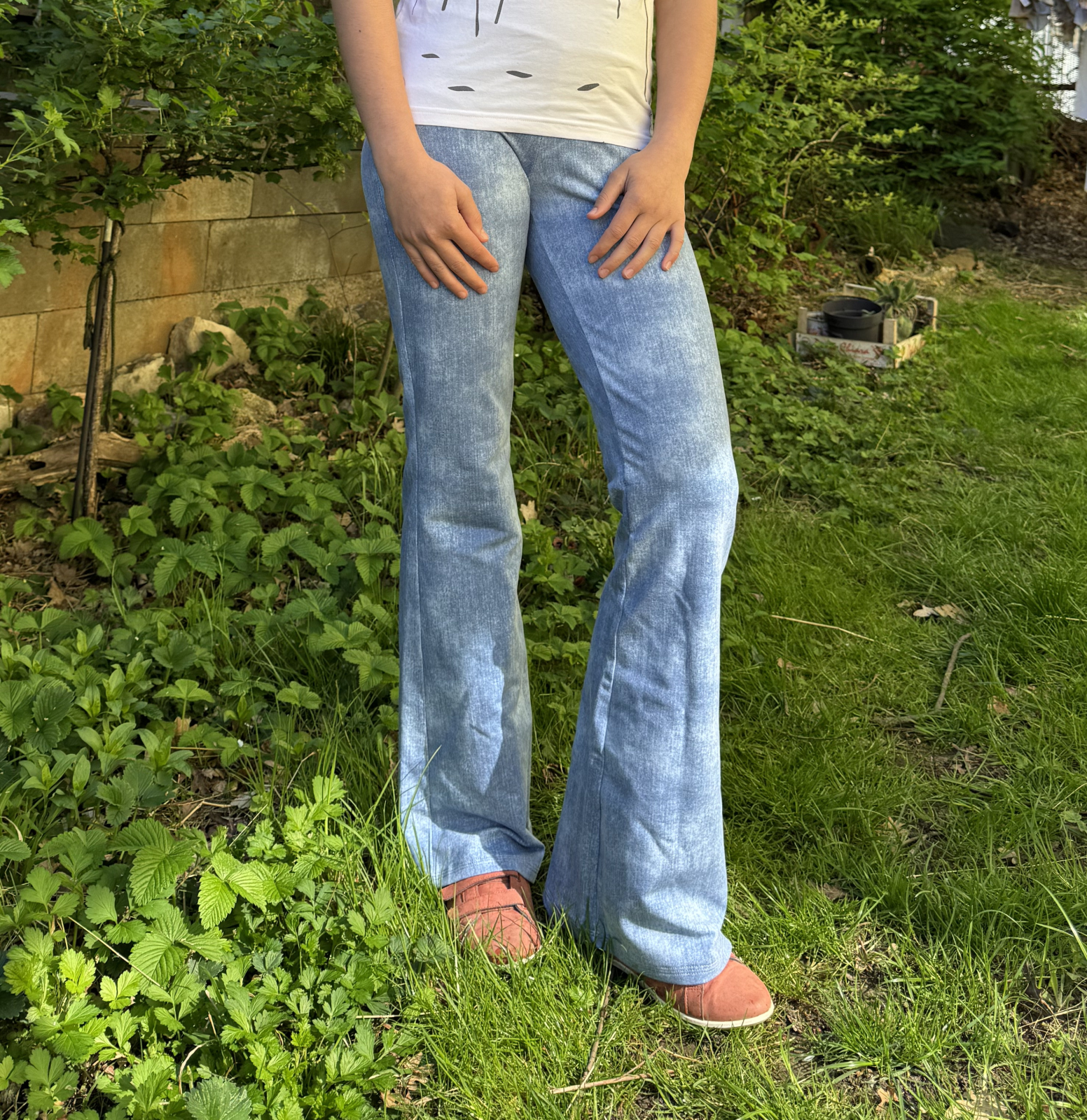 - TIP: ušijte zvonáče z imitace džínoviny, budou k nerozeznání od džínů a přitom pohodlné pro sezení ve škole i pohyb na hřišti.