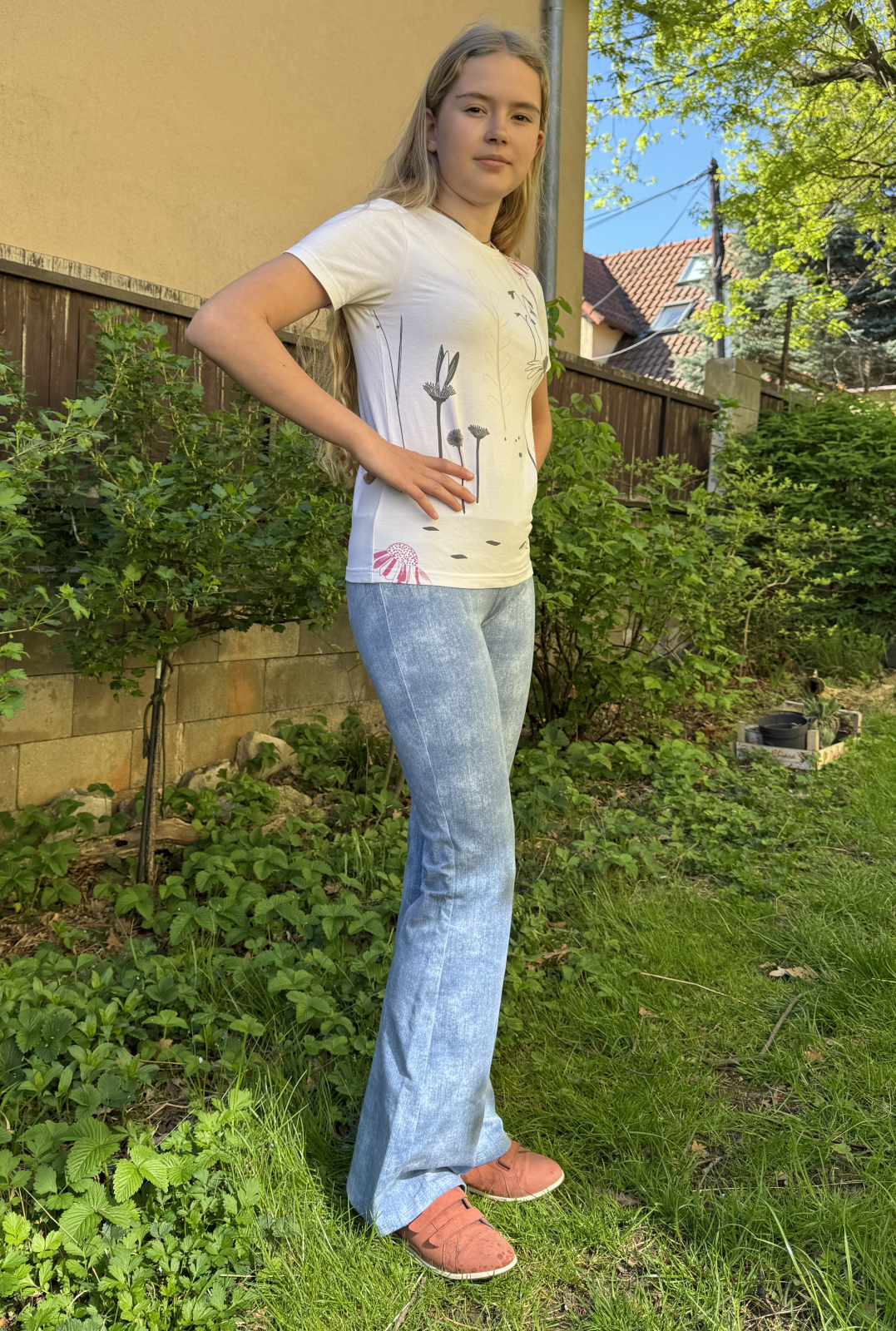 „Šilo se krásně a rychle, jako vždy. Dcerce jen nevyhovuje vysoký pas (hned si ho začala ohrnovat), tak příště trochu snížím, což je u živých střihů krásné, že to jde tak snadno :o)“