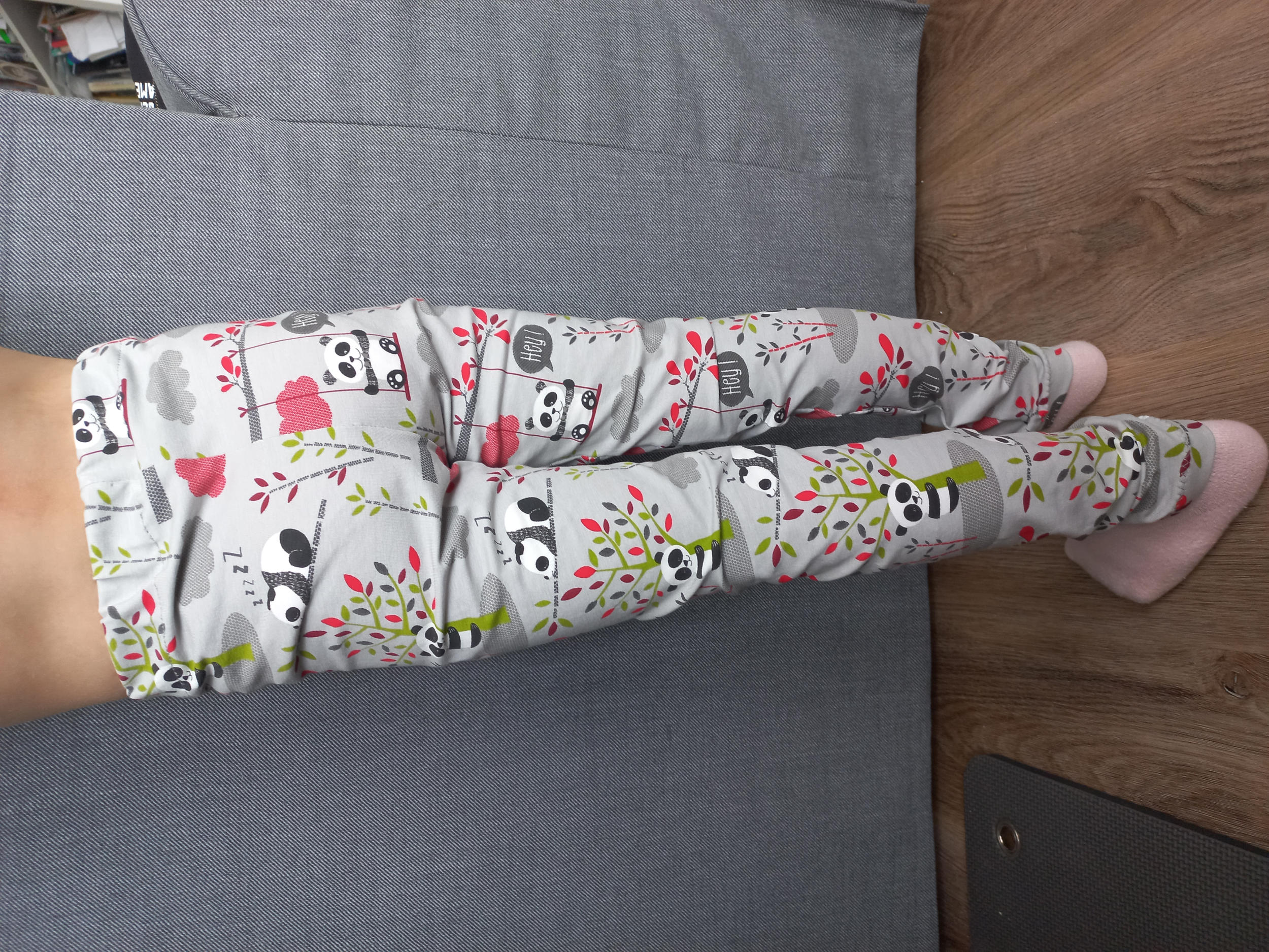 MR: "Jako vždy super šití, dcera je hubená, takže šiju šířkově 134 a délkově 145. Sednou jí lépe než třeba legíny od shape a lepší než živolegíny. A výhoda je, že jsou z jednoho dílu, takže rychlejší šití. Jinak jsou to legíny pod kolena na lítačku na ven k babičce, proto ta infantilní látka:-)." *