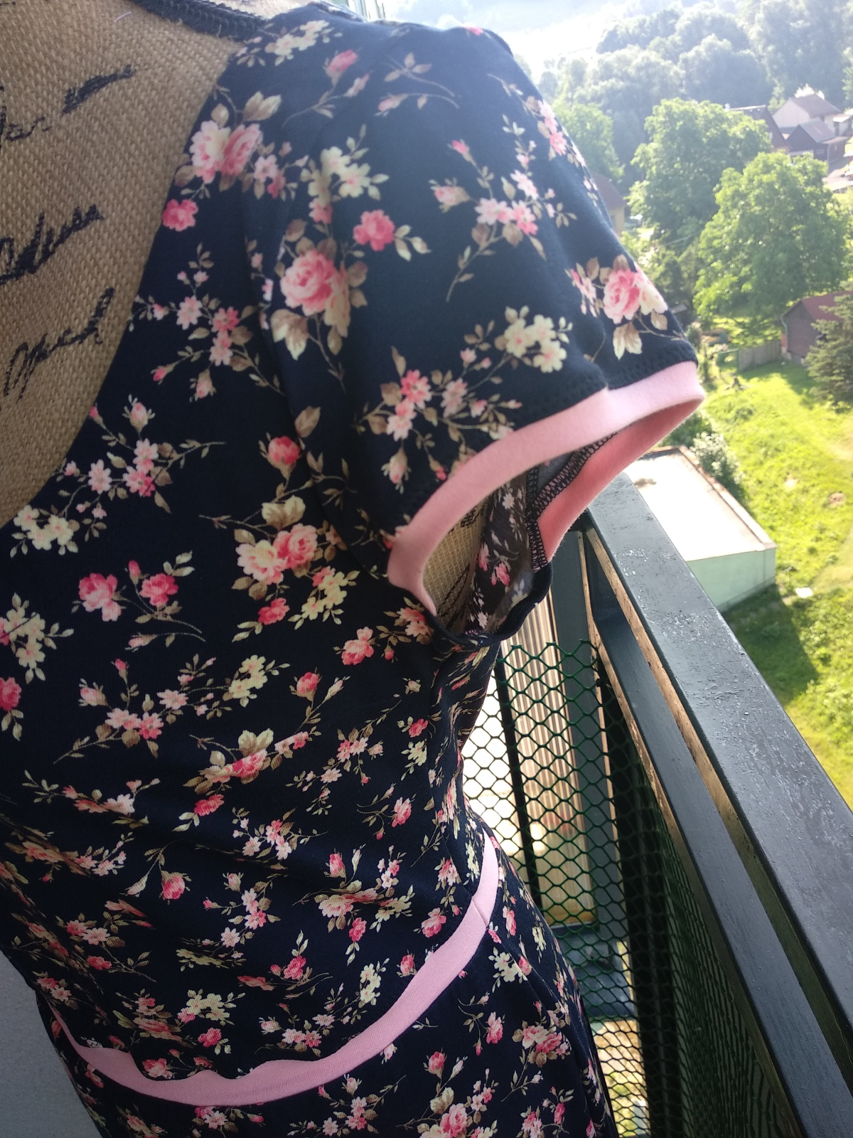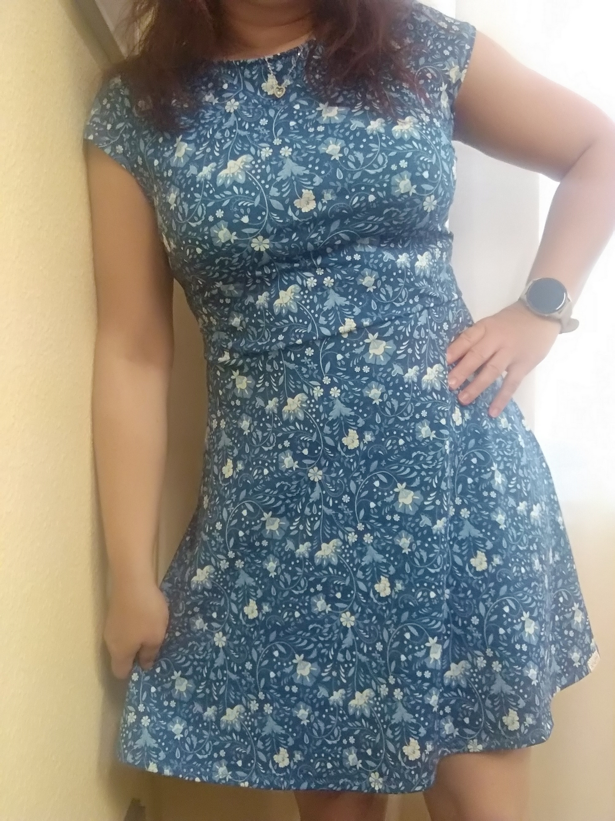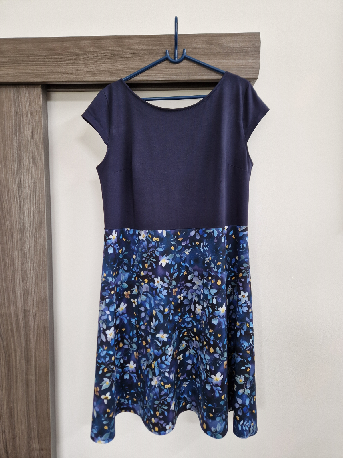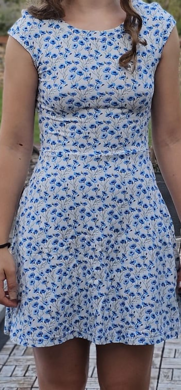 MiNej: "Velká spokojenost. Skvěle padnoucí střih. Držela jsem se malého výstřihu vepředu a většího vzadu - hodně se mně to takto zamlouvá. Výsledek je výrazně odlišný u různých materiálů (např. splývavost), i u různých délek (modré květy o 4 cm delší)." *