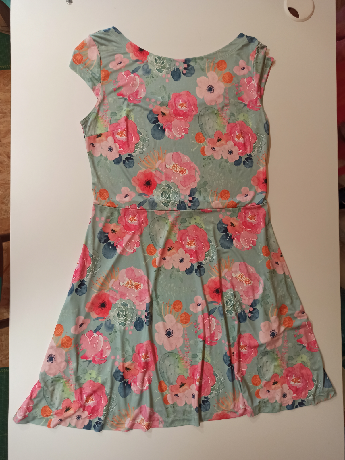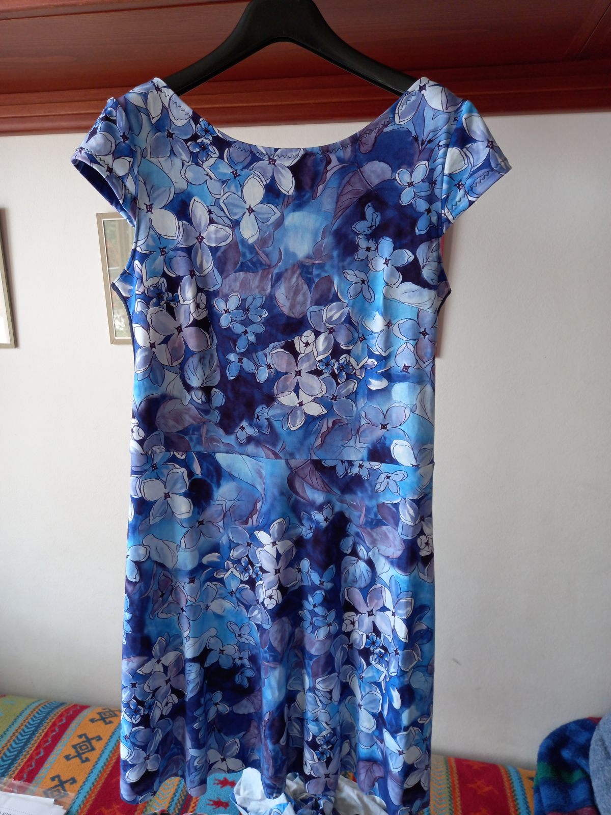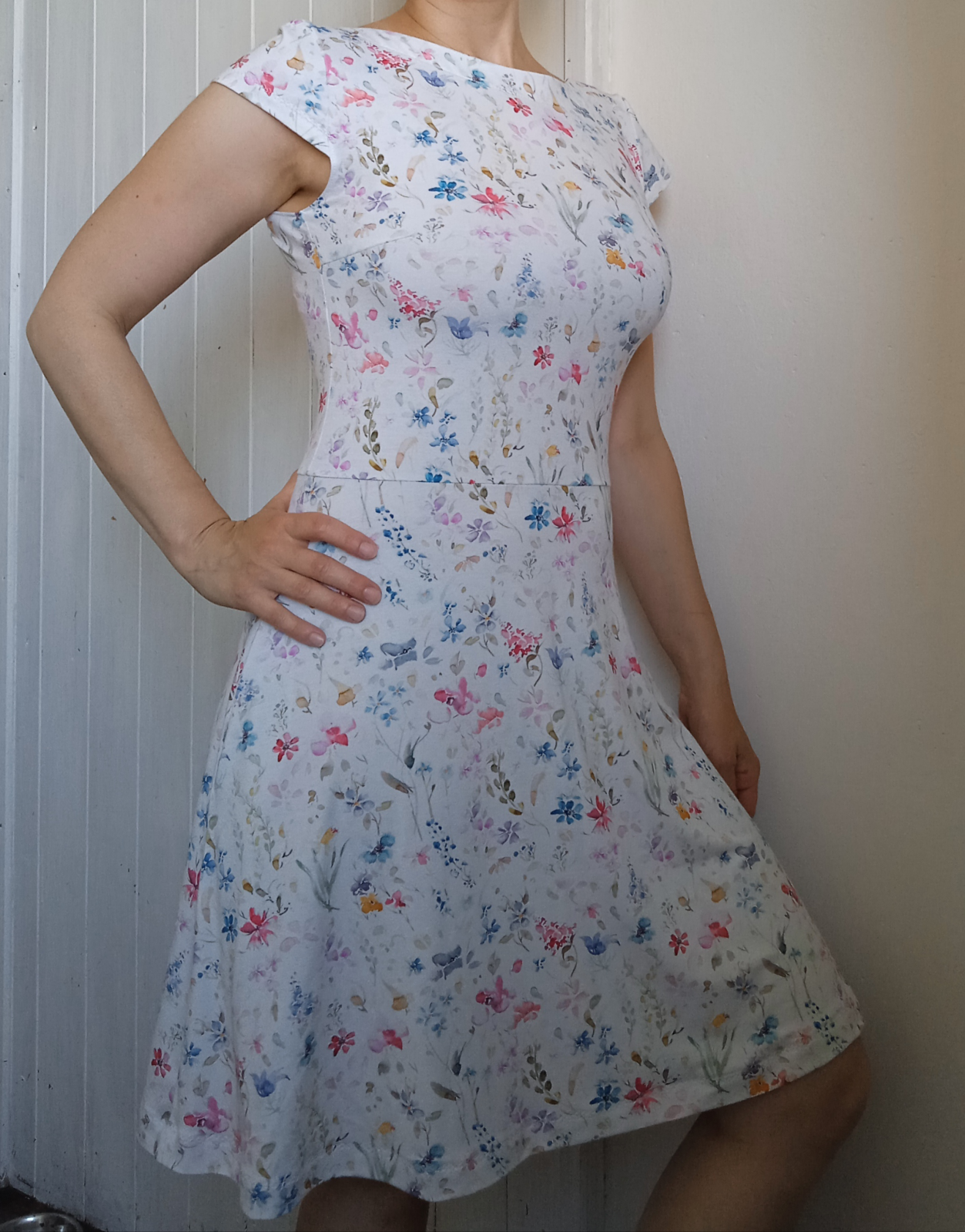 MiNej: "Velká spokojenost. Skvěle padnoucí střih. Držela jsem se malého výstřihu vepředu a většího vzadu - hodně se mně to takto zamlouvá. Výsledek je výrazně odlišný u různých materiálů (např. splývavost), i u různých délek (modré květy o 4 cm delší)." *