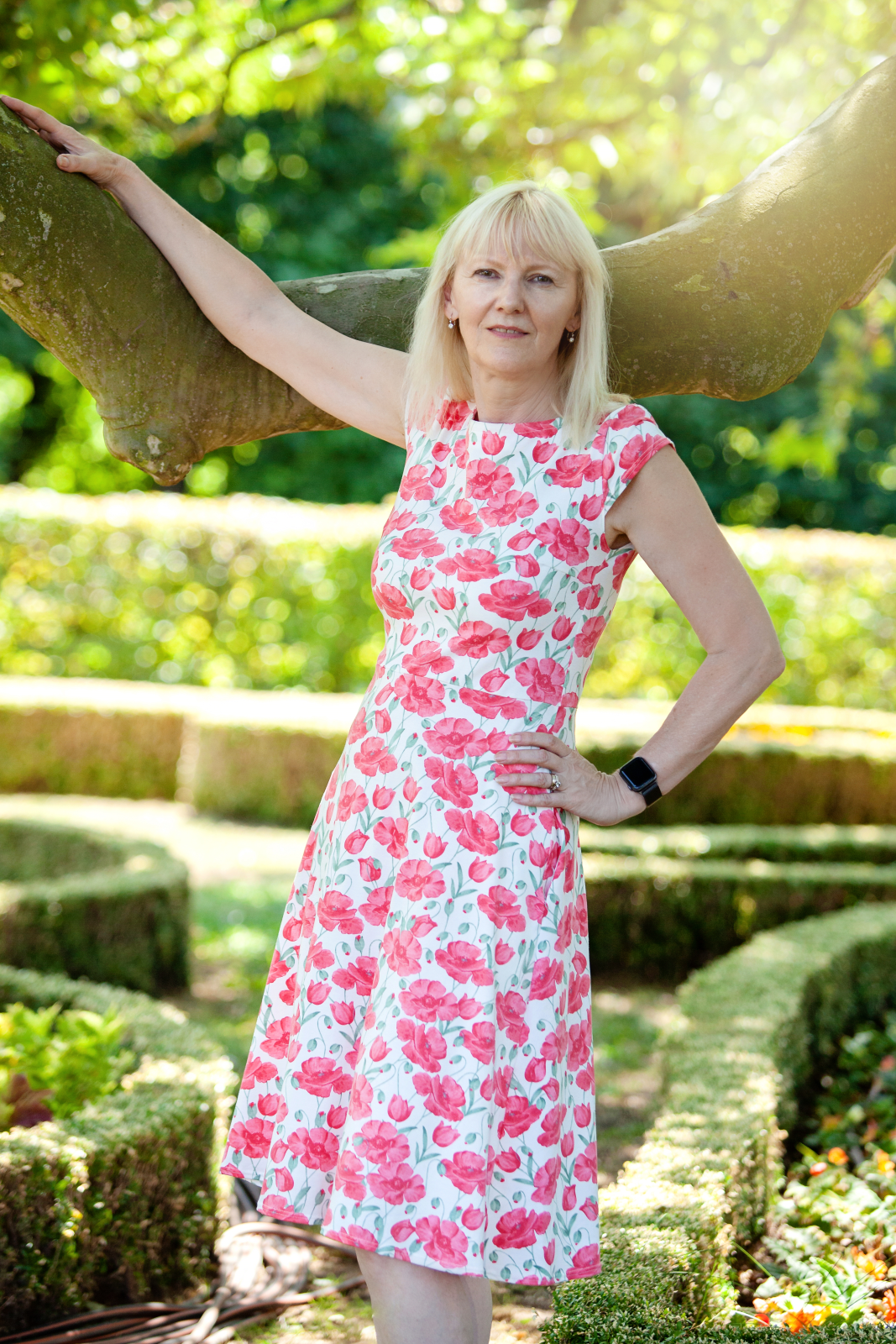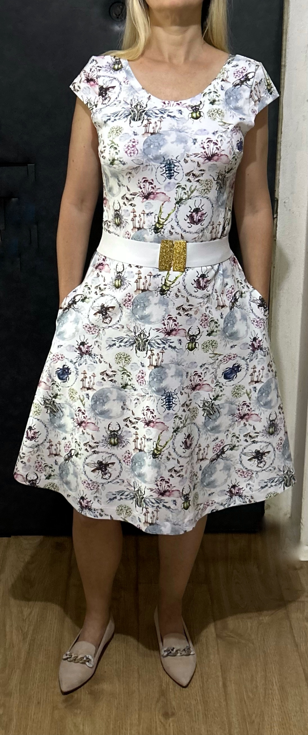 Letní šaty s áčkovou sukní, do které se vešly i kapsy. Lodičkovým výstřihem vpředu a hlubokým vzadu. Mají i krátký rukávek, který dokreslí siluetu přesýpacích hodin.