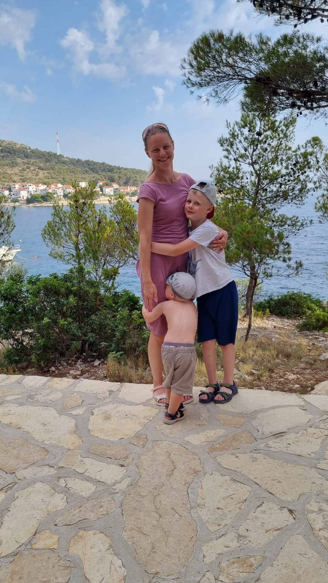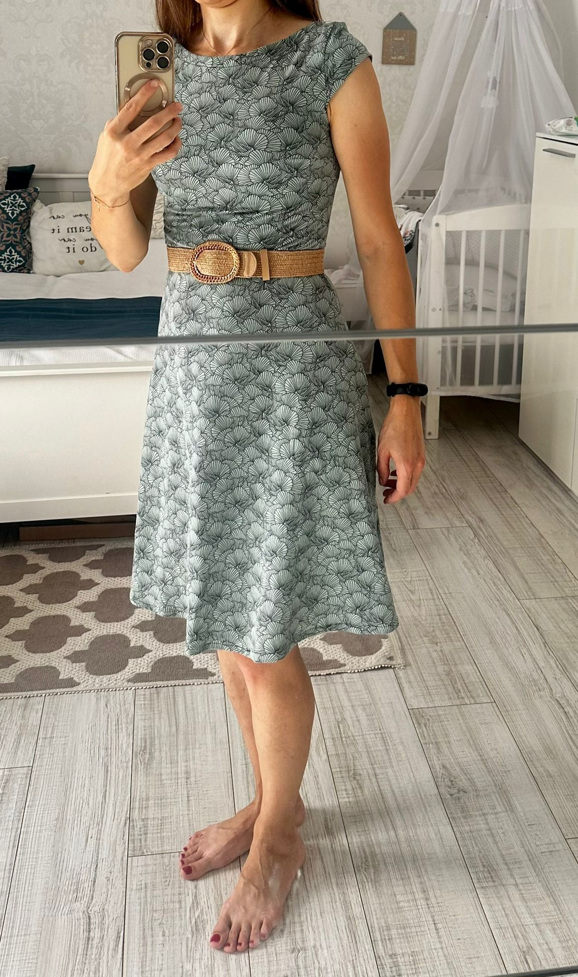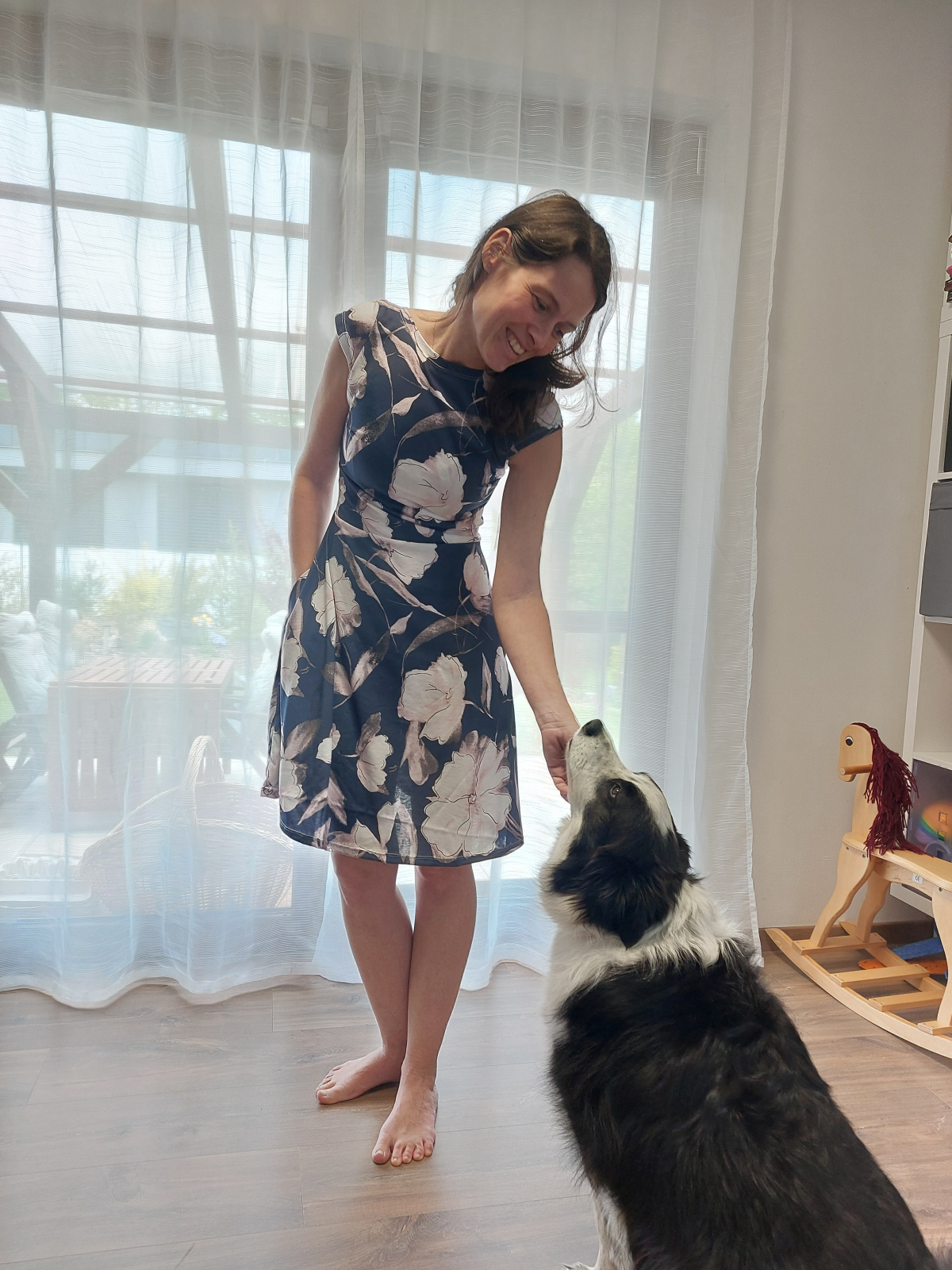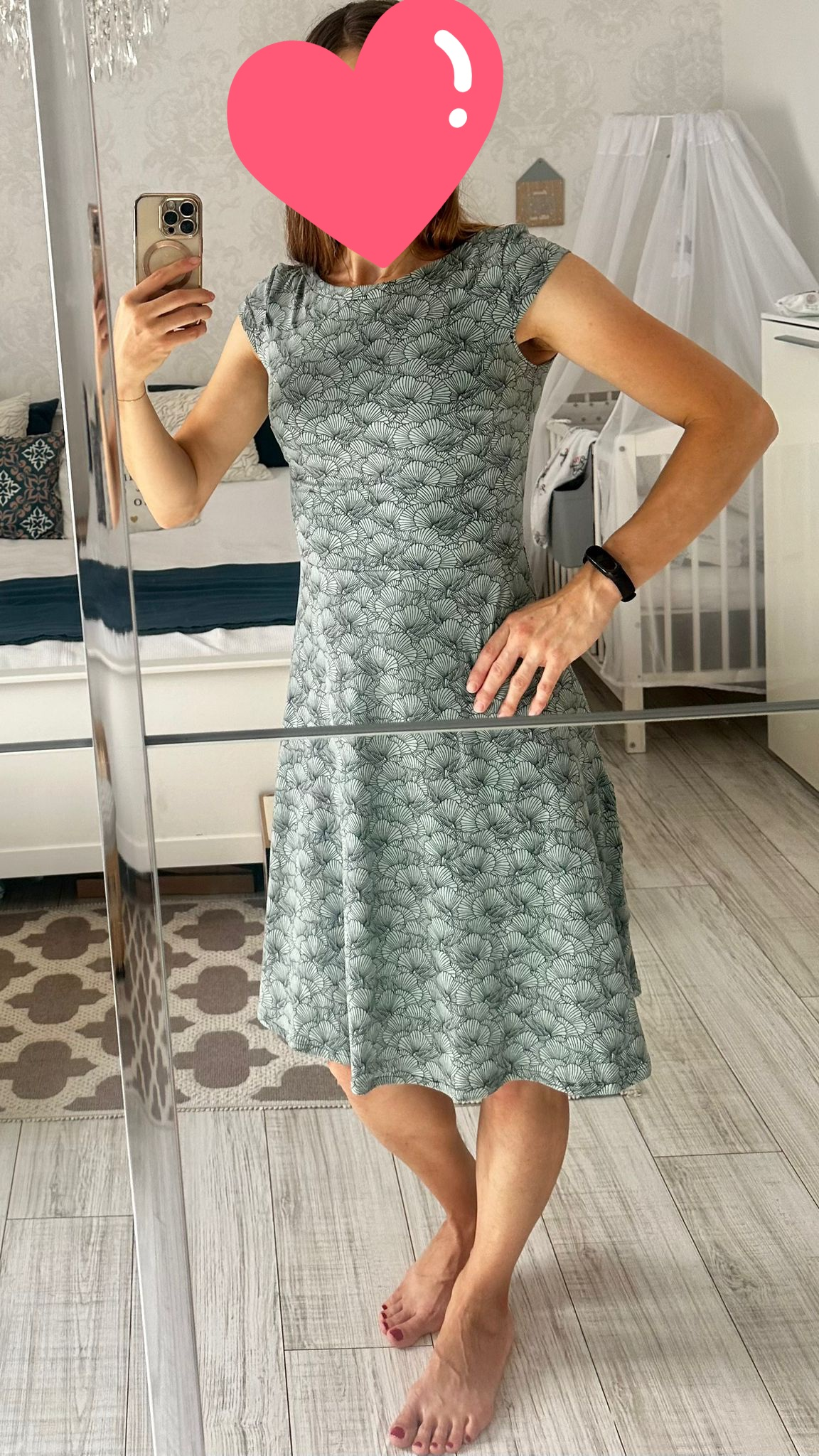 "Úplně prvně šité saty v životě. Šily se hezky - super střih i video návod. U dalších budu muset upravit šíři ramen a délku. Zkušební šaty s úpravou na kojení - nemají posádku, ale prouzek na polovinu s navleknutou gumou. Použila jsem nějaký stoletý těžký zebrovany uplet, co jsem měla doma. " *