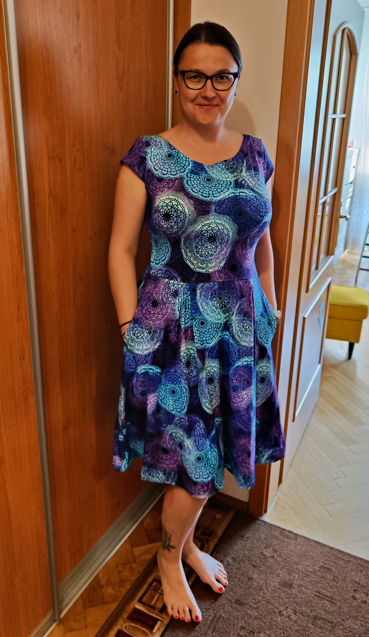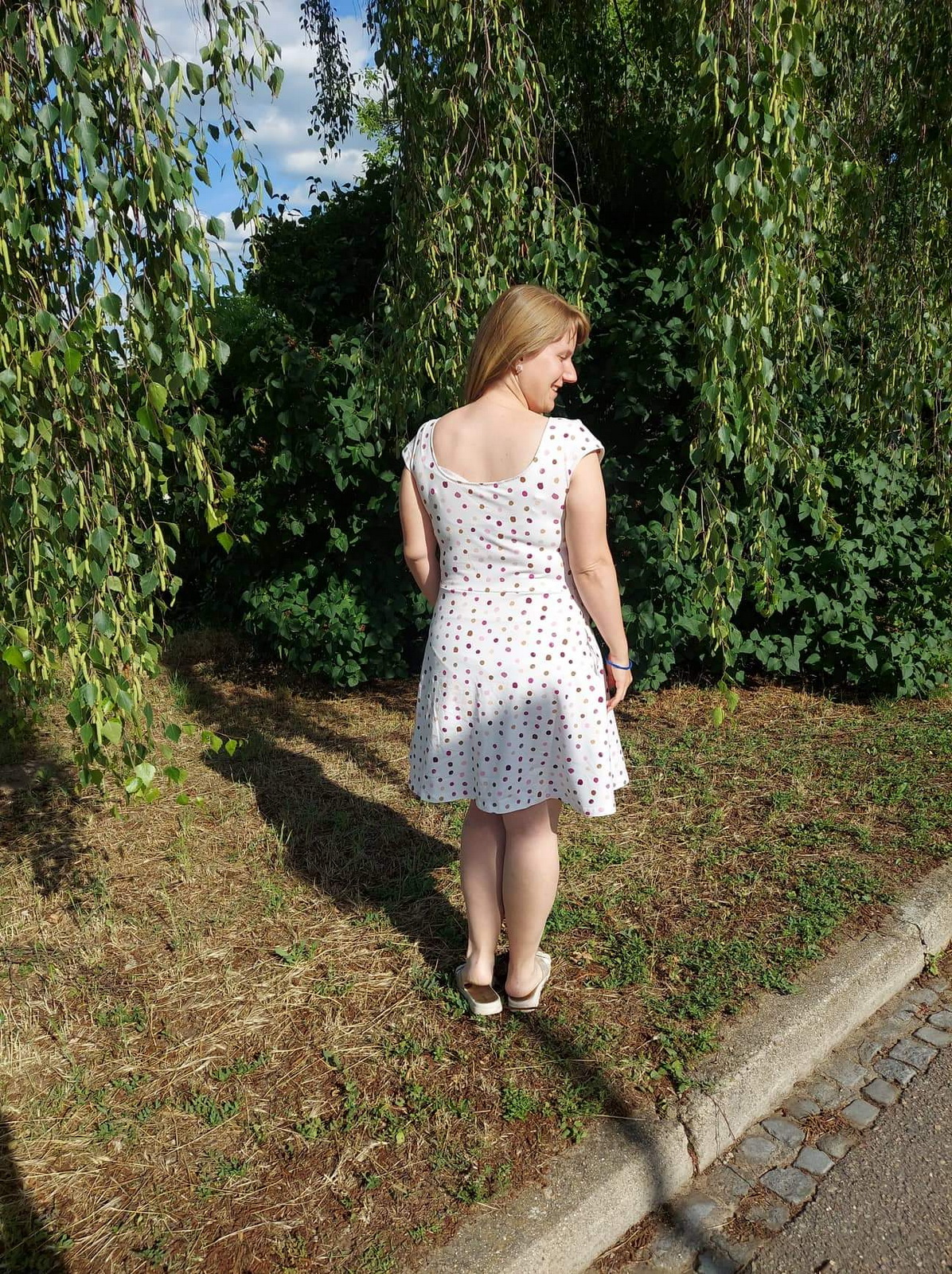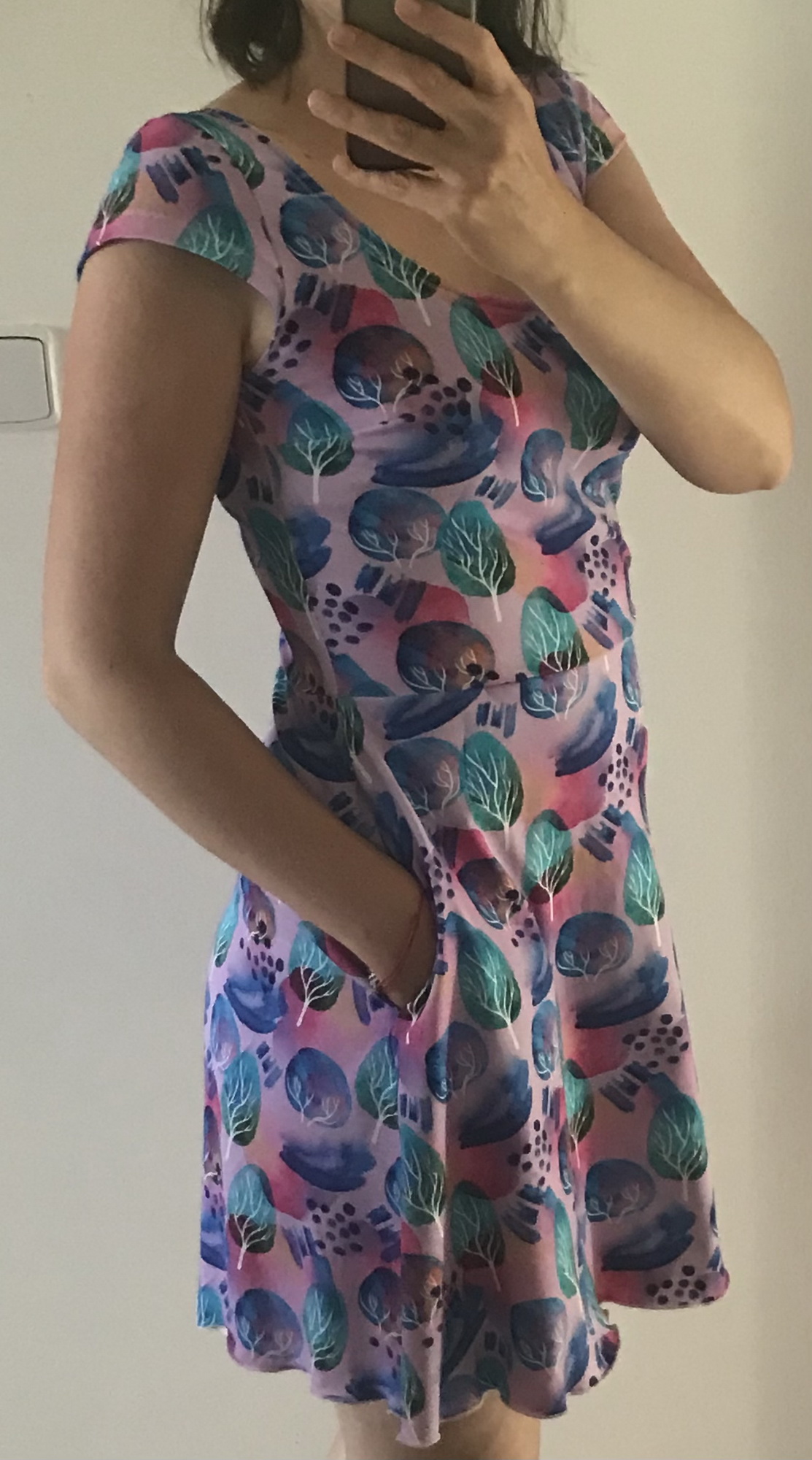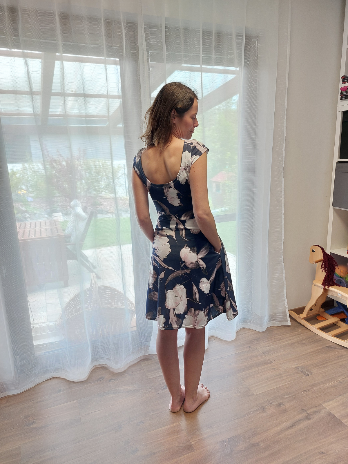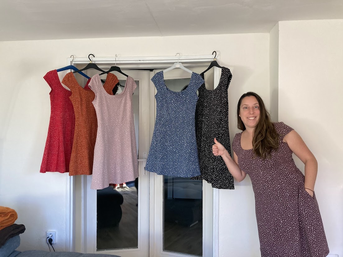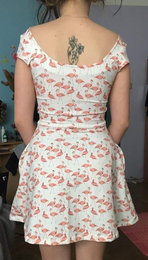 KP: "Tenhle střih je naprosto boží 🤗 kromě těchto šatů, u kterých jsem použila výstřih zadního dílu i na přední díl, prodloužila sukni a lehce i rukávky, abych se v šatech cítila víc podle mých představ 🙃 mám už i dvě trička podle tohoto střihu a jsou moje oblíbená 😊 s výstřihem na zádech působí k sukni velmi elegantně 😉 šila jsem podle videonávodu, poctivě žehlila 😁 a kapsy vůbec neodstávají 😱 za mě naprosto super střih, který krásně sedí 👏 děkujuuu ☺️" *