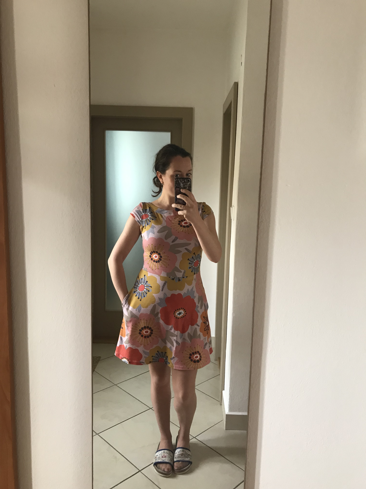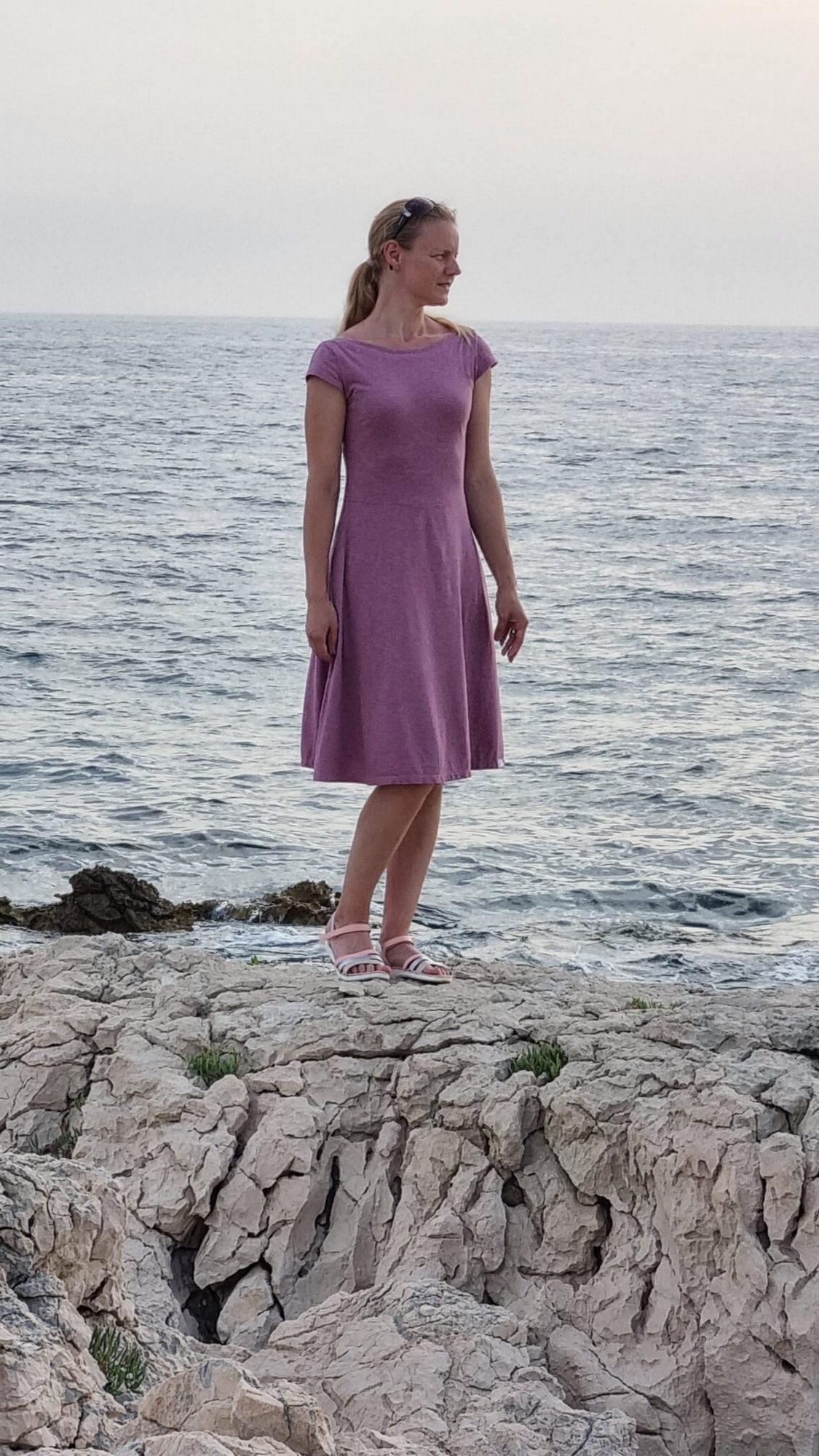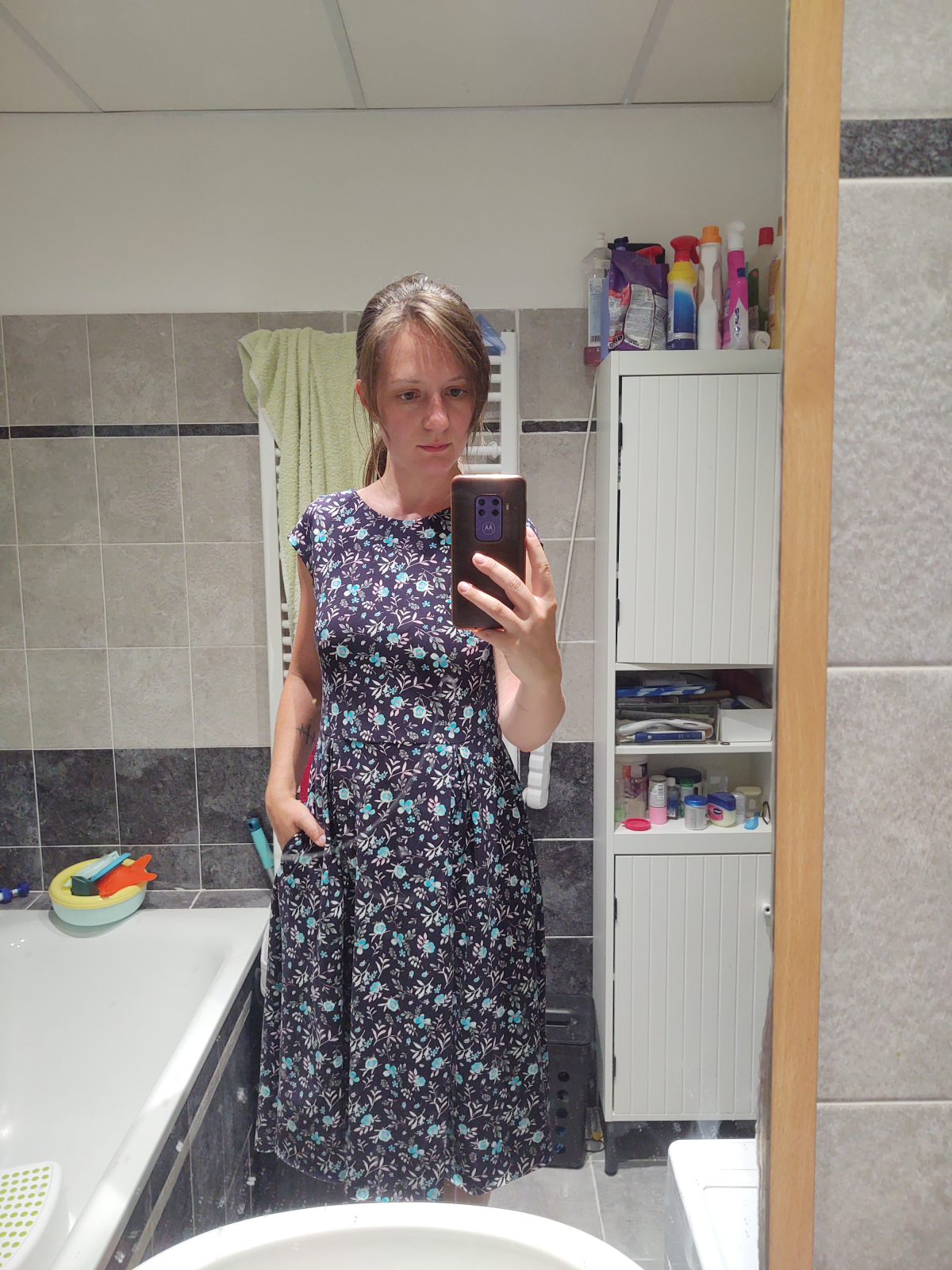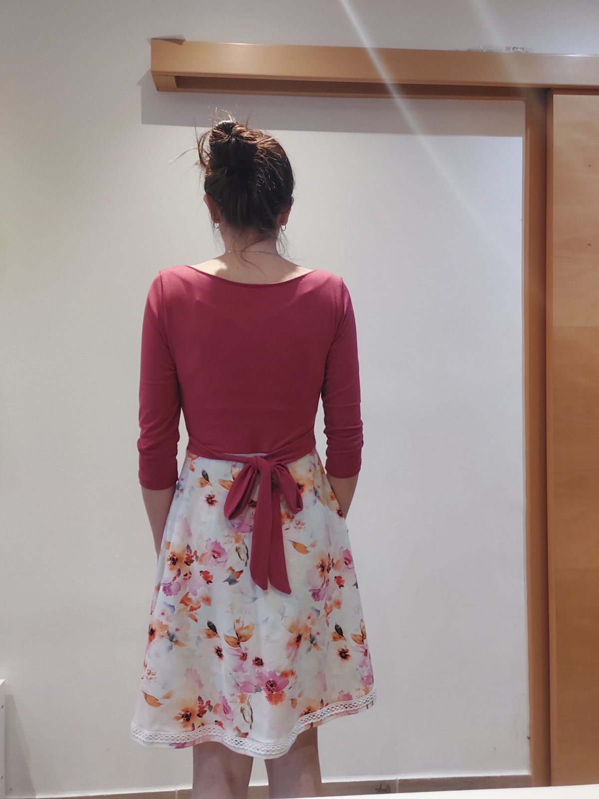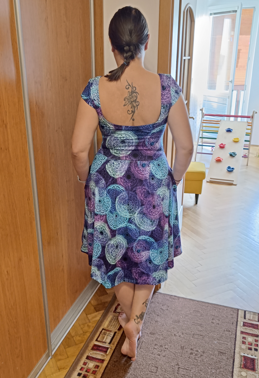 KP: "Tenhle střih je naprosto boží 🤗 kromě těchto šatů, u kterých jsem použila výstřih zadního dílu i na přední díl, prodloužila sukni a lehce i rukávky, abych se v šatech cítila víc podle mých představ 🙃 mám už i dvě trička podle tohoto střihu a jsou moje oblíbená 😊 s výstřihem na zádech působí k sukni velmi elegantně 😉 šila jsem podle videonávodu, poctivě žehlila 😁 a kapsy vůbec neodstávají 😱 za mě naprosto super střih, který krásně sedí 👏 děkujuuu ☺️" *