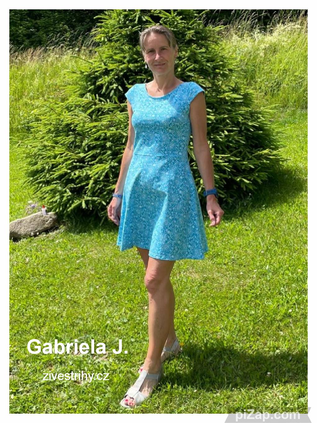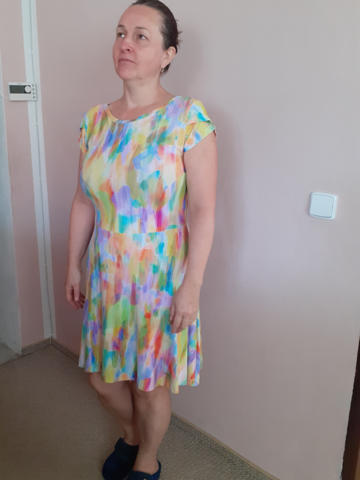 Soňa Horáková: "Moje první Letníny. Šily se dle podrobného návodu moc dobře. Výstřih jsem místo podsádky olemovala proužkem a sedí pěkně. Šaty z tohoto střihu jsou velmi pohodlné a kapsy pro mne hodně využitelné. " *