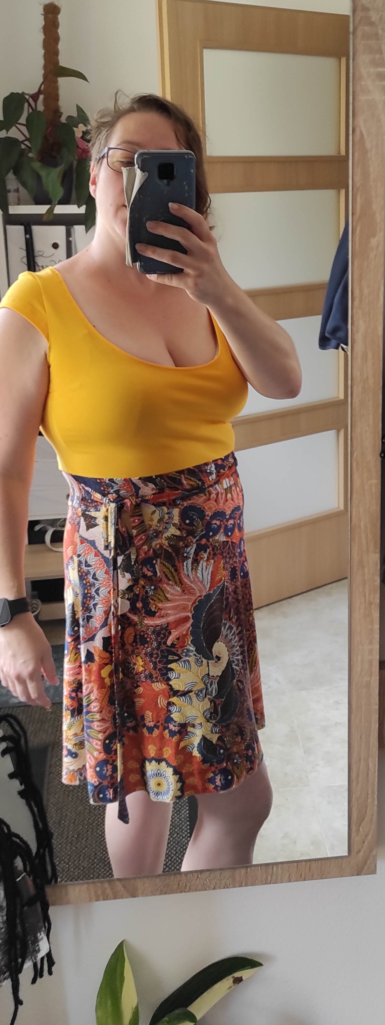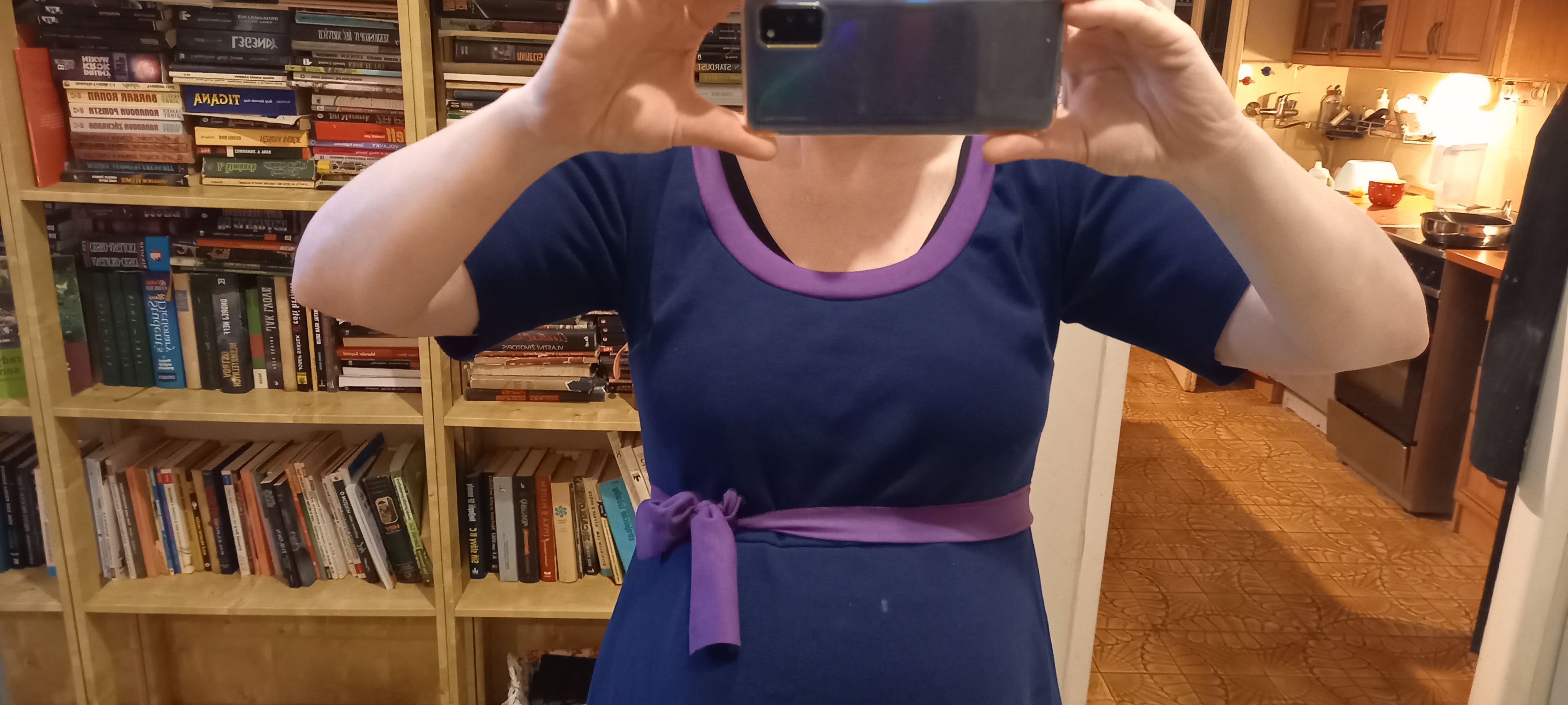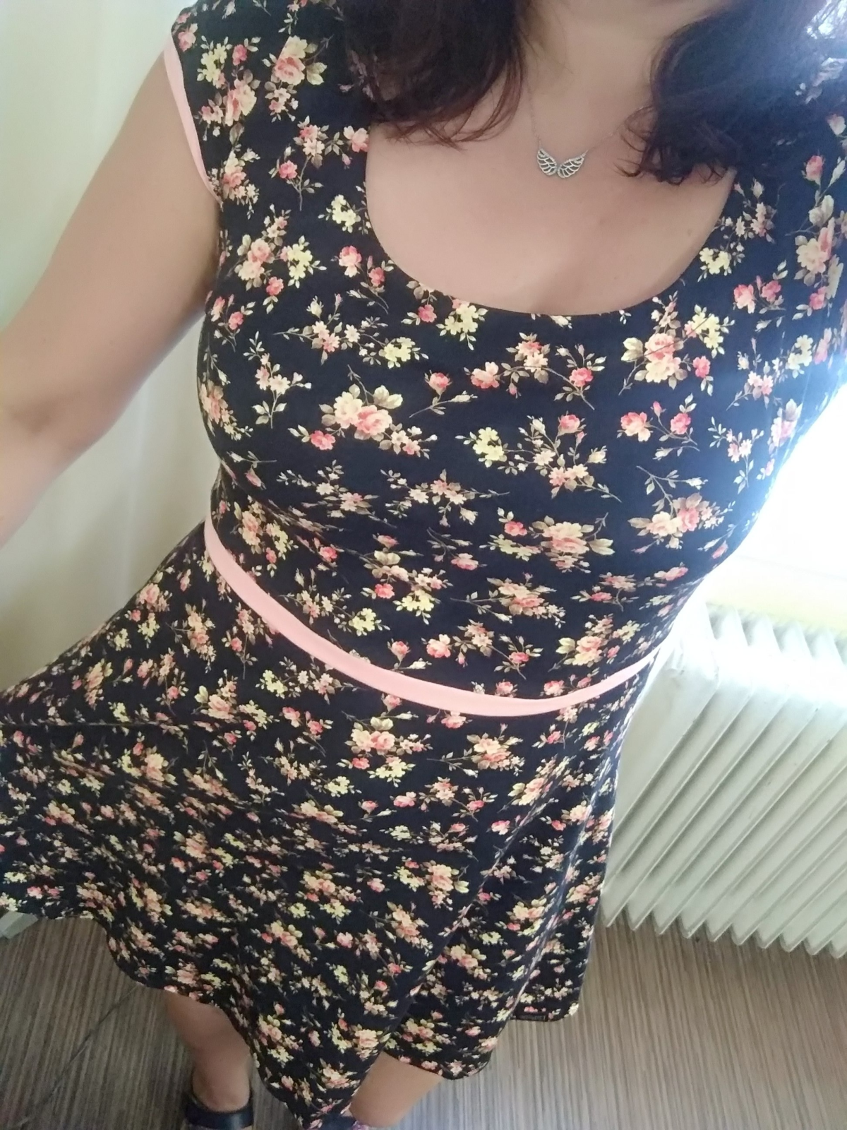 ZB: "Silo se parádně. Nakonec bez kapes. Vložila jsem pásek a mašli. Upravený vrchní díl. Výstřih zvolený na maximum plus další úpravy." *