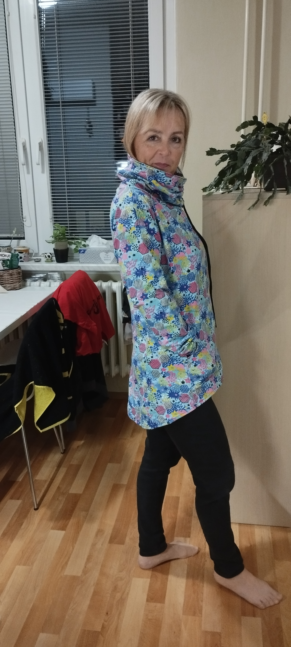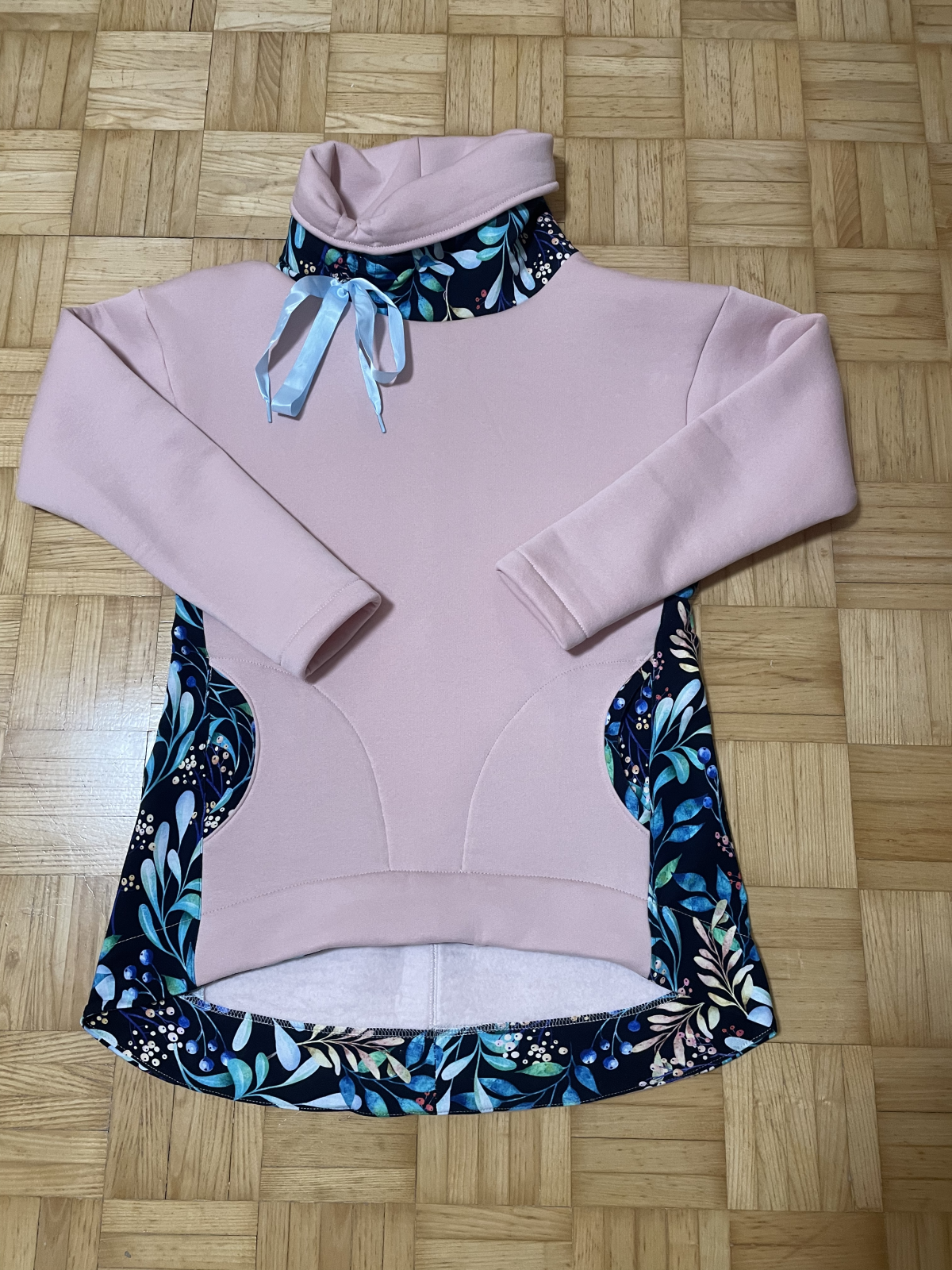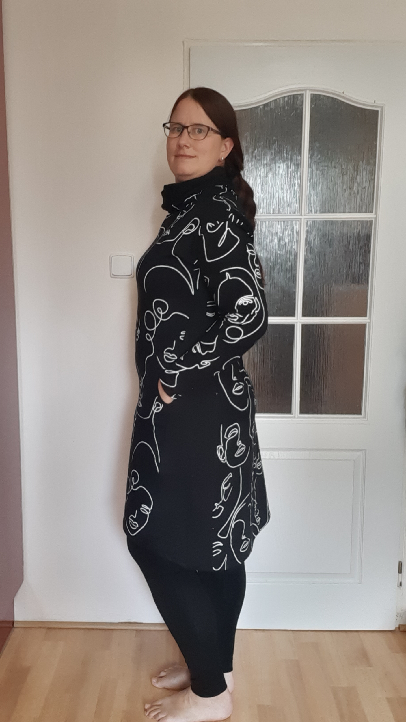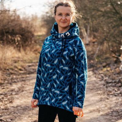 AnnaC: "Návod skvělý. Moje první mikina, pár nepřesností, ale je moje 💪Akorát při prodloužení se nedalo využít přišití kapes do podsádky, už by ten oblouček začínal příliš nízko (takže jsem udělala prošití navíc. Buď na to myslete a kapsy si střihněte větší, nebo by si možná člověk mohl vytvořit váček, pokud nechce aby bylo dno kapsy (prošití navíc) vidět. Jinak mikinu jsem si v konfigurátoru ještě na dolní části zužila dle padnoucího oblečení, (chtěla jsem to jako tuniku k leginám přímo na tělo, což se podařilo), do délky prodloužila na maximum (měřím 179cm) a rukávy také prodlouženy. Nakonec mi ani prodloužená mnou nastavená délka rukávů nestačila, takže jsem si našila "náplety" a je to snimi o to zajímavější 🙂 " *