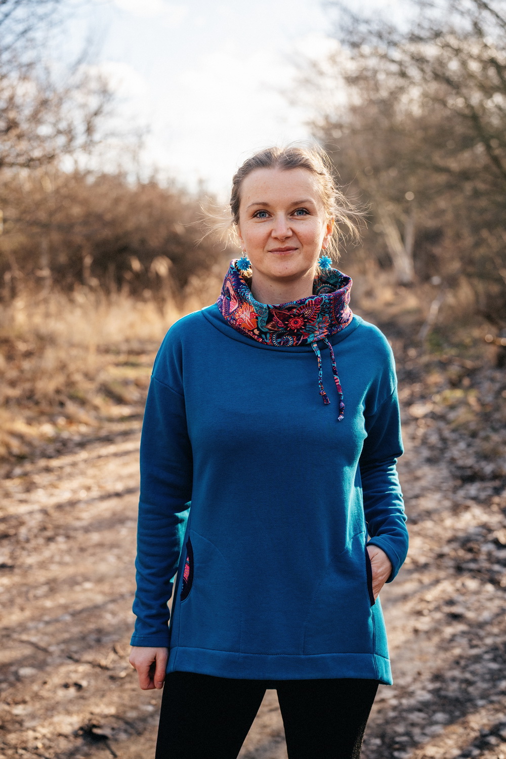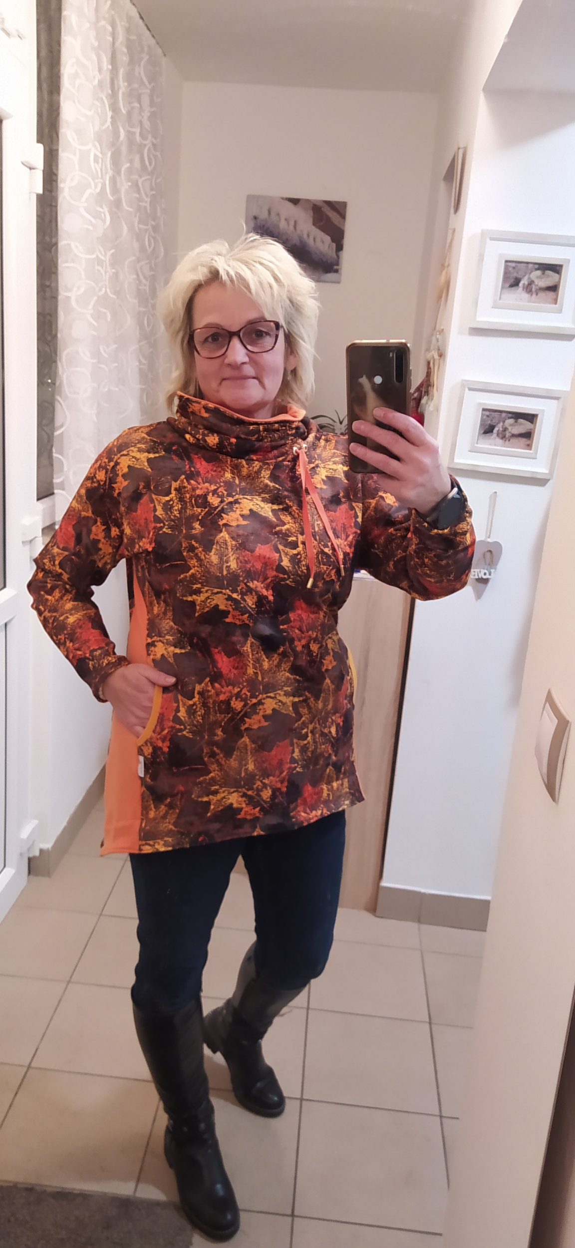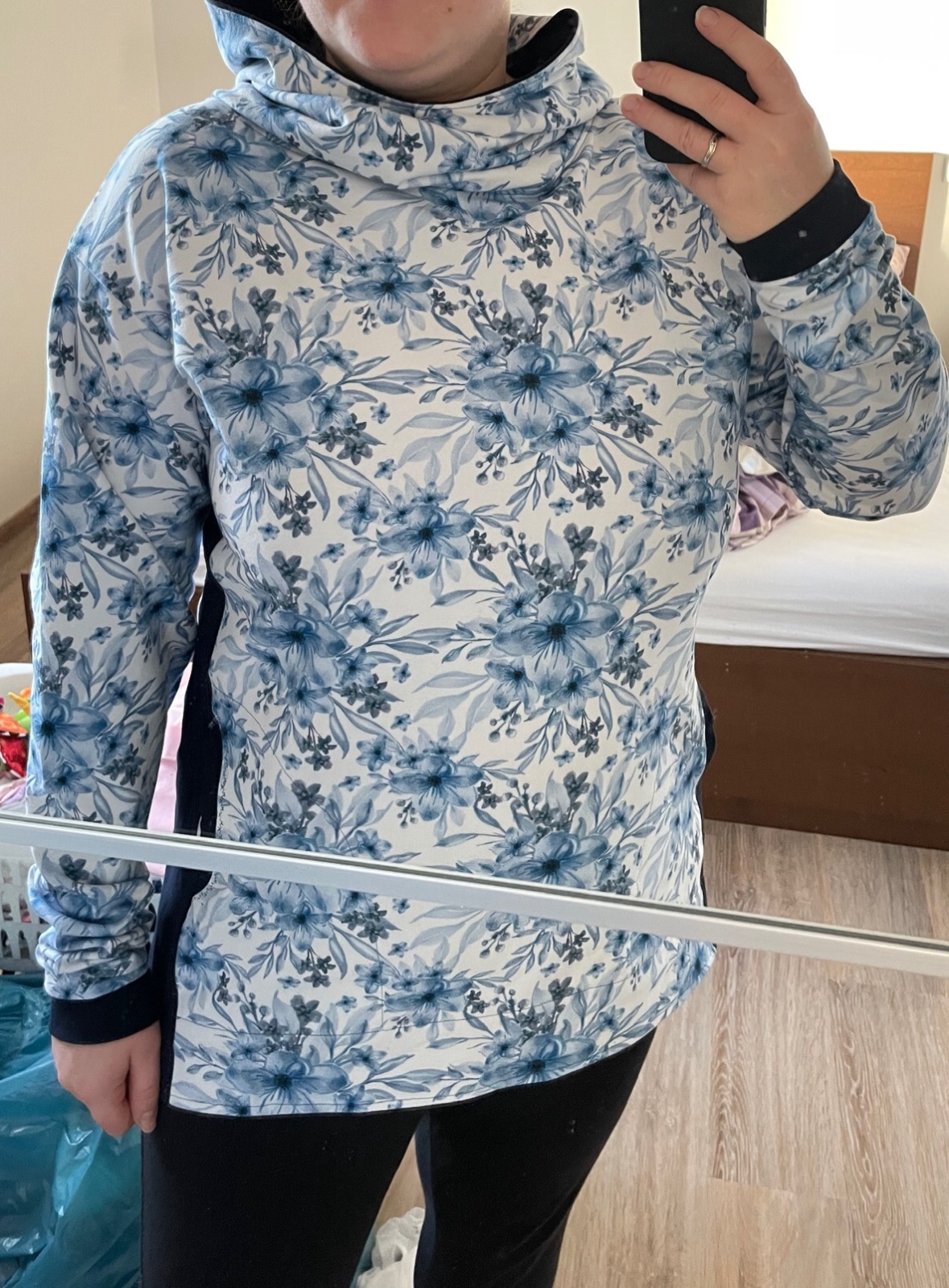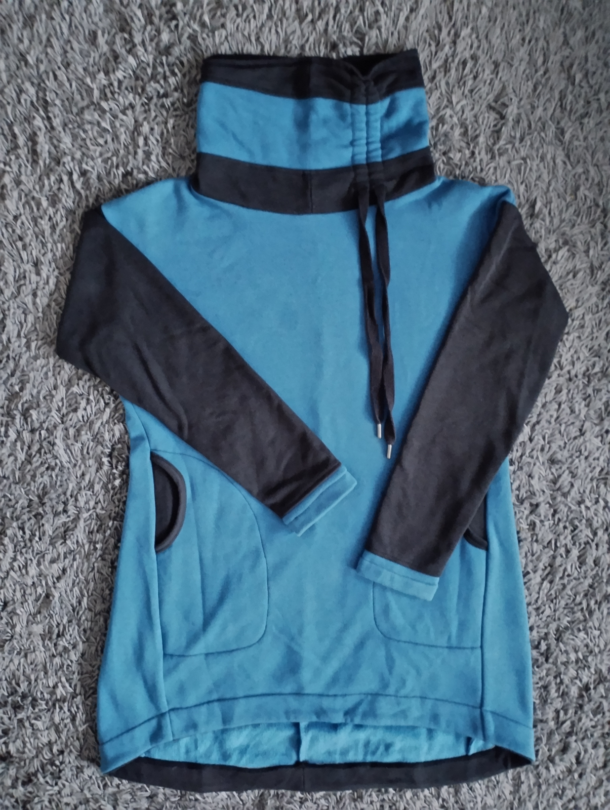 AnnaC: "Návod skvělý. Moje první mikina, pár nepřesností, ale je moje 💪Akorát při prodloužení se nedalo využít přišití kapes do podsádky, už by ten oblouček začínal příliš nízko (takže jsem udělala prošití navíc. Buď na to myslete a kapsy si střihněte větší, nebo by si možná člověk mohl vytvořit váček, pokud nechce aby bylo dno kapsy (prošití navíc) vidět. Jinak mikinu jsem si v konfigurátoru ještě na dolní části zužila dle padnoucího oblečení, (chtěla jsem to jako tuniku k leginám přímo na tělo, což se podařilo), do délky prodloužila na maximum (měřím 179cm) a rukávy také prodlouženy. Nakonec mi ani prodloužená mnou nastavená délka rukávů nestačila, takže jsem si našila "náplety" a je to snimi o to zajímavější 🙂 " *