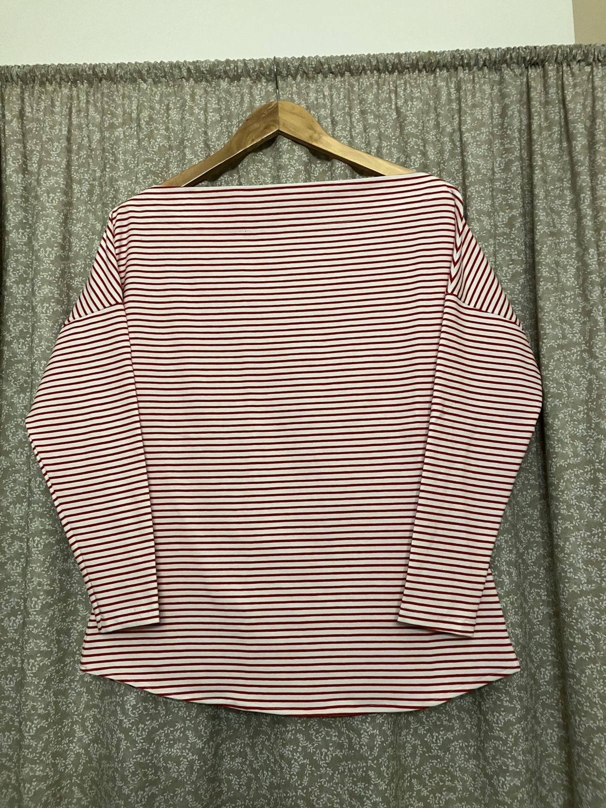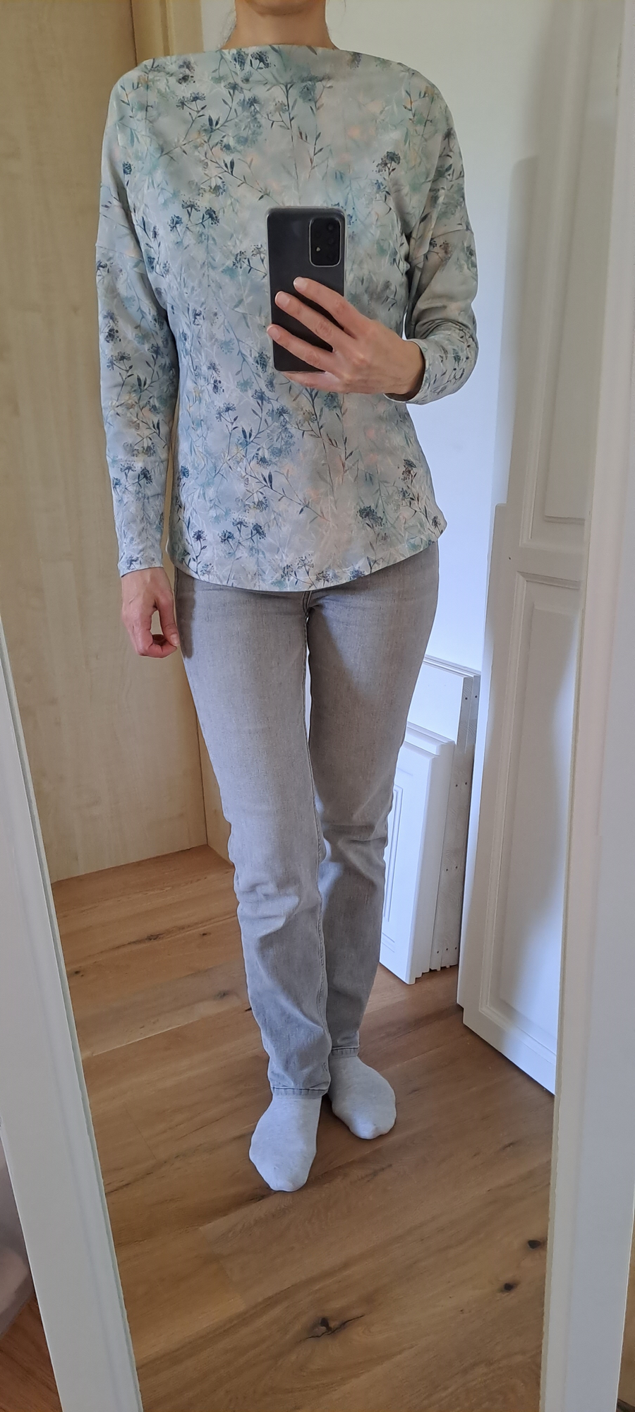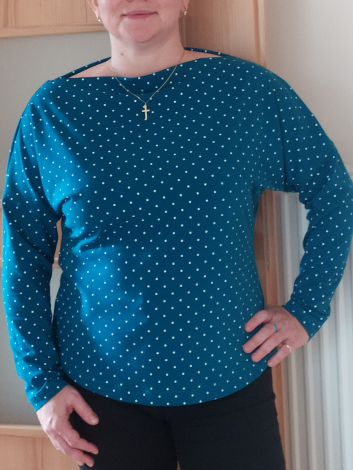 KB: "Strih pěkně sedí, příště bych chtěla zkusit z bavlněné svetroviny, ale možná střihnu o číslo menší, ať mi tak nepadá z ramen (resp ať není ten výstřih tak široký). K sukni se da pěkně podkasat, na fotku jsem jej ale nechávala v originální délce. Svetřík se šil celkem rychle, podsádku jsem nepřišívala a je to úplně v pohodě- upravím po oblečení a pak už drží tam, kde má. " *
