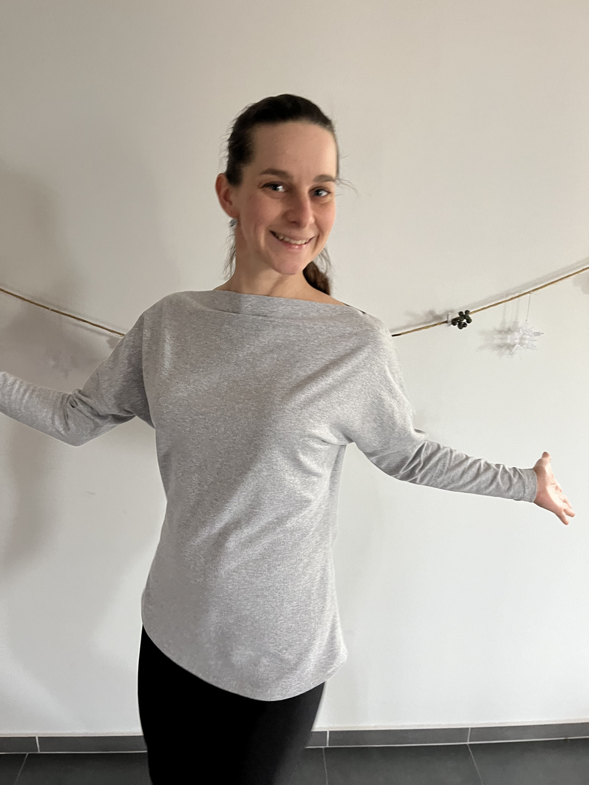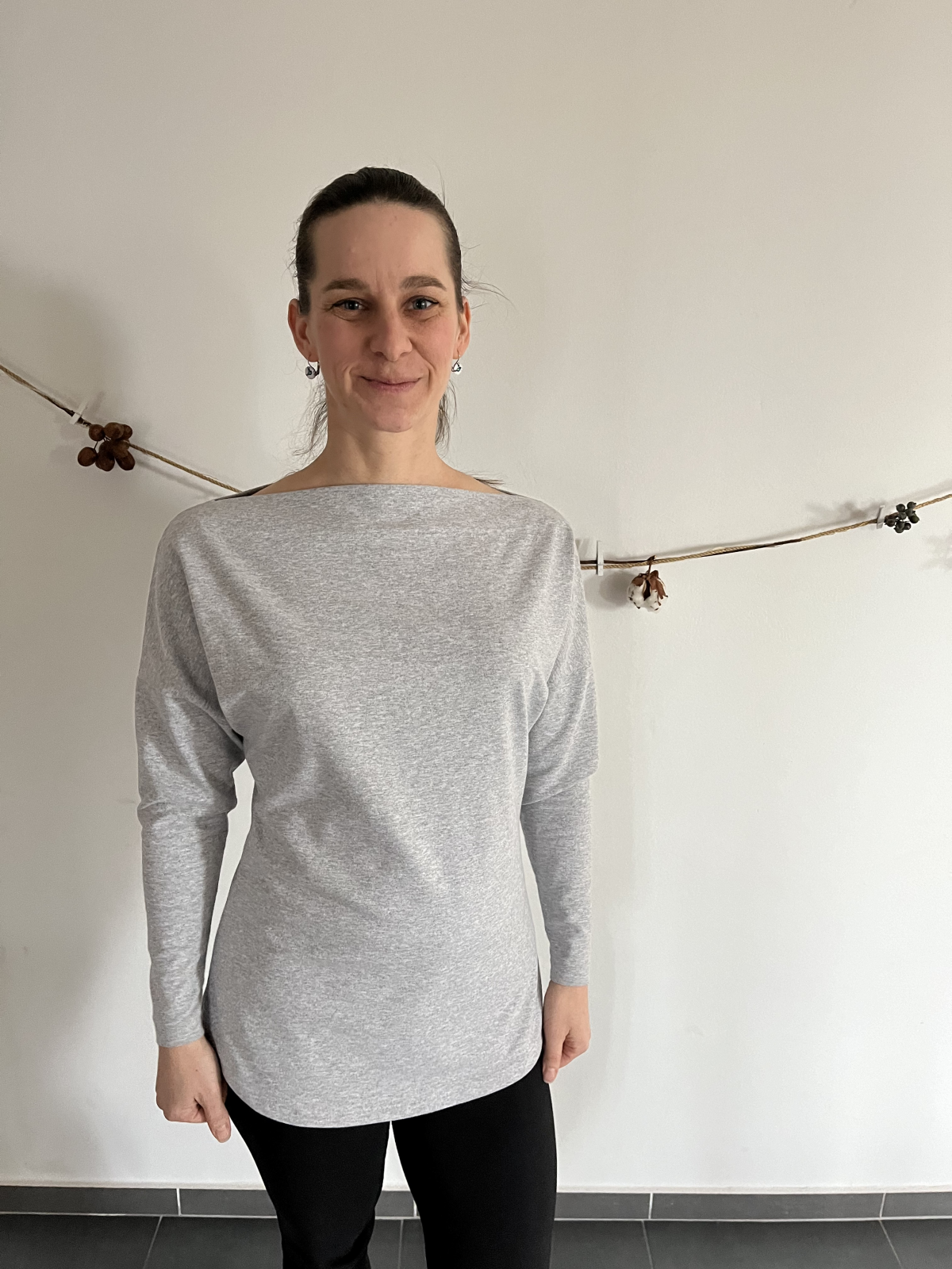 LN: "Střih velmi jednoduchý na ušití, video návod jako vždy super. Materiál jsem vybírala tak, aby mikina připomínala svetr. Mikina krásně sedí, líbí se mi, jak kopíruje postavu. Měla jsem trochu obavy, že bude výstřih příliš rovný, ale je to v pořádku. Rozhodně to je můj nejoblíbenější kousek na nadcházející zimní sezónu." *