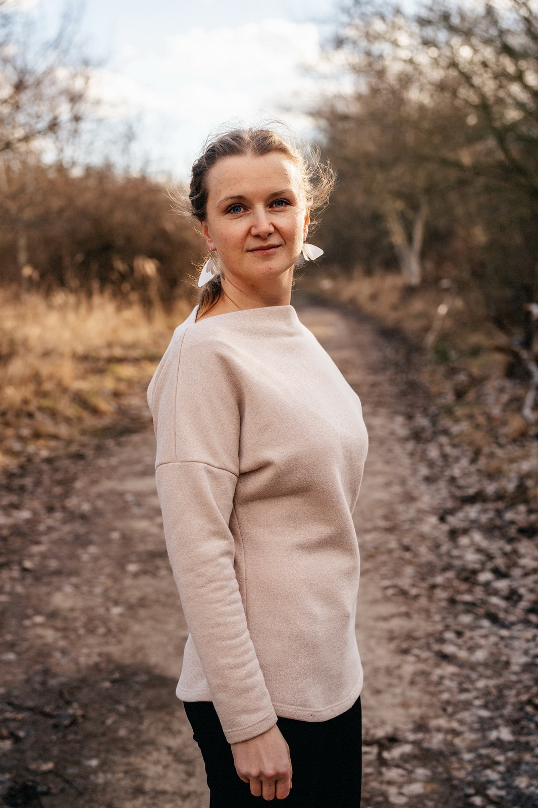 „Střih velmi jednoduchý na ušití, video návod jako vždy super. Materiál jsem vybírala tak, aby mikina připomínala svetr. Mikina krásně sedí, líbí se mi, jak kopíruje postavu. Měla jsem trochu obavy, že bude výstřih příliš rovný, ale je to v pořádku. Rozhodně to je můj nejoblíbenější kousek na nadcházející zimní sezónu.“