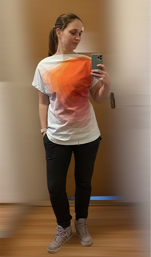 Evik: "Jelikoz jsem vysoka 177cm, ne vzdy mi vse sedi, strih jsem si tedy upravila na miru. Jedine, co jsem upravovala podle sebe, byl spodni lem mikiny, ktery jsem na bocich zakoncila rovne. Dle strihu mi kuriozne odstavala do stran, proto jsem srovnala do rovna. Sedi krasne. S videonavodem to slo jedna basen. " *