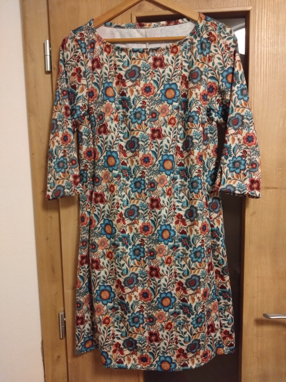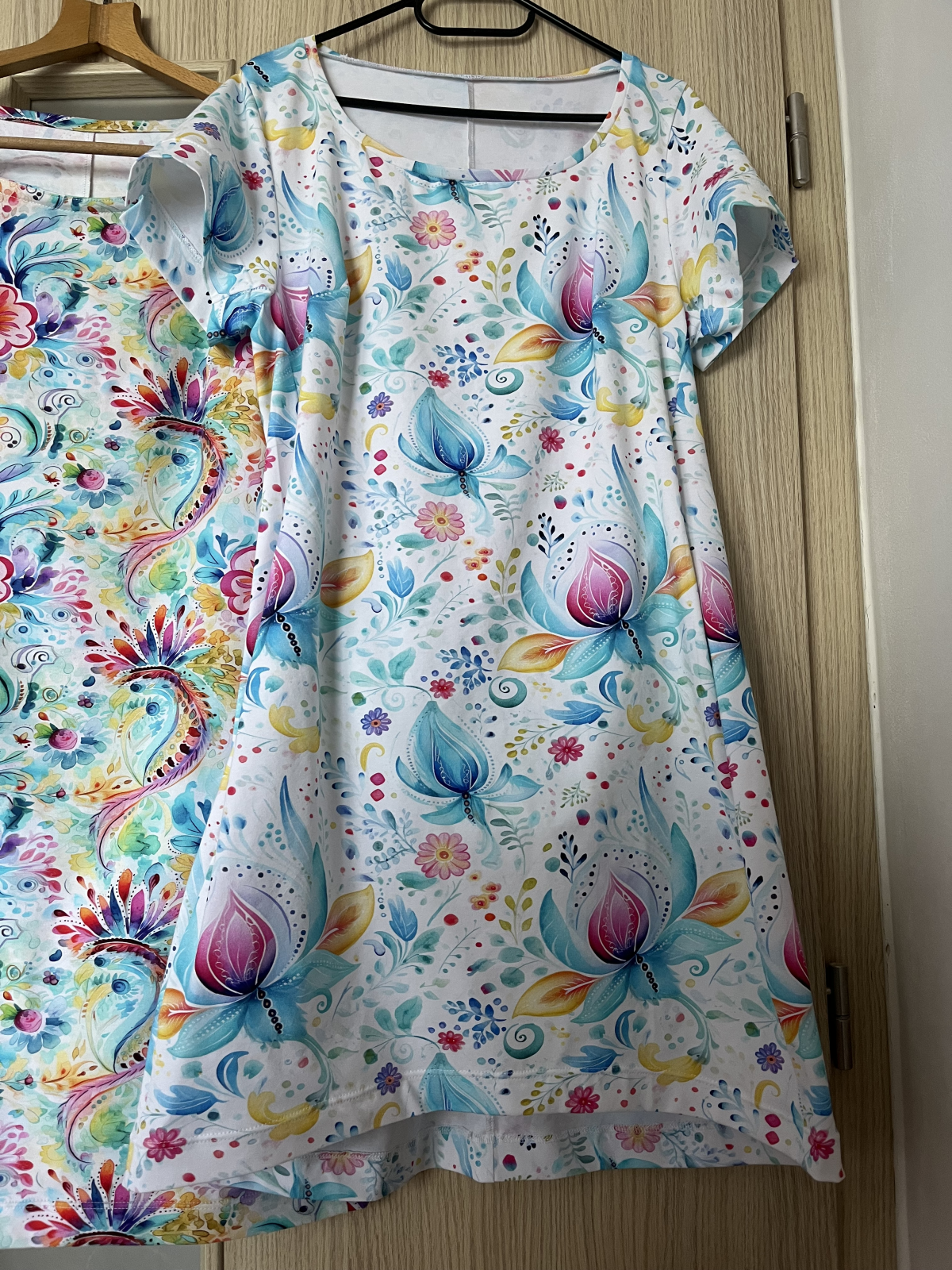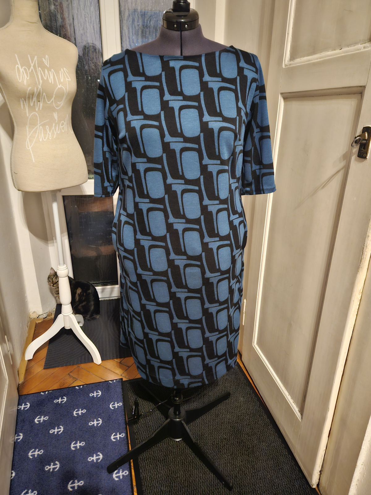 Je nutné použít pružný materiál - my šili z punta royal (340 g/m2). Punto jsme zvolili proto, že působí elegantněji než bavlněný úplet. Je možné sáhnout i po tenčí teplákovině. Pokud zvolíte pružnou teplákovinu s elastanem, vyjdou volnější šaty - takové mikino-šaty. Pokud chcete šaty na tělo, sáhněte po velikosti o 1 menší. Střih jsme testovali a šili primárně z punta a to je pevnější než teplákovina.