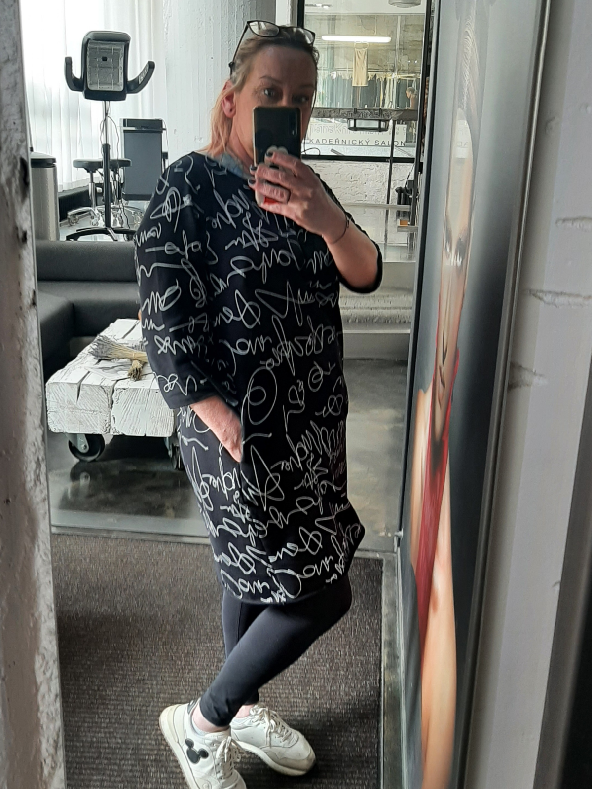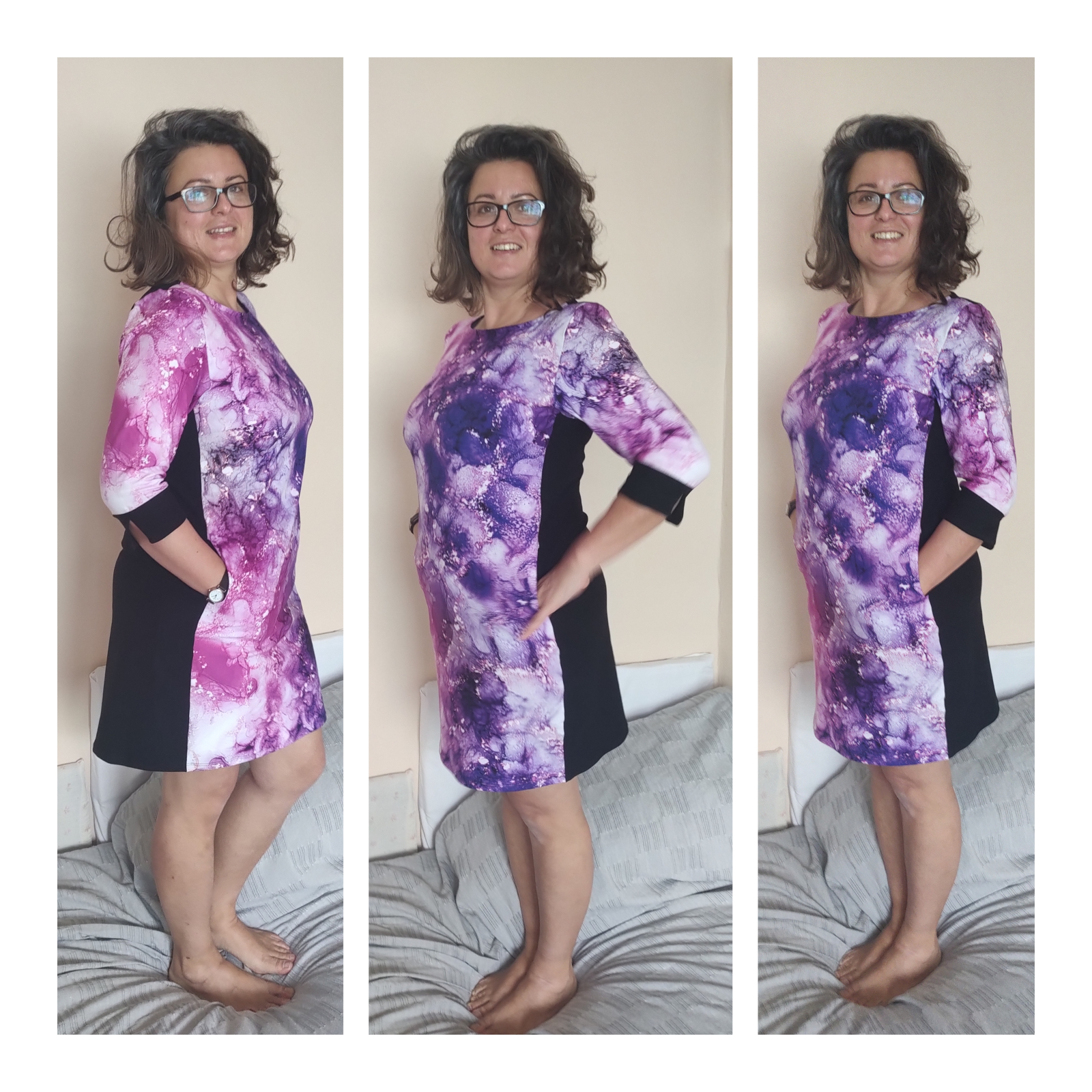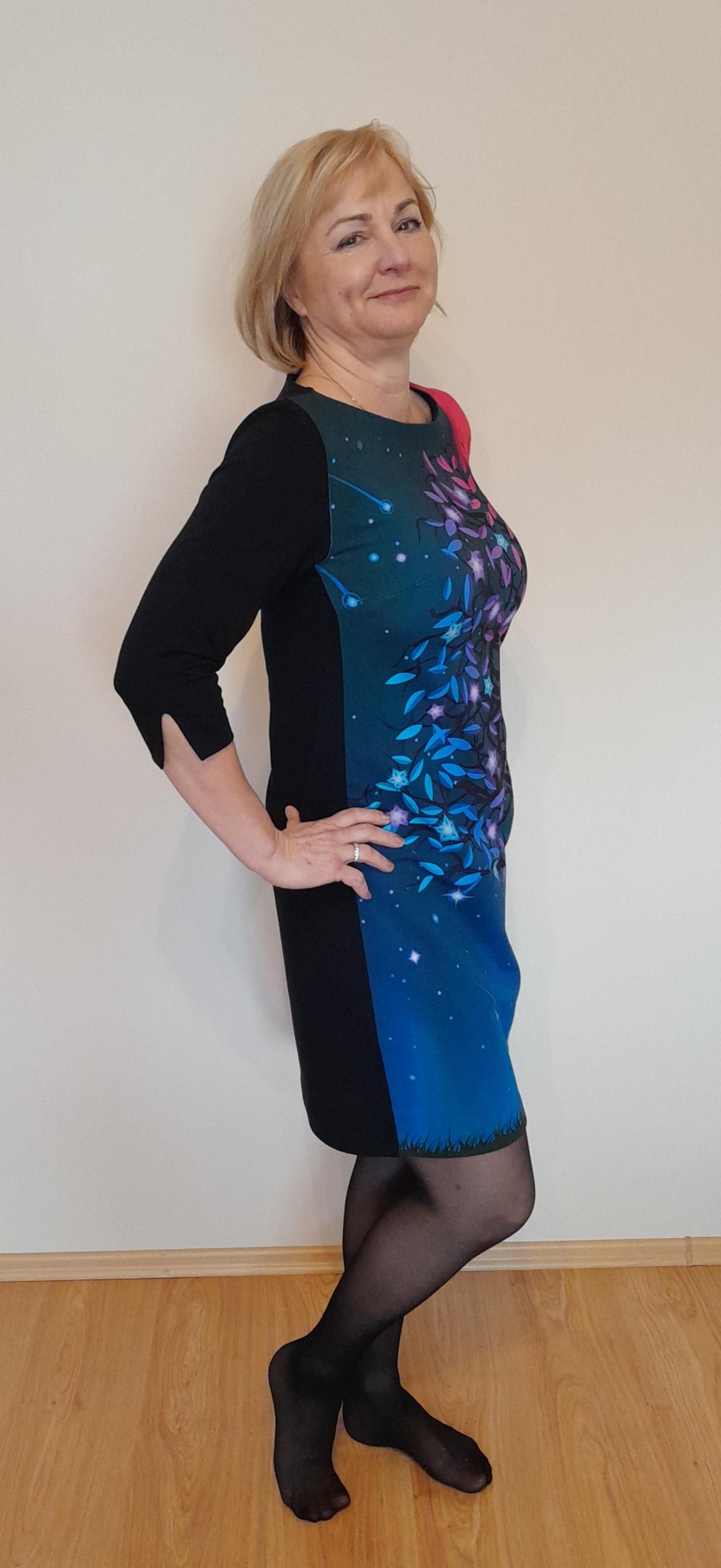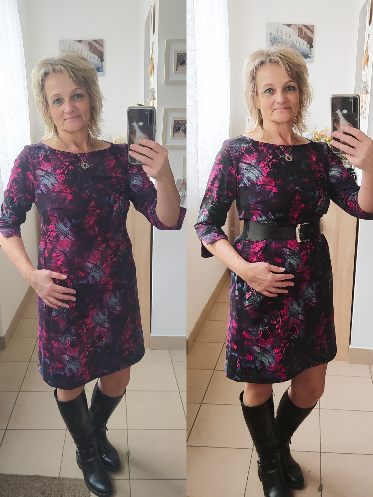 Jsou to šaty, které díky své délce i střihu jdou nosit jak s legíny tak bez nich. Délka rukávu je praktická a zakončená úžasnou manžetou, která vás bude při šití bavit svou jednoduchostí a při nošení vám zajistí veškerý komfort ať už ji ohrnete nebo necháte směrem dolů jako rozparek. Pouzdrové šaty mají lehce projmutý pas, v předním díle jsou všité důmyslné kapsy, které jsme vymysleli tak, že partii bříška nepřidávají, a váčky se nekrčí. Jejich snadné šití díky videonávodu zvládne každá hobby švadlenka.