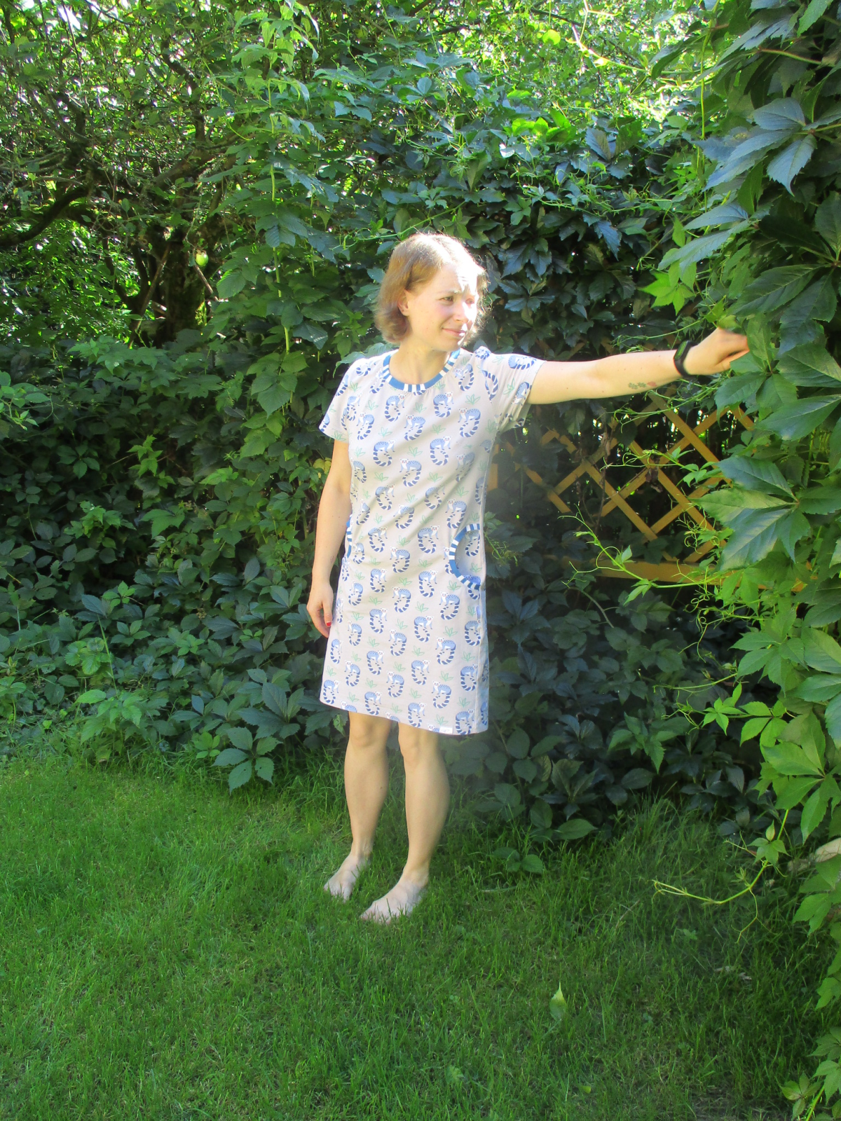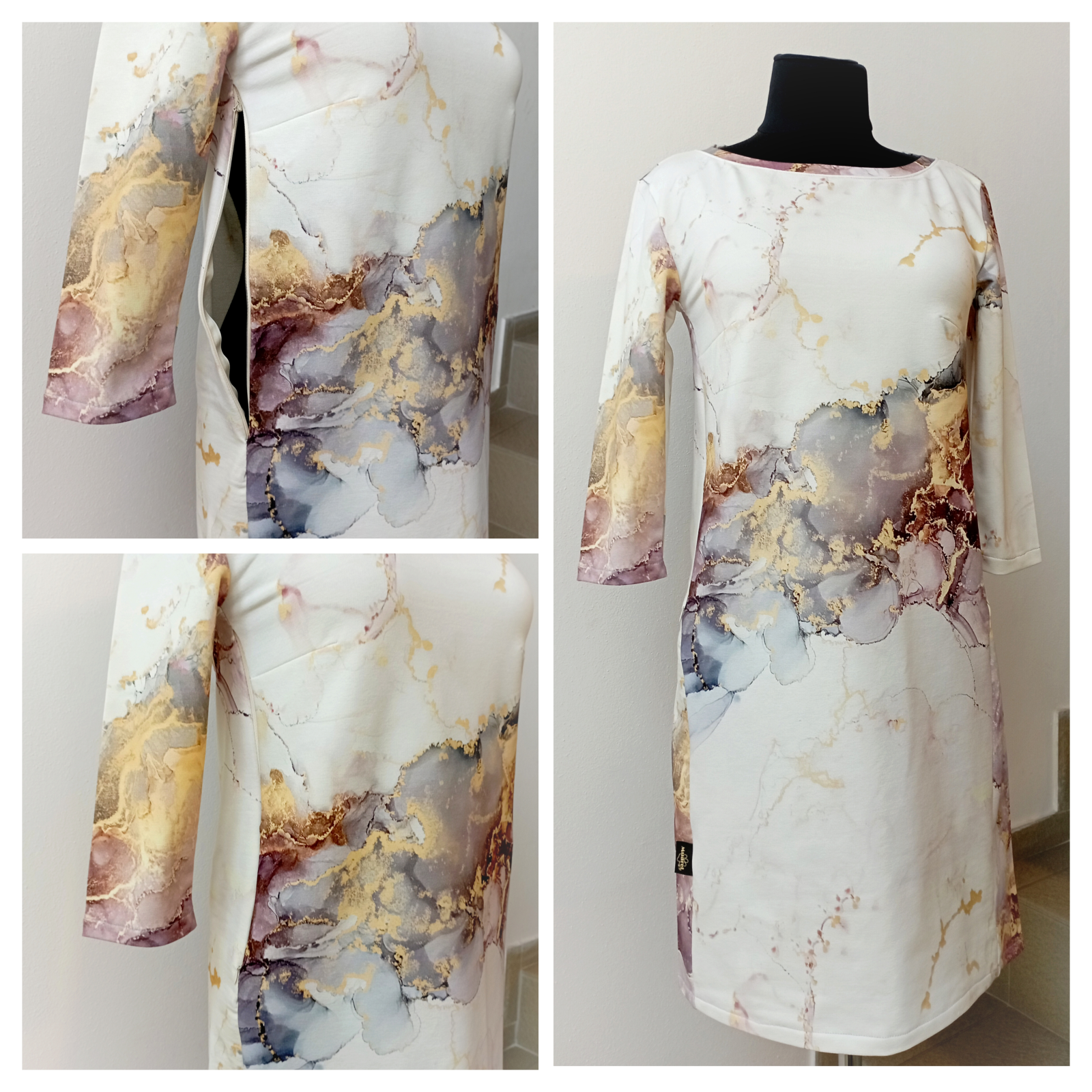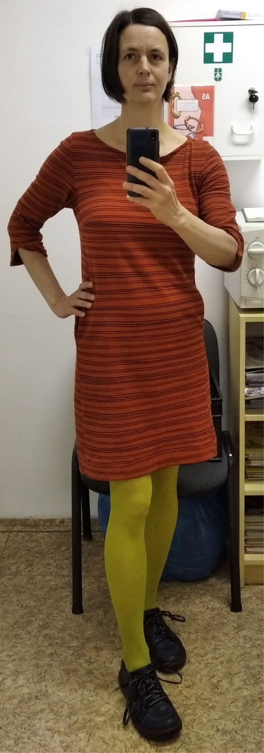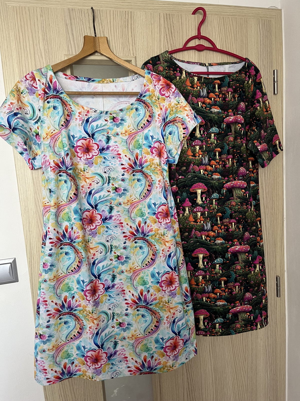 Jsou to šaty, které díky své délce i střihu jdou nosit jak s legíny tak bez nich. Délka rukávu je praktická a zakončená úžasnou manžetou, která vás bude při šití bavit svou jednoduchostí a při nošení vám zajistí veškerý komfort ať už ji ohrnete nebo necháte směrem dolů jako rozparek. Pouzdrové šaty mají lehce projmutý pas, v předním díle jsou všité důmyslné kapsy, které jsme vymysleli tak, že partii bříška nepřidávají, a váčky se nekrčí. Jejich snadné šití díky videonávodu zvládne každá hobby švadlenka.