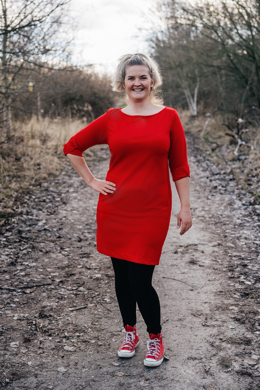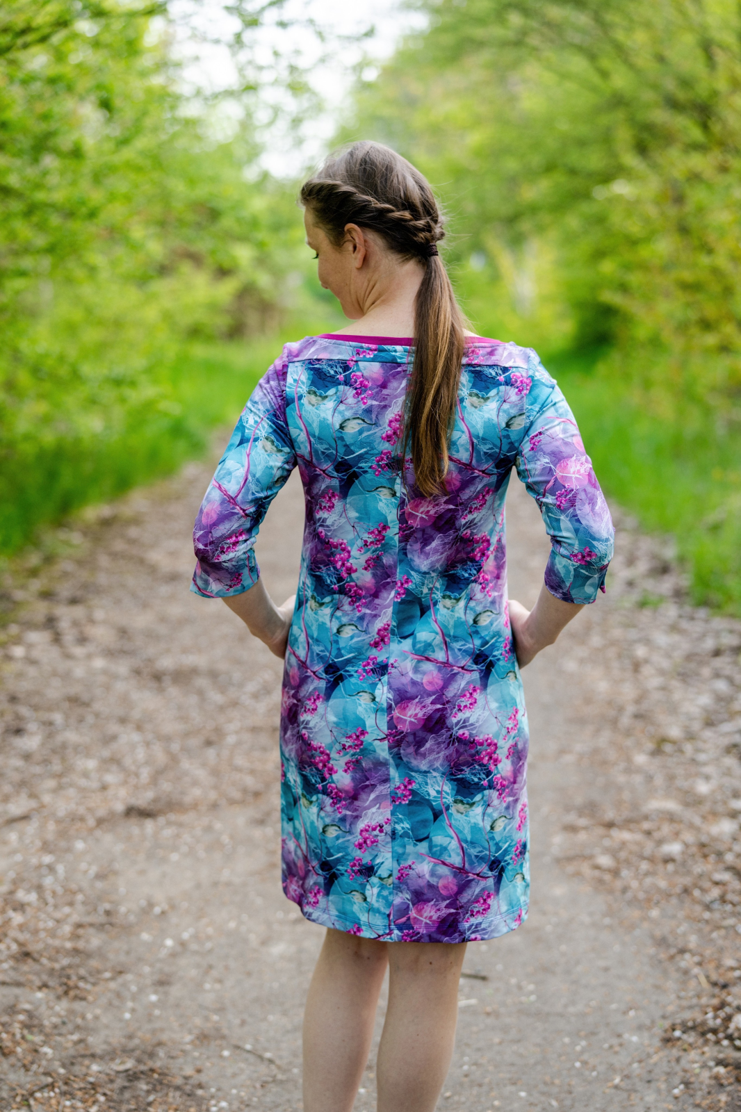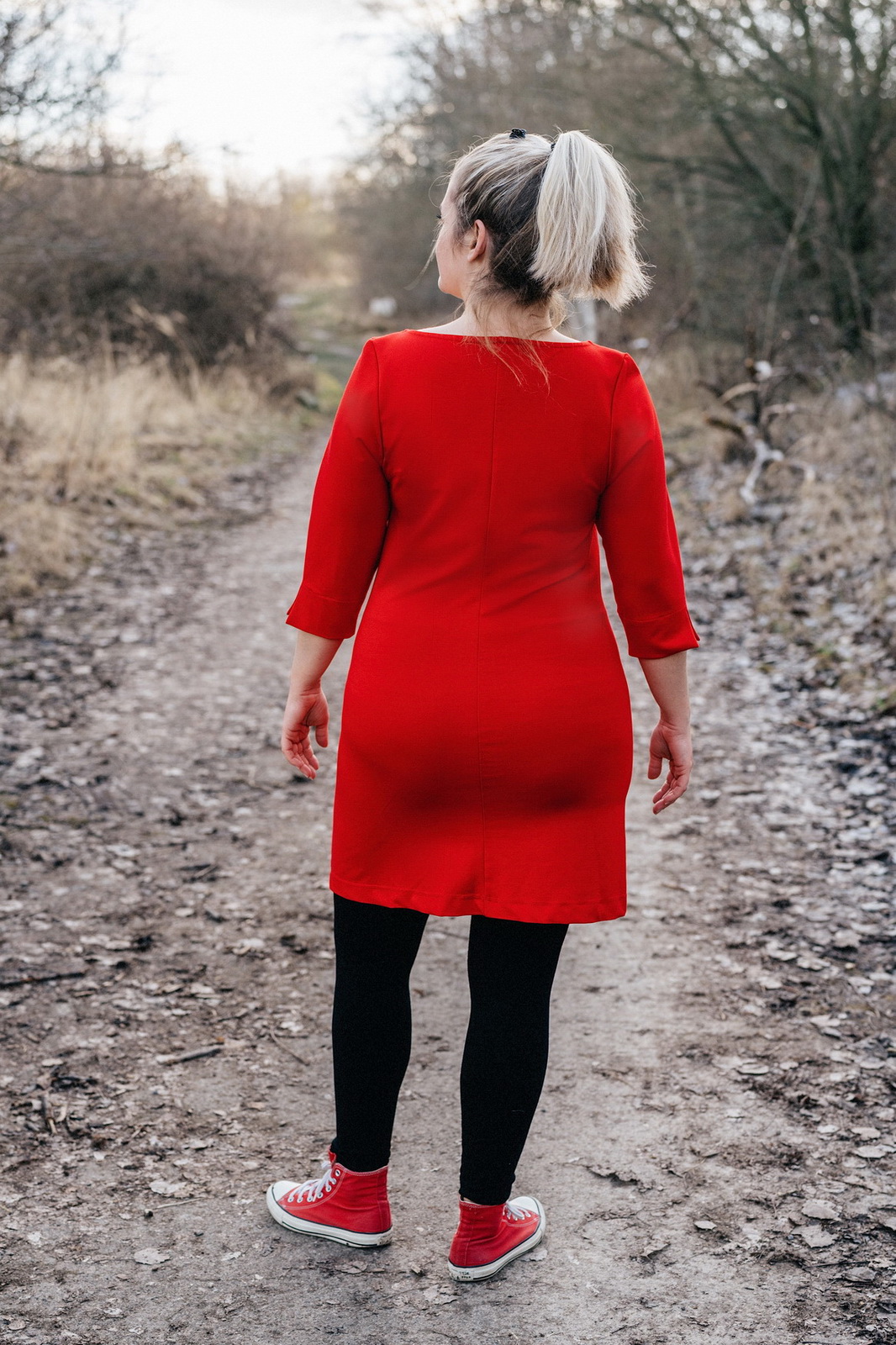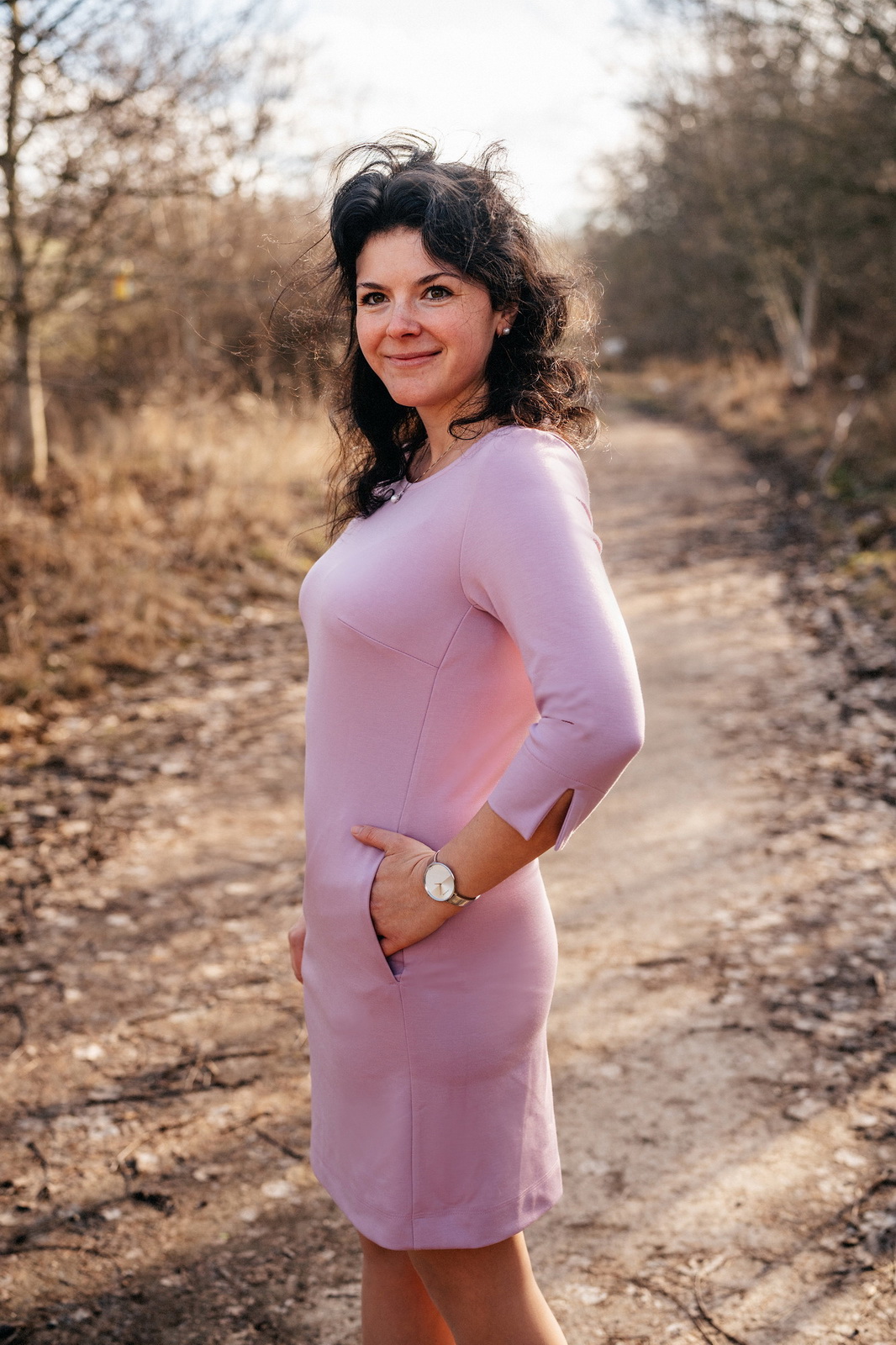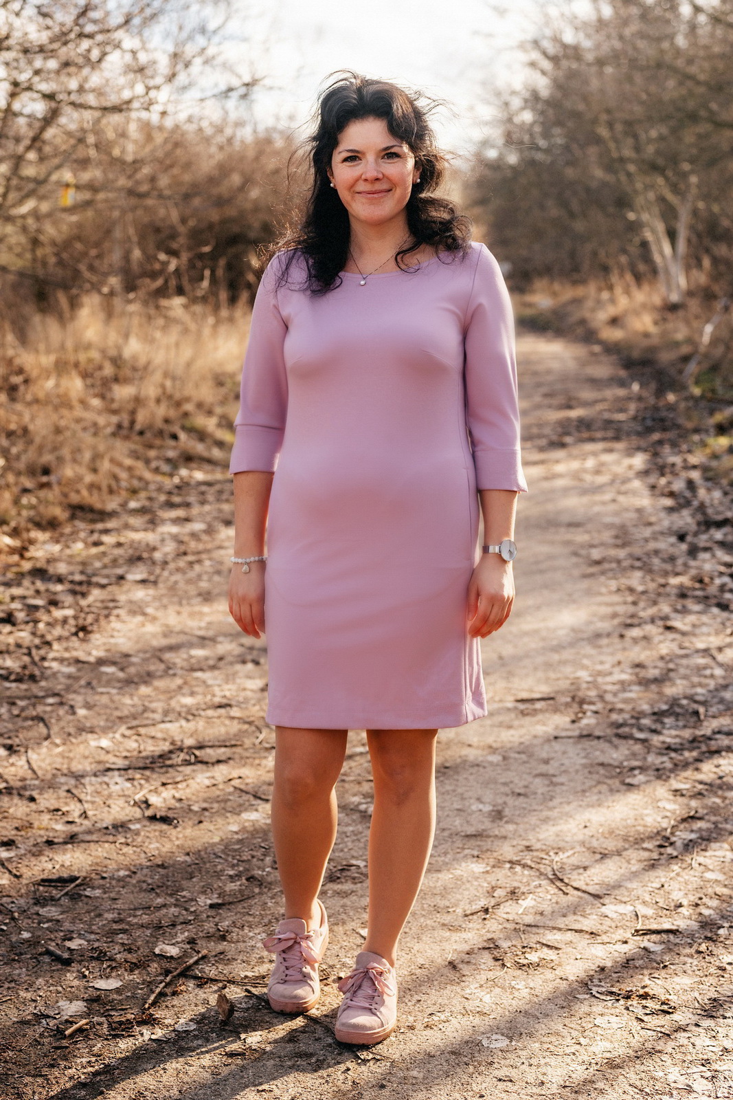 Jsou to šaty, které díky své délce i střihu jdou nosit jak s legíny tak bez nich. Délka rukávu je praktická a zakončená úžasnou manžetou, která vás bude při šití bavit svou jednoduchostí a při nošení vám zajistí veškerý komfort ať už ji ohrnete nebo necháte směrem dolů jako rozparek. Pouzdrové šaty mají lehce projmutý pas, v předním díle jsou všité důmyslné kapsy, které jsme vymysleli tak, že partii bříška nepřidávají, a váčky se nekrčí. Jejich snadné šití díky videonávodu zvládne každá hobby švadlenka.