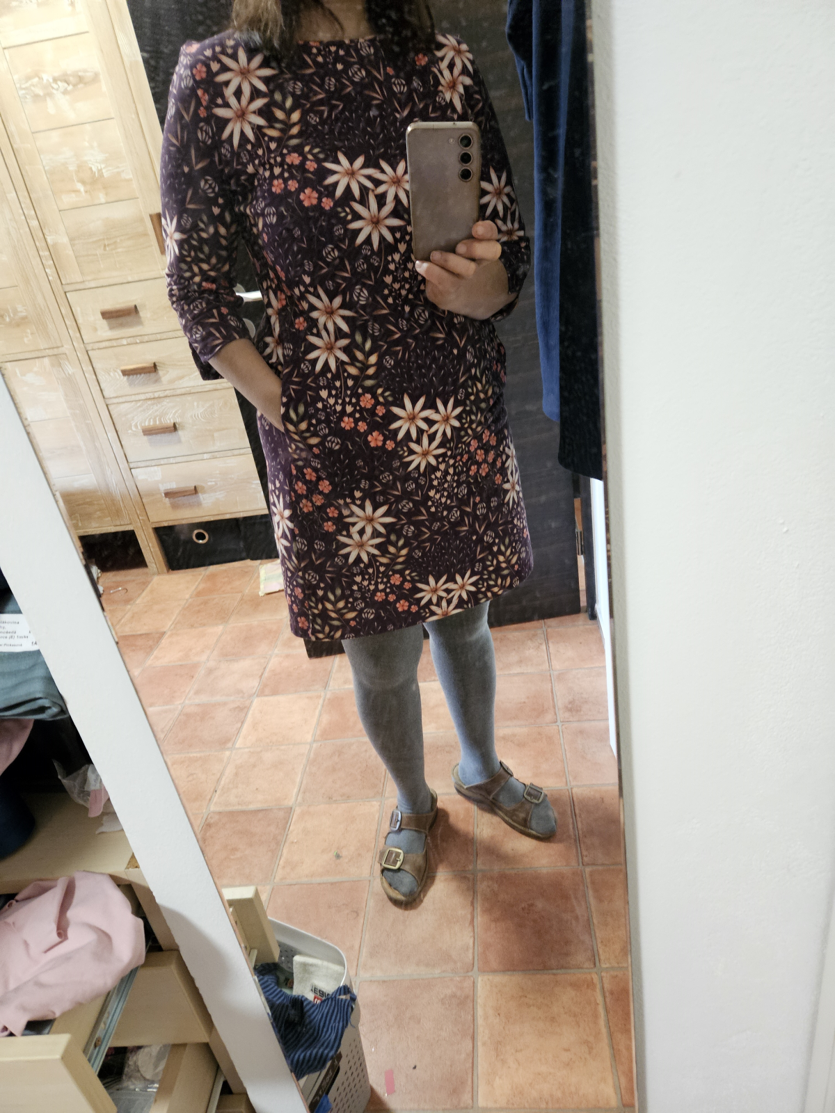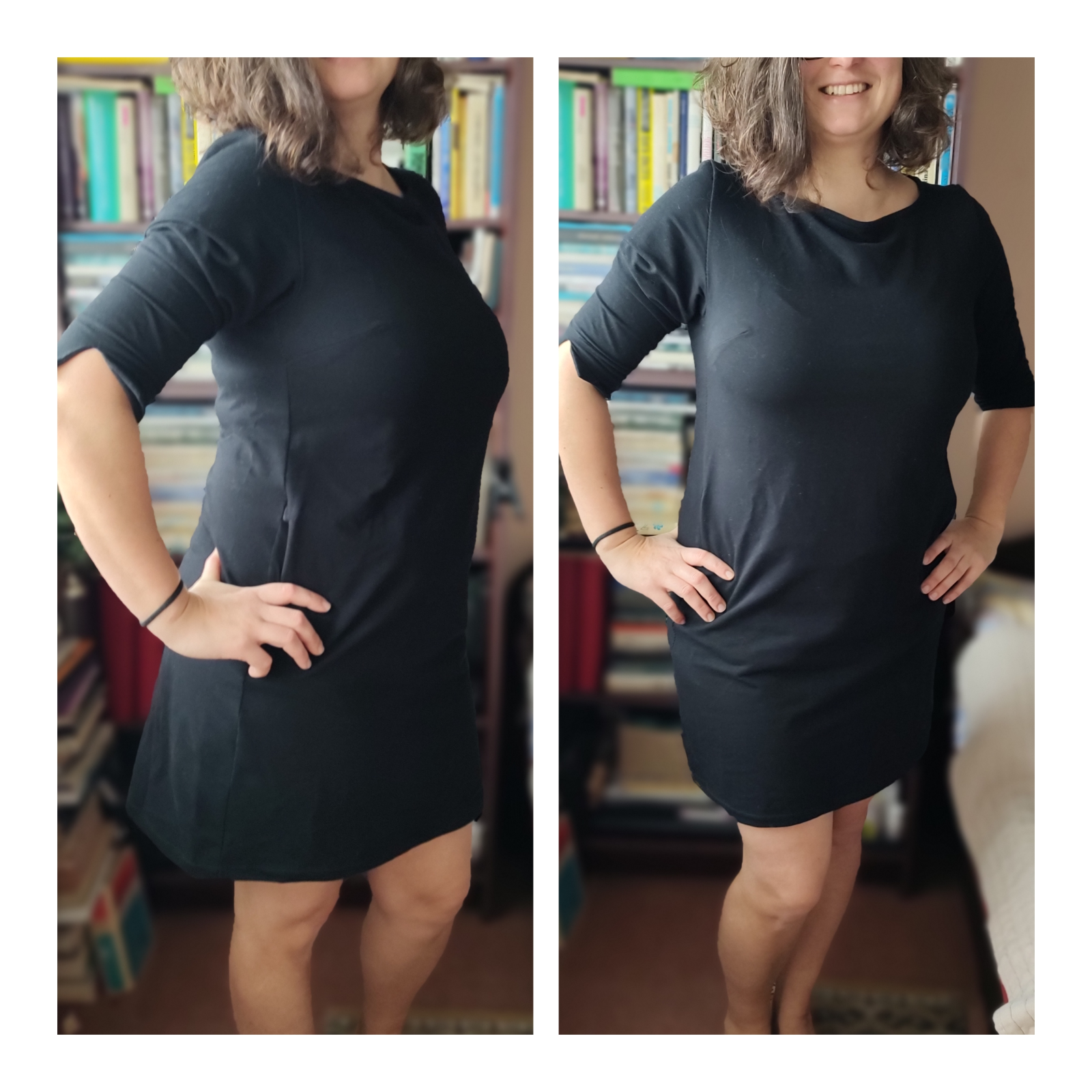 LH: "Troje šaty, 3 různé výstřihy - houby přesně dle návodu - jediné se mi nepovedlo a budu předělávat, oboje barevné šaty s prohloubeným průkrčníkem - jedny s podsádkou, jedny olemované proužkem napůl. Rukávy jsem zkrátila, rozparky jsou páradní i v krátké verzi, moc se mi líbí. Kapsa se ani jednou nepovedla, aby byla dle mých představ, udělám z ní klasické nebo půjdou pryč. Zakončení šatů 3cm a u třetích šatů s kratším PD a delším ZD. Celkově je střih opravdu lichotivý postavě, krásně sedí akorát příště bez kapsy 😄" *
