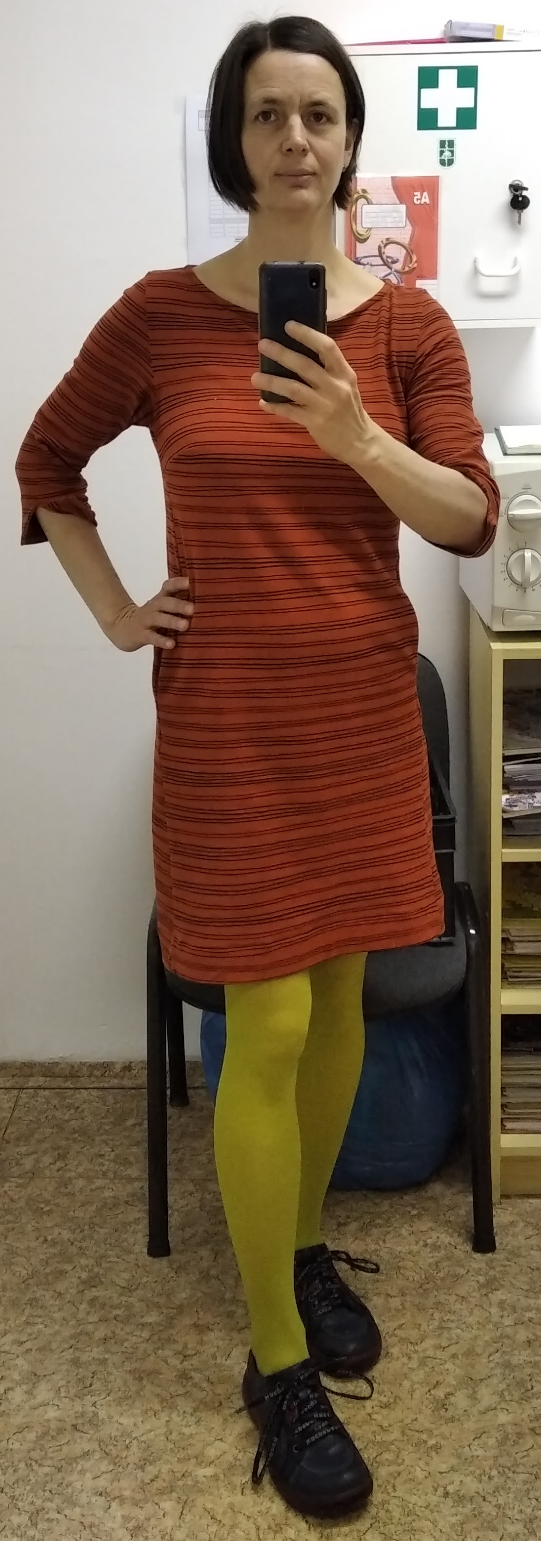 Eliška Havlová: "Super jednoduché šaty, které muzou být elegantní nebo sportovní podle použitého materiálu. Prukrcnik volen proužkem jelikož na me byl moc velký i vzhledem k teplejšímu materiálu. " *
