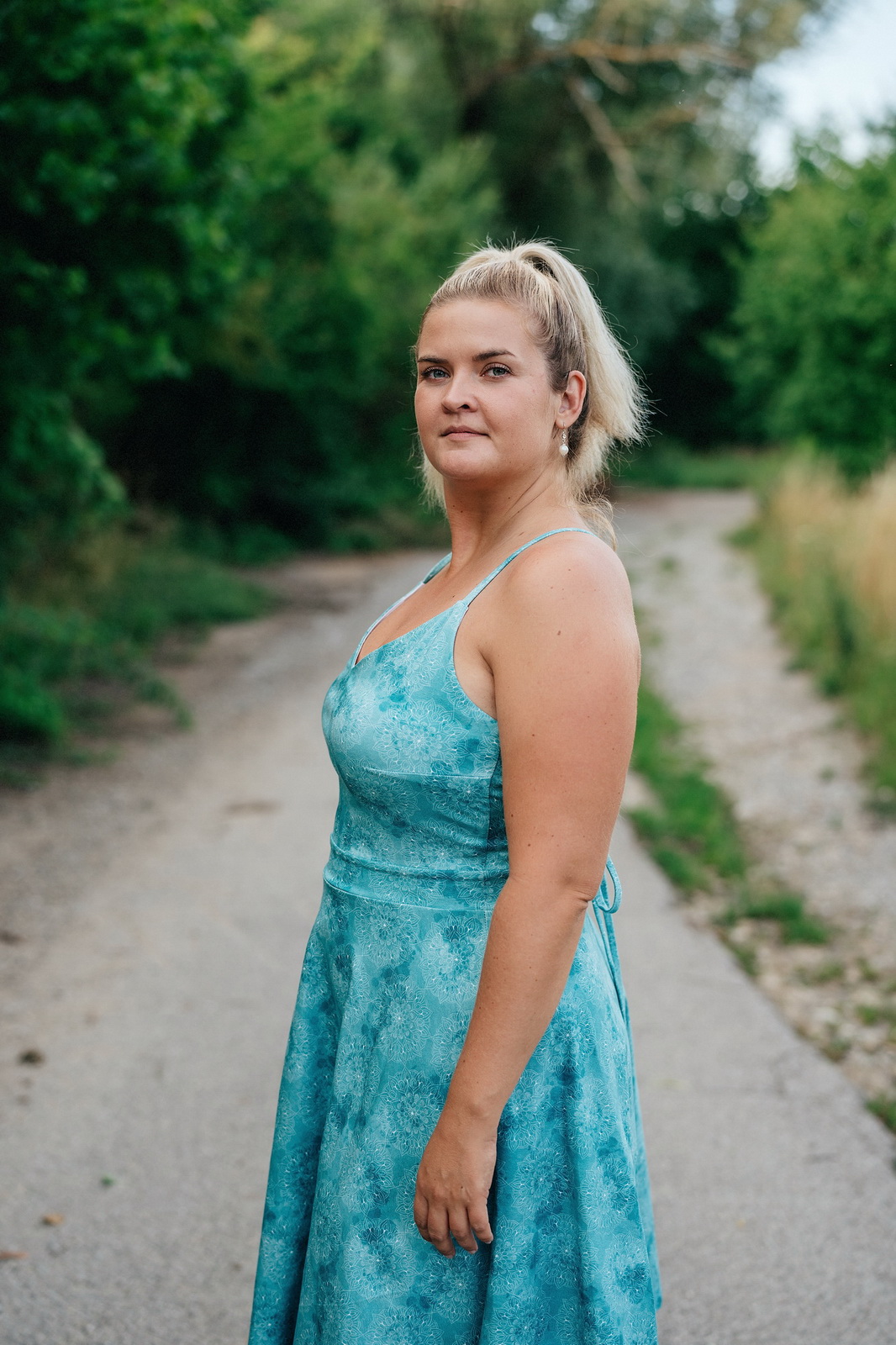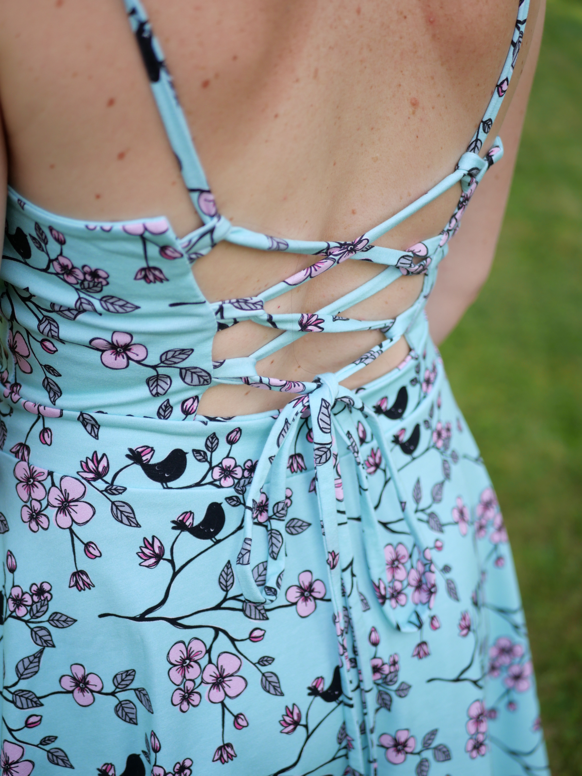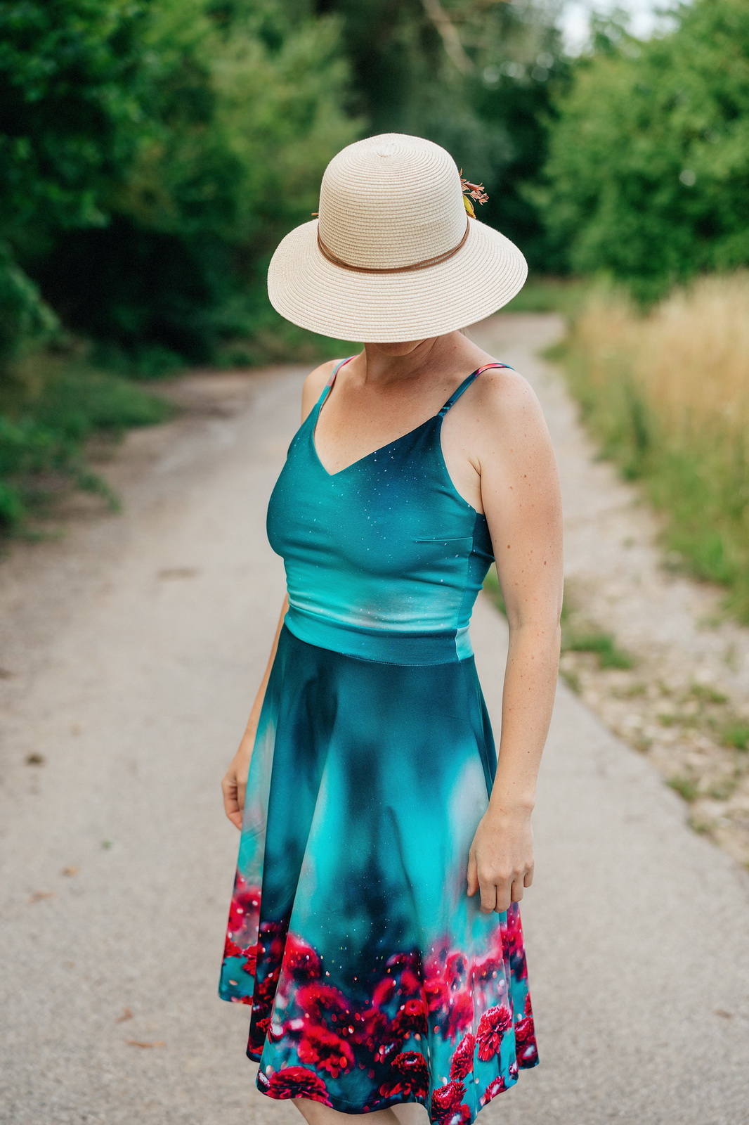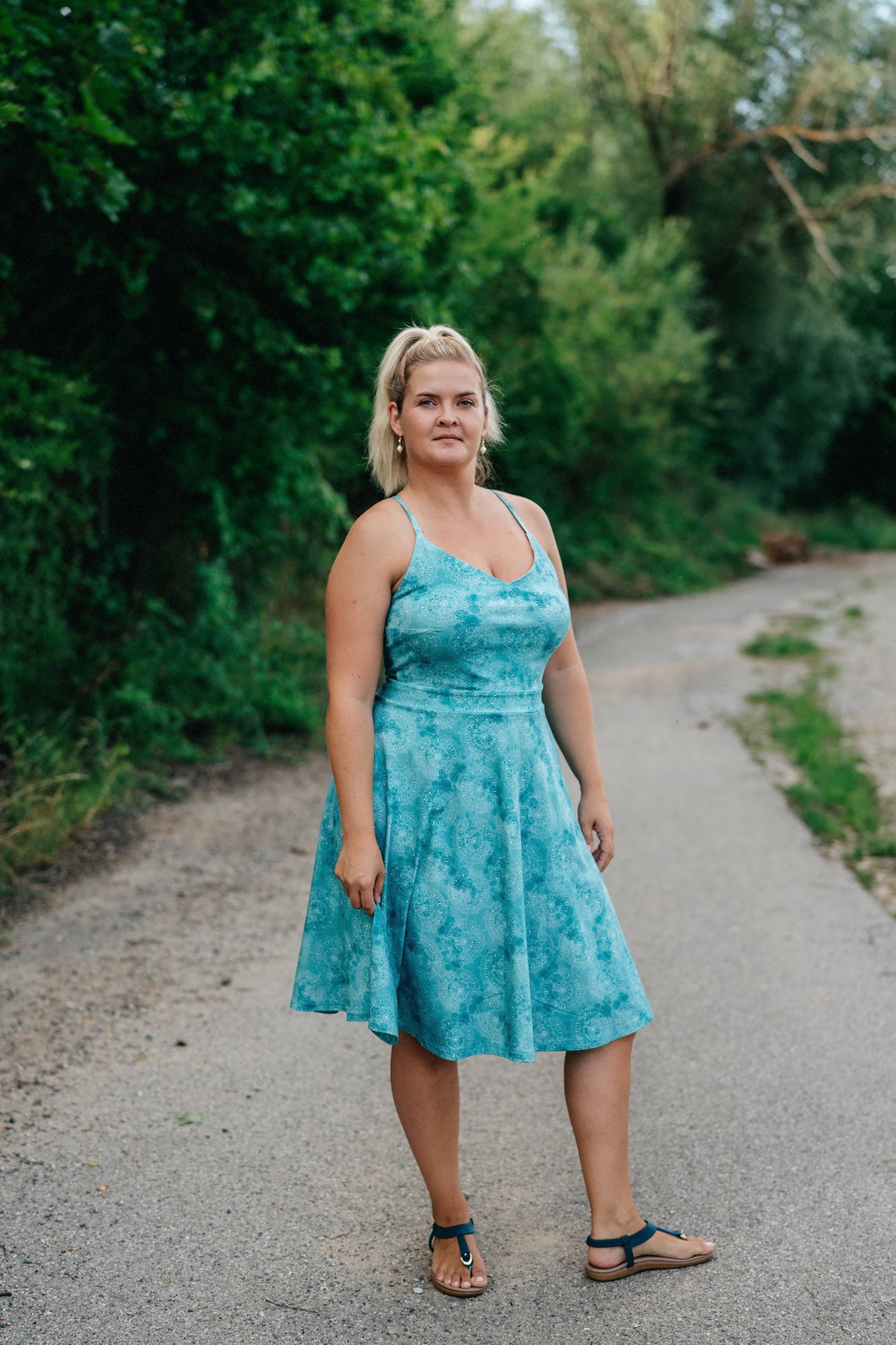 „Šití jsem se nejdřív bála, pač jsem si vymyslela jiná záda, ale do finále jsem nadšená. Podle návodu se opět šilo krásně a snadno. Protože bez podprsenky ani ránu 😅, zvolila jsem místo šněrování na zádech žabičkování a z toho důvodu i širší ramínka. Ráda nosím sukně nad kolena, takže moooc chválím zakreslení zkrácené verze sukně již ve střihu👏🏼. Na sukni jsem si dovolila ještě rozparek 😊.“