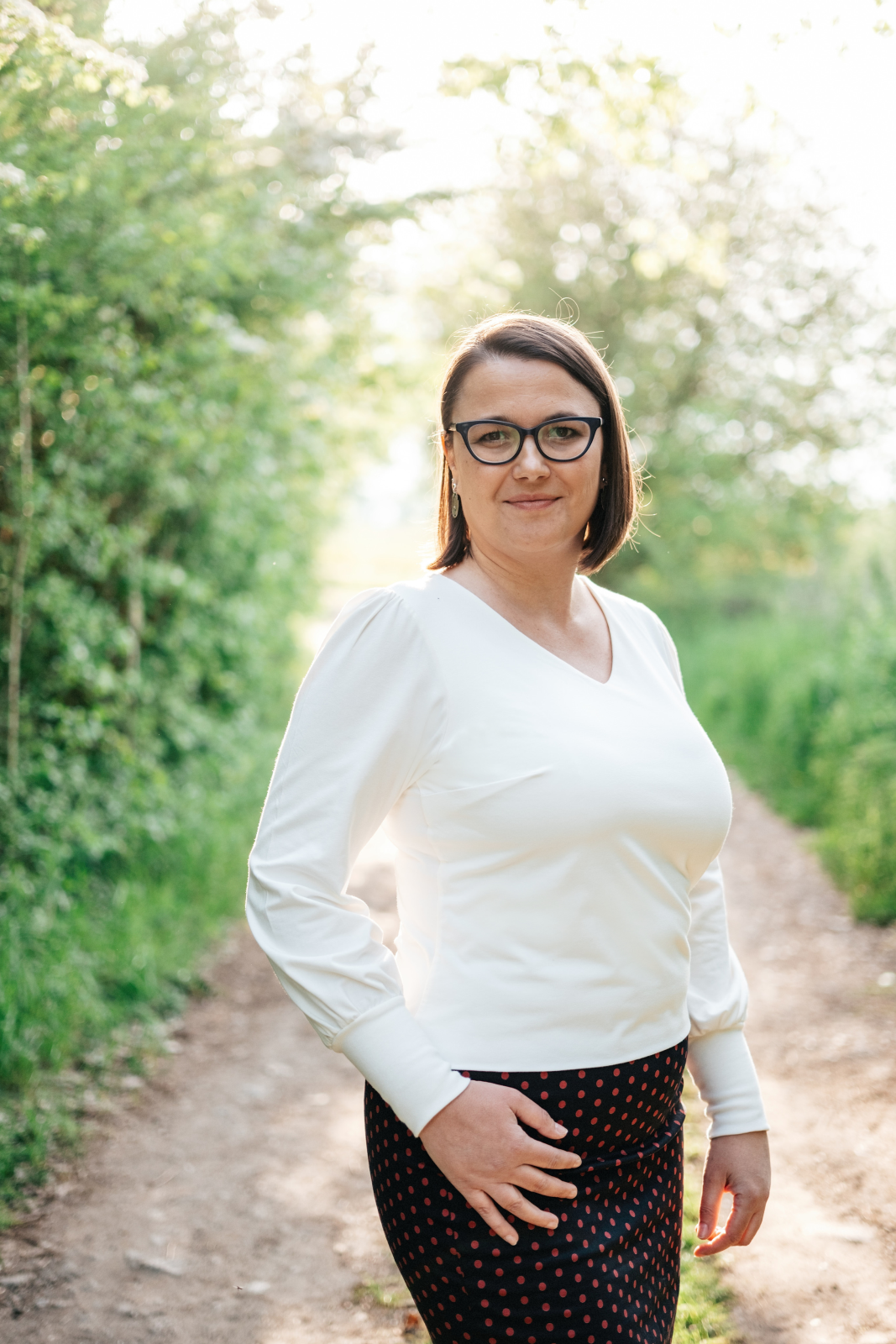 „Se střihem se pracovalo moc hezky. Vynechala jsem přeložku předního dílu a vypracovala vnitřní část předního dílu s délkou pouze pod prsa. Dost mě potrápilo sesazení předního a zadního dílu v náramenici. Manžetu bych příště střihla o malinko širší, aby nebyla tak upnutá. Délku jsme si o pár centimetrů protáhla.“
