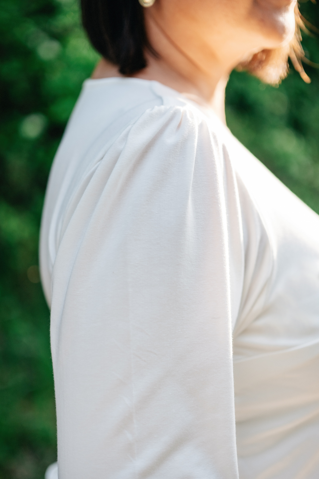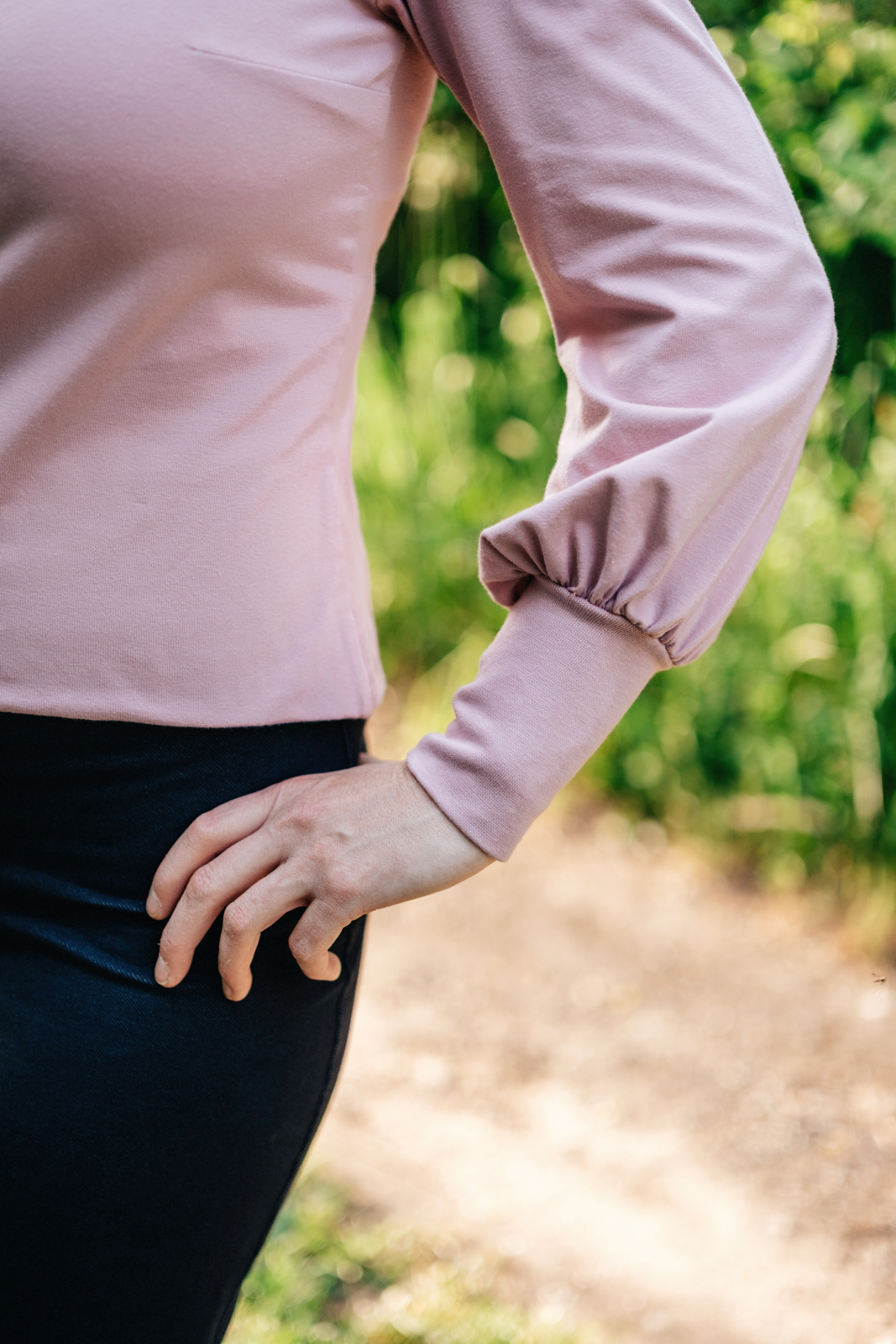 Rukávy jsou ztělesněním elegance – v ramenou jen decentně nařasené, dole naopak s výrazným nabíraným efektem do pružné manžety. Ta je dostatečně vysoká, aby rukávy při práci nebo jídle nepřekážely. Pro ještě luxusnější vzhled můžete úplet na rukávech nahradit jemným průhledným šifonem či jinou tkaninou.