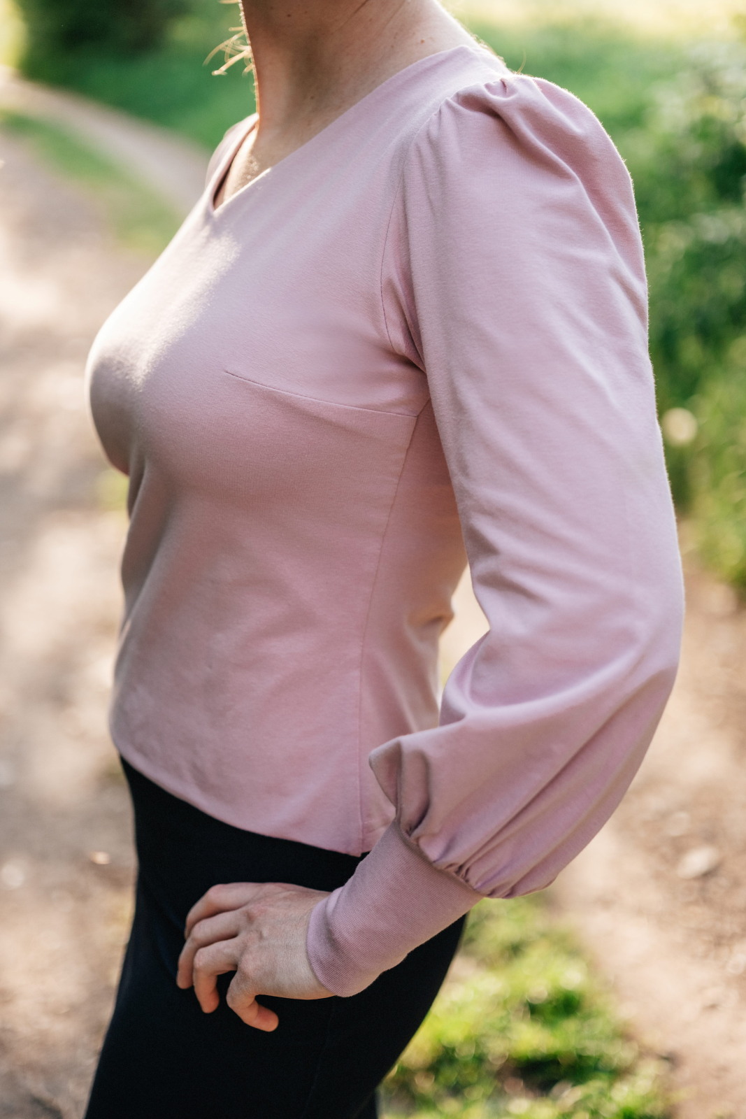 VD: "Se střihem se pracovalo moc hezky. Vynechala jsem přeložku předního dílu a vypracovala vnitřní část předního dílu s délkou pouze pod prsa. Dost mě potrápilo sesazení předního a zadního dílu v náramenici. Manžetu bych příště střihla o malinko širší, aby nebyla tak upnutá. Délku jsme si o pár centimetrů protáhla."