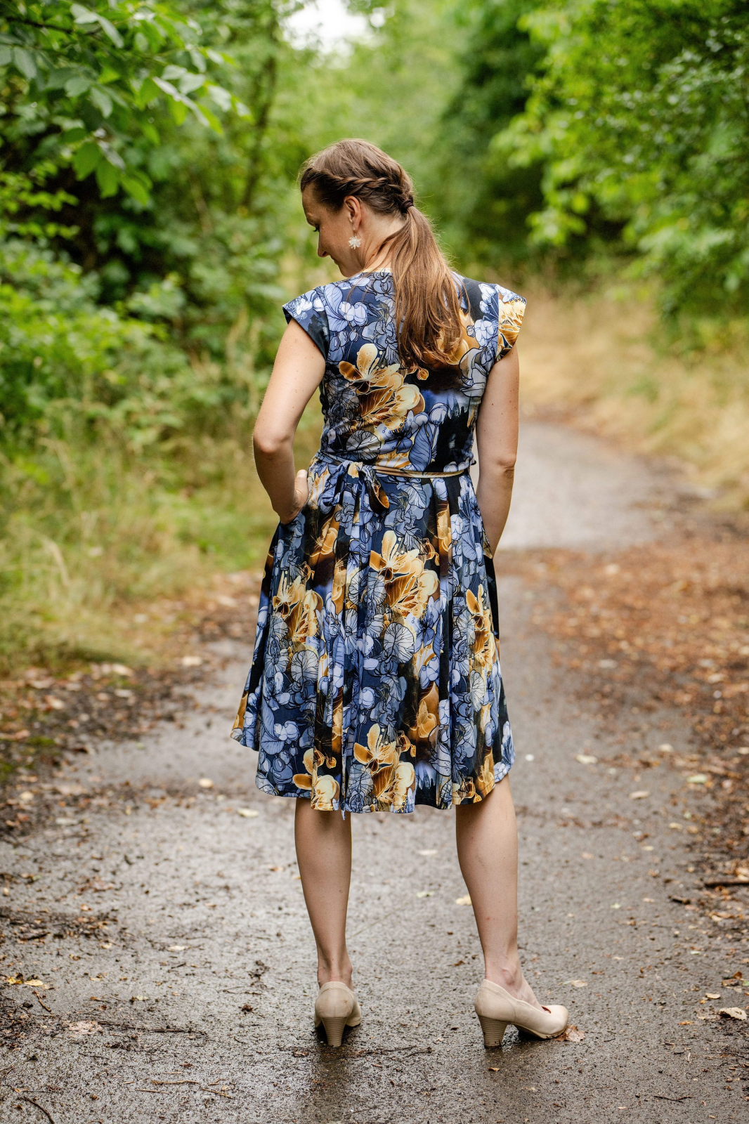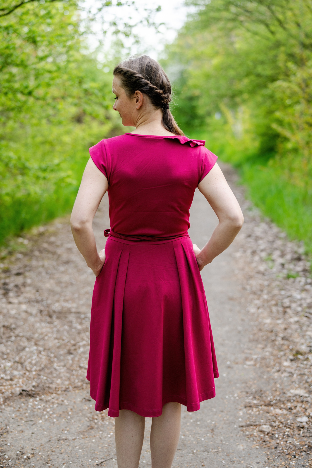 Šaty jsou zavinovací, proto je přední sukně rozdělena na spodní a vrchní, ty se přes sebe při oblékaní překryjí a v pase se šaty zavážou na vázačku. Díky tomu jsou velikostně úžasně variabilní. Sukně šatů je půlkolová se sklady v pase v zadním díle i v předním vrchním díle sukně, tam sklady navazují na sklady v živůtku. Sukně je proto rozevlátá a ideálně bohatá. Přední spodní sukně sklady nemá. Do bočních švů šatů jsme ukryly kapsy, bez nich by to přece nešlo!