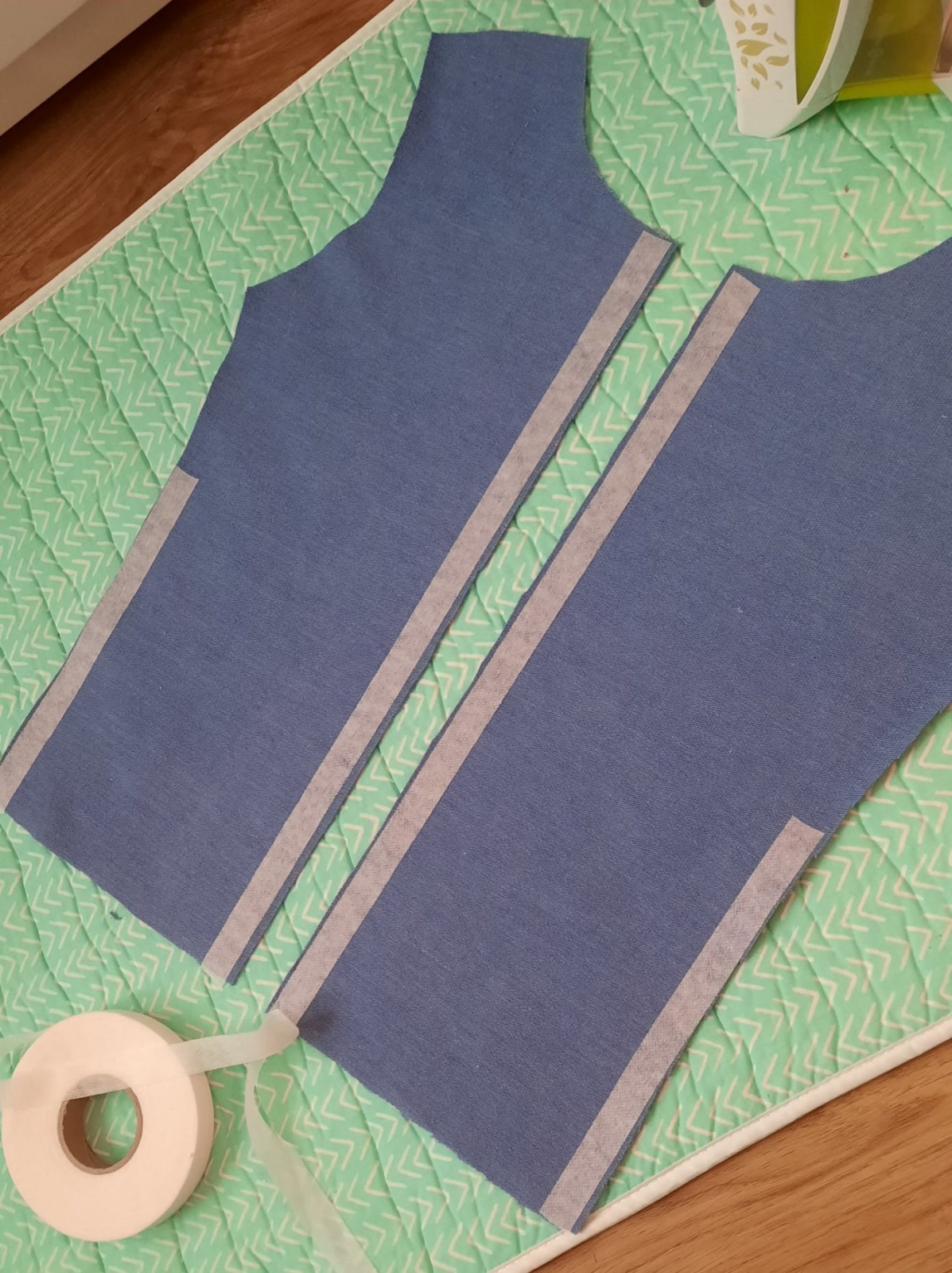 vlizelínový proužek nažehlím na přední díl na vstupy kapes a na přední kraj, kde bude všitý zip