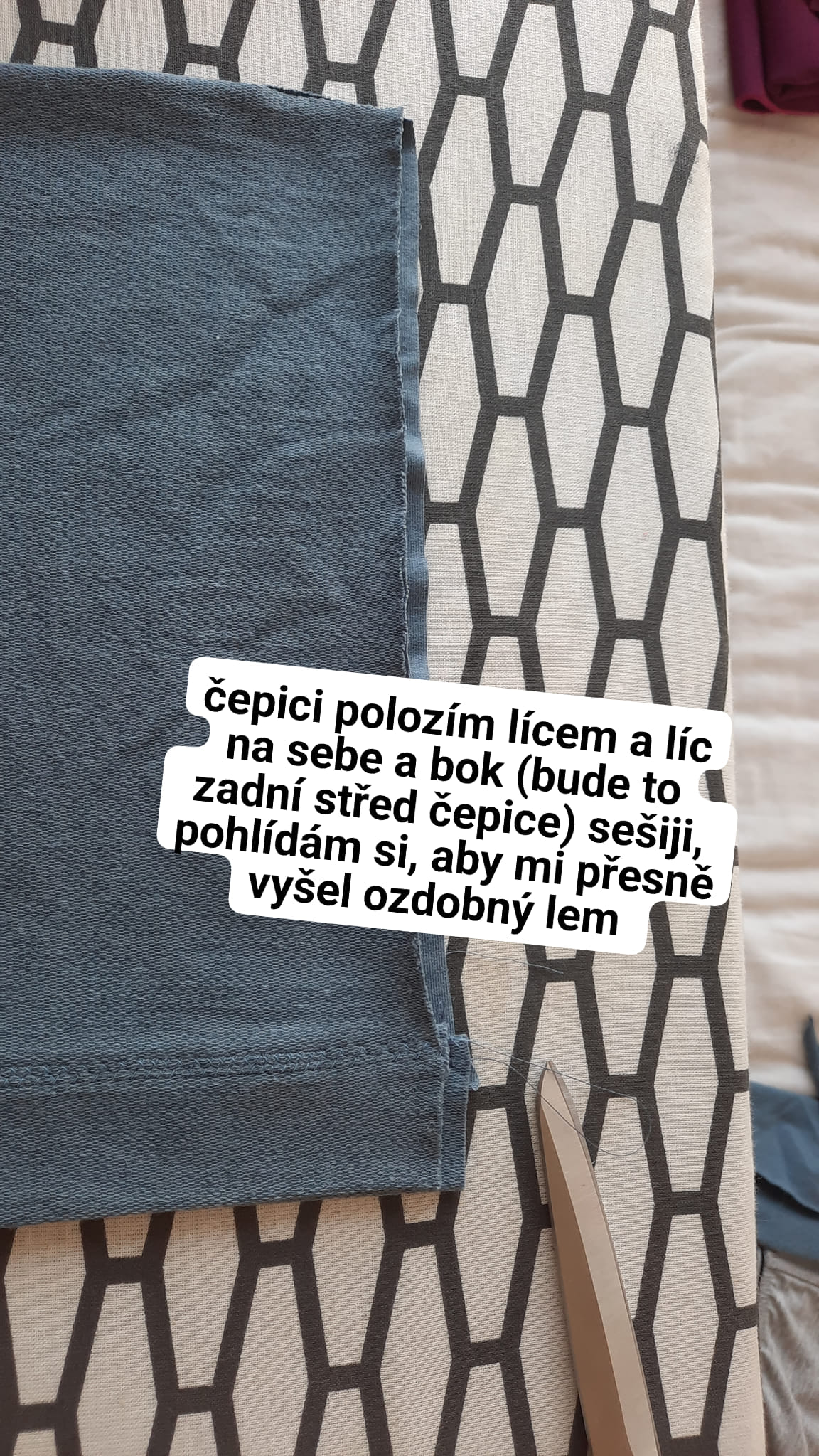 Následně čepici položím lícem na líc na sebe a bok (tedy zadní střed čepice) sešiji. Je důležité si přesně ohlídat návaznost ozdobného lemu.