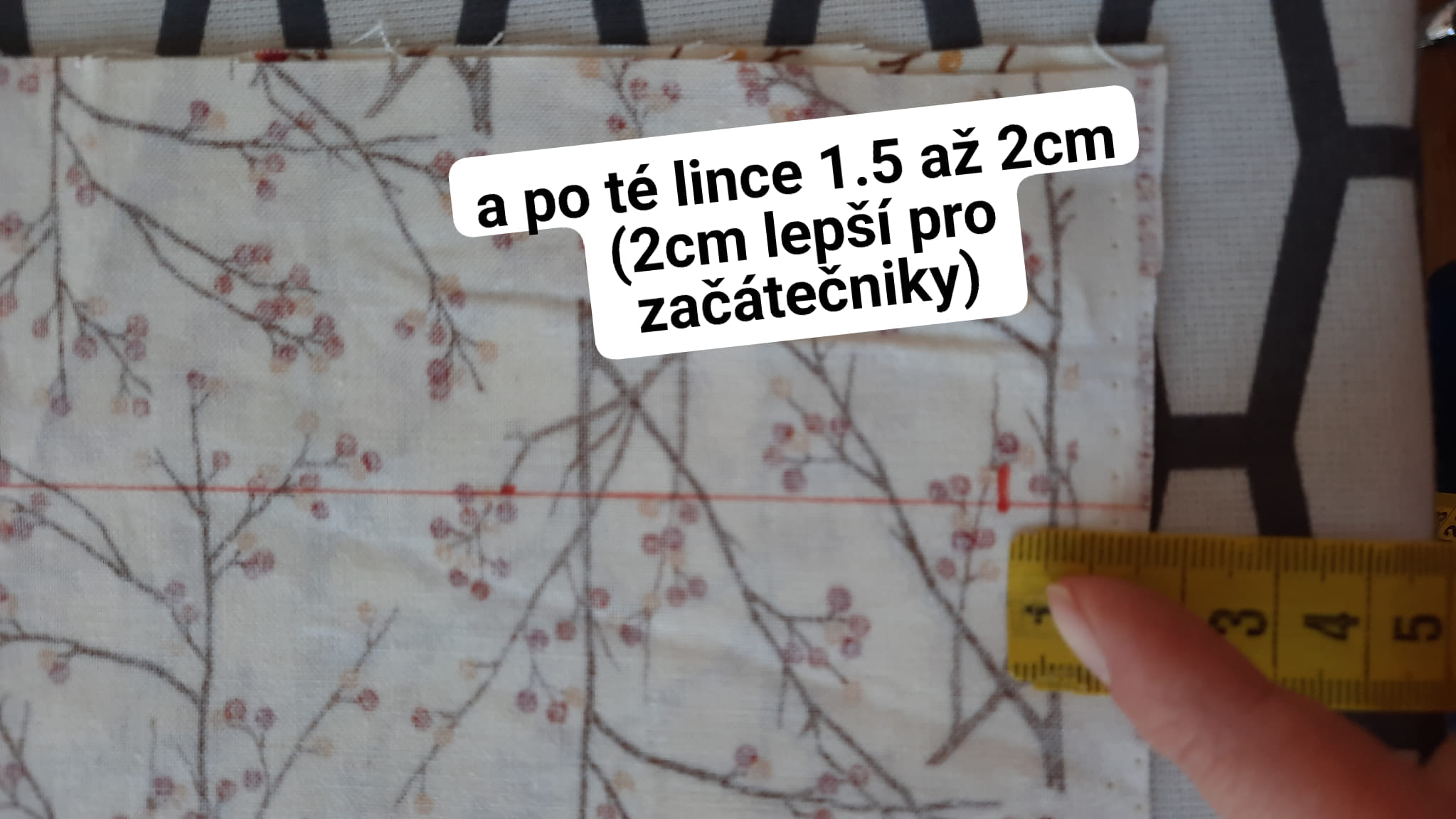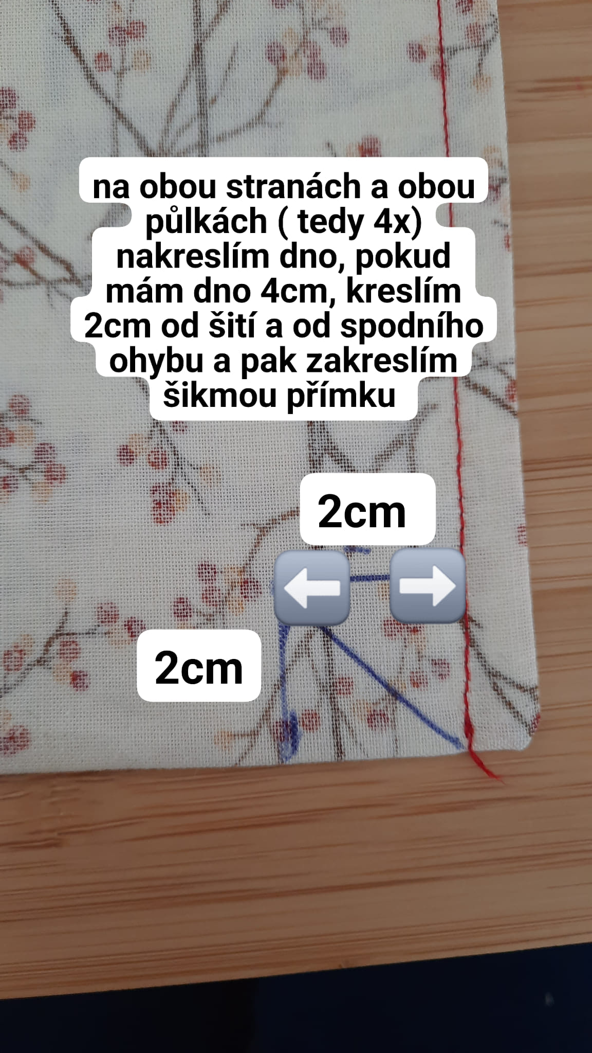 Od vzniklého kraje si na obou stranách i obou půlkách sáčku naměřím dno. Pokud jsem volila 5 cm, naměřím vždy 2,5 cm, pokud 4 cm, naměřím 2 cm.