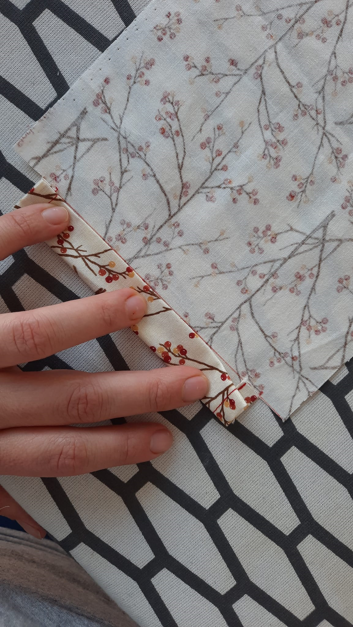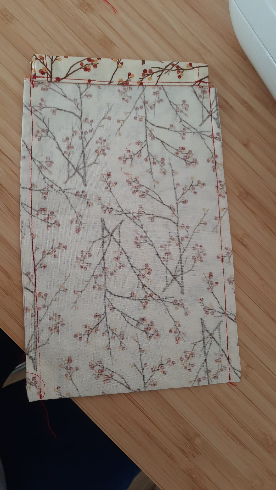 Roztáhnu sáček od sebe a složím jej po kosé lince. Po rovné vrchní linii ho se zapošitím prošiji. Tím vznikne dno.